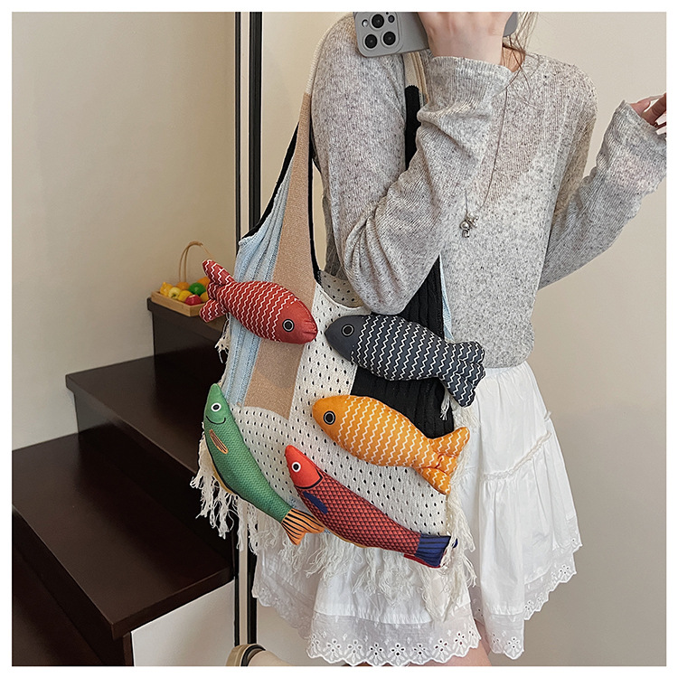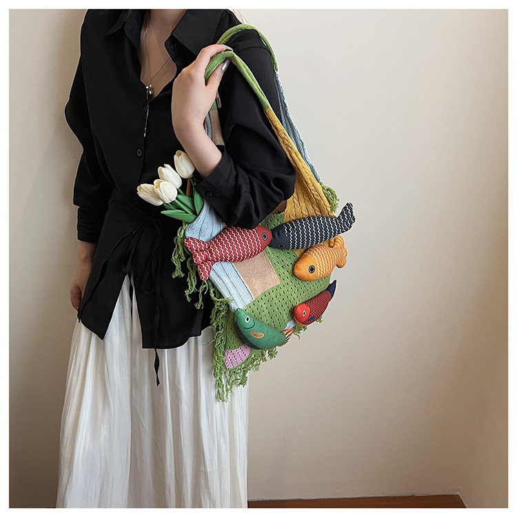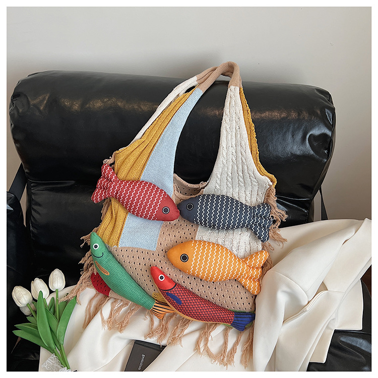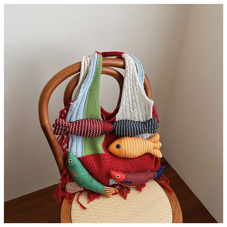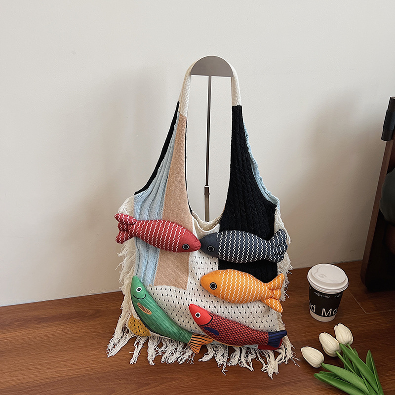 태슬 스티치 문학적이고 다재다능한 울 니트 백 복고풍 민족 스타일 멀티 피쉬 니트 대용량 숄더 토트 백