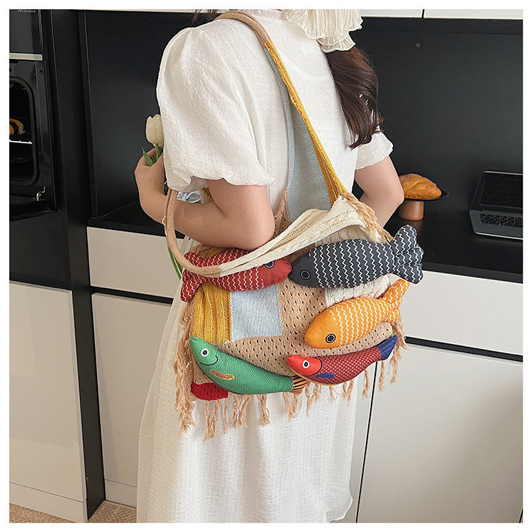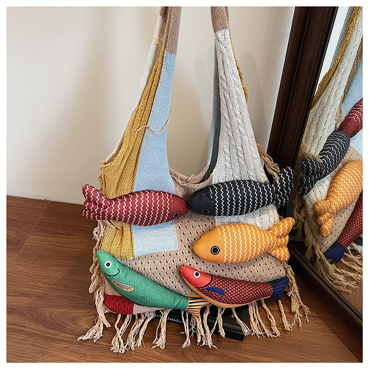 태슬 스티치 문학적이고 다재다능한 울 니트 백 복고풍 민족 스타일 멀티 피쉬 니트 대용량 숄더 토트 백스토어 가기