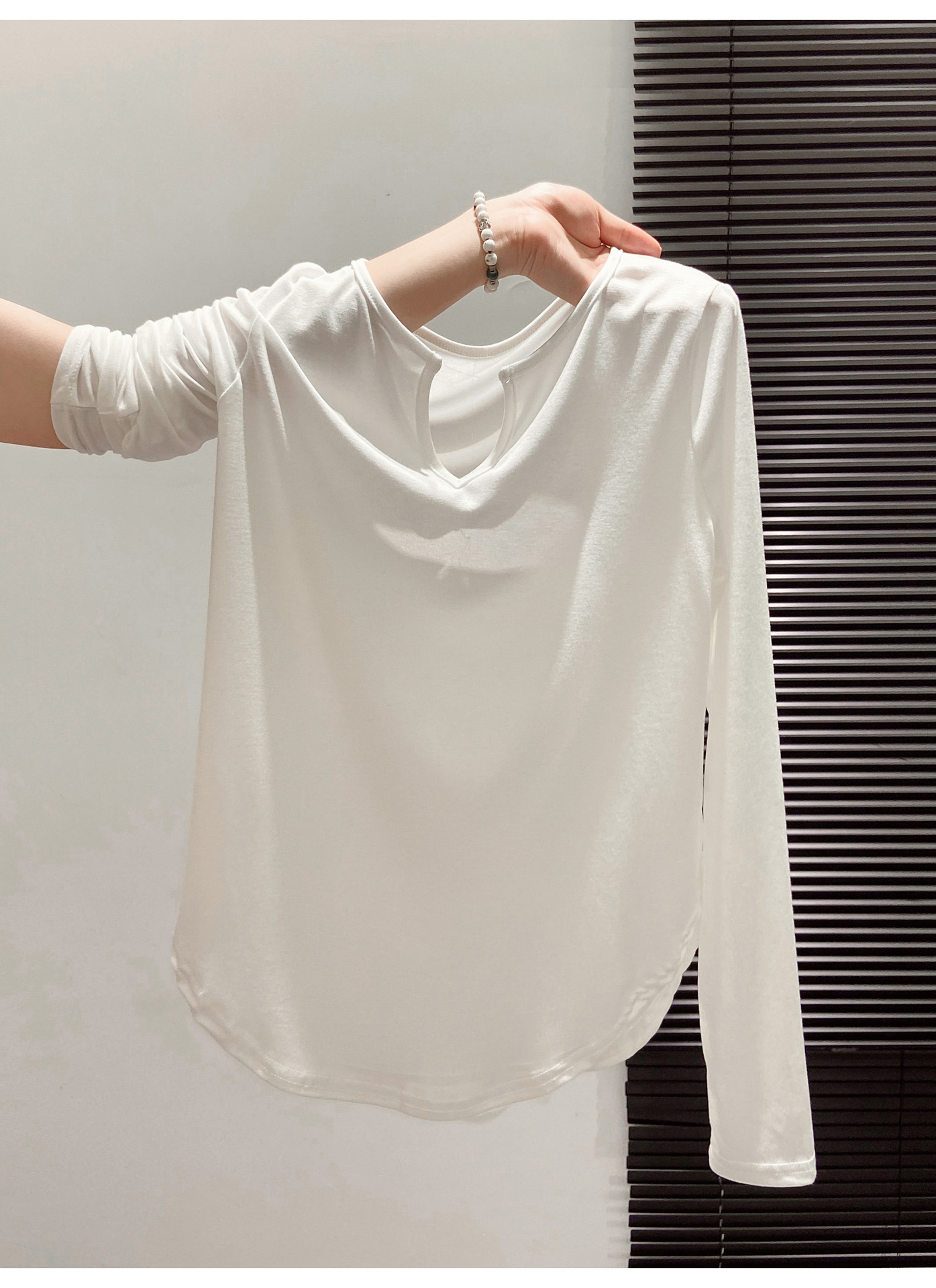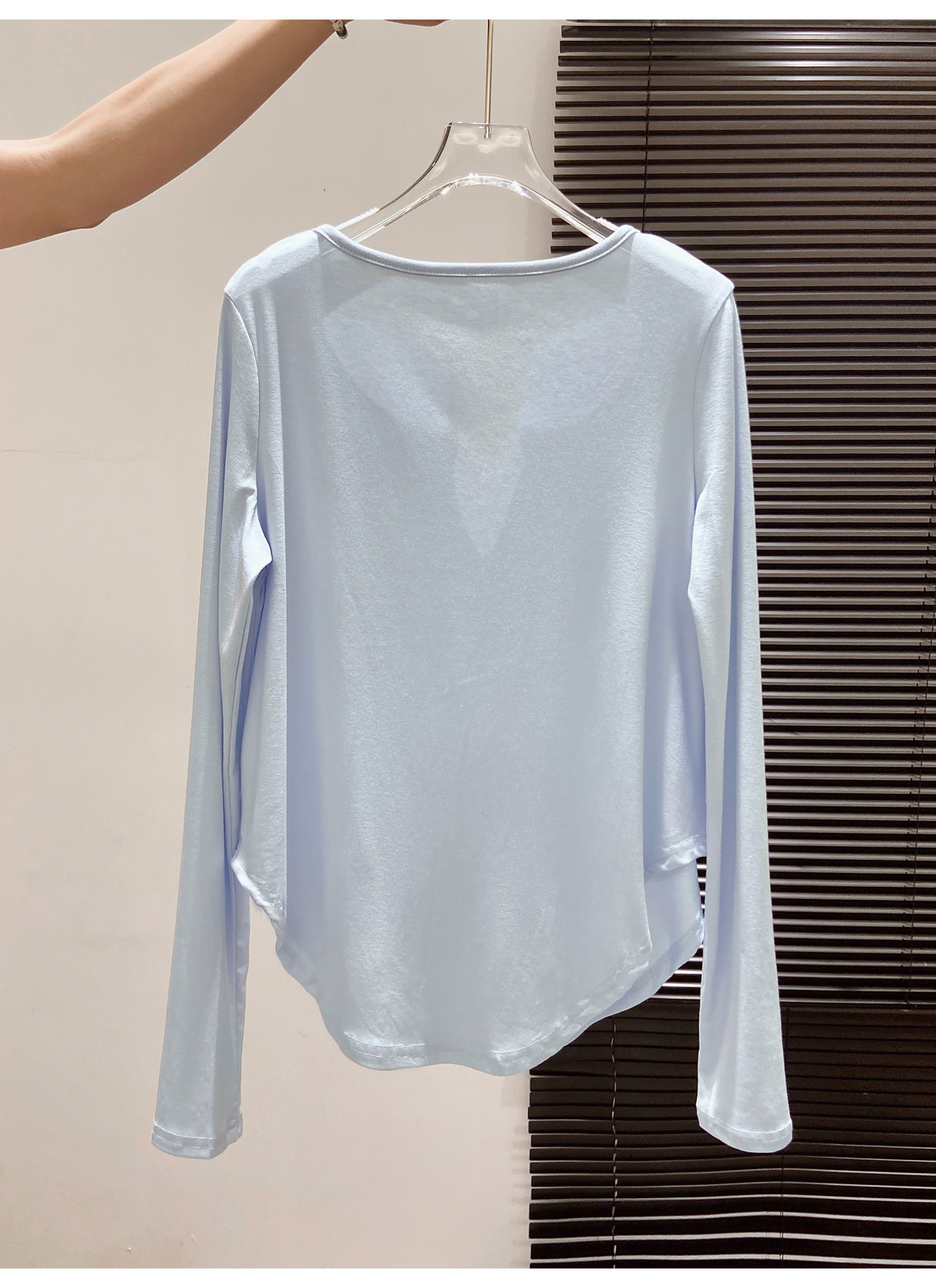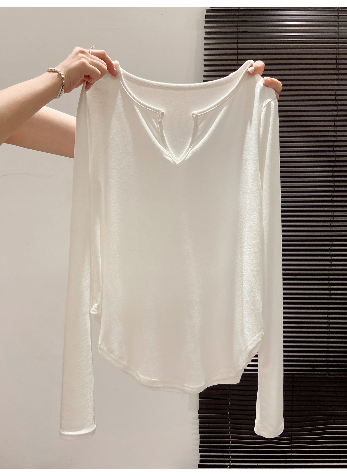 살을 커버해주는 곡선형 밑단, 브이넥 긴팔티셔츠, 여성용 여름 오른쪽 어깨 자외선 차단 블라우스, 루즈한 에어컨 셔츠, 하의탑