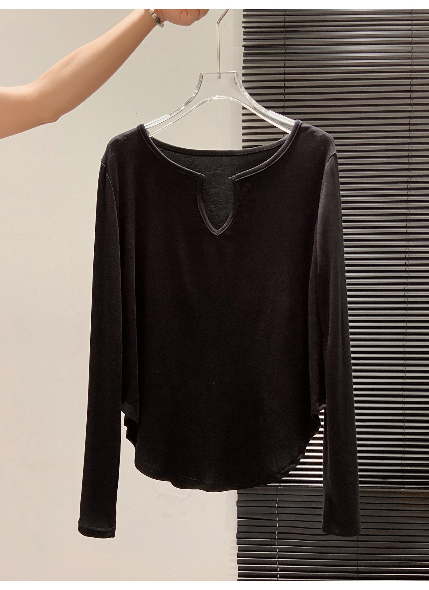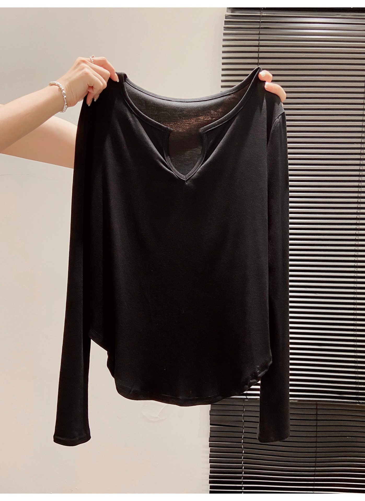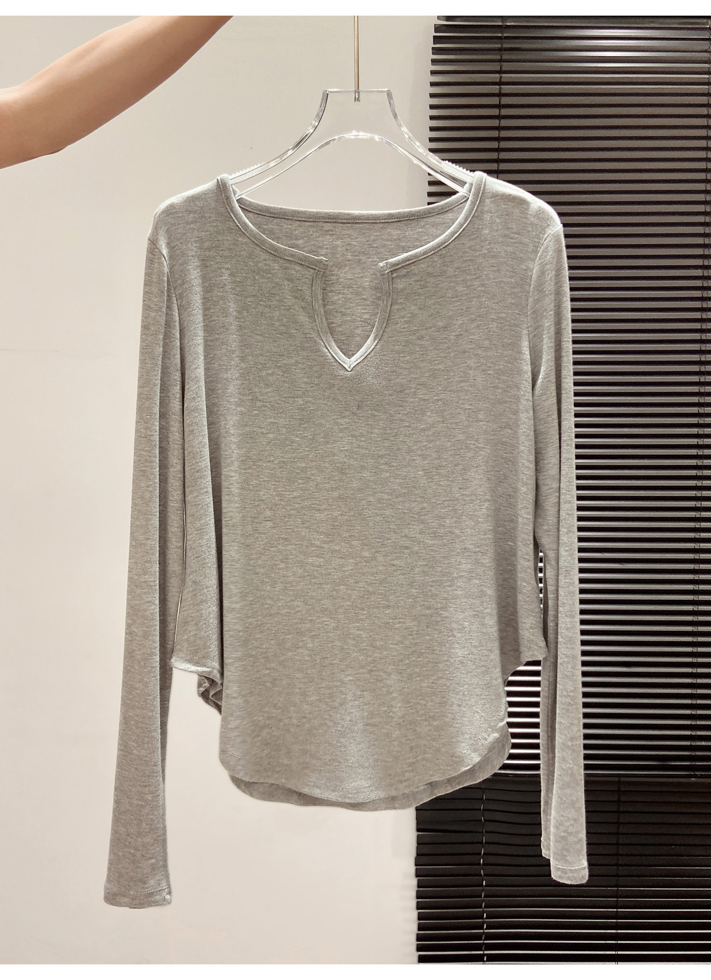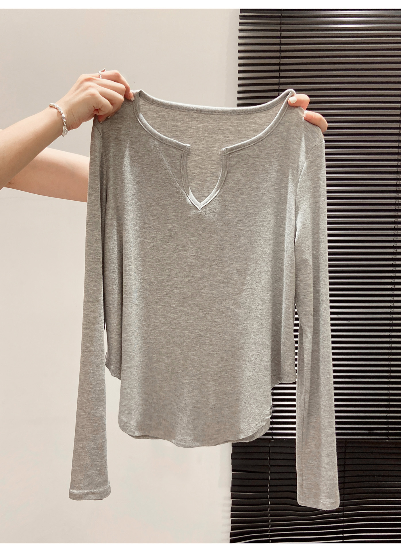 살을 커버해주는 곡선형 밑단, 브이넥 긴팔티셔츠, 여성용 여름 오른쪽 어깨 자외선 차단 블라우스, 루즈한 에어컨 셔츠, 하의탑