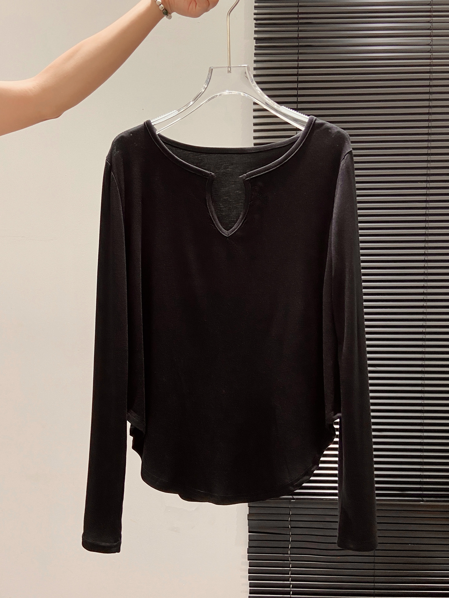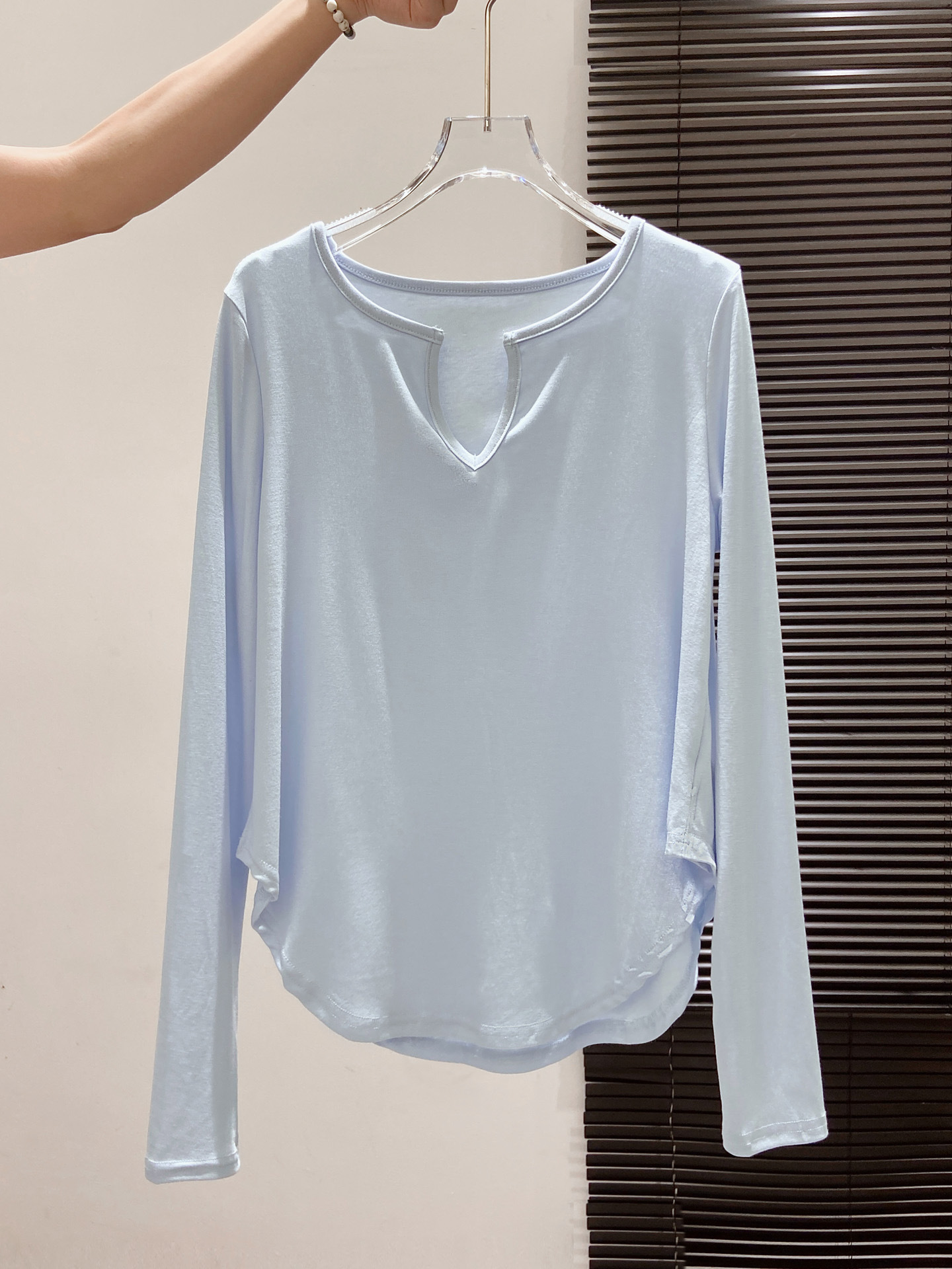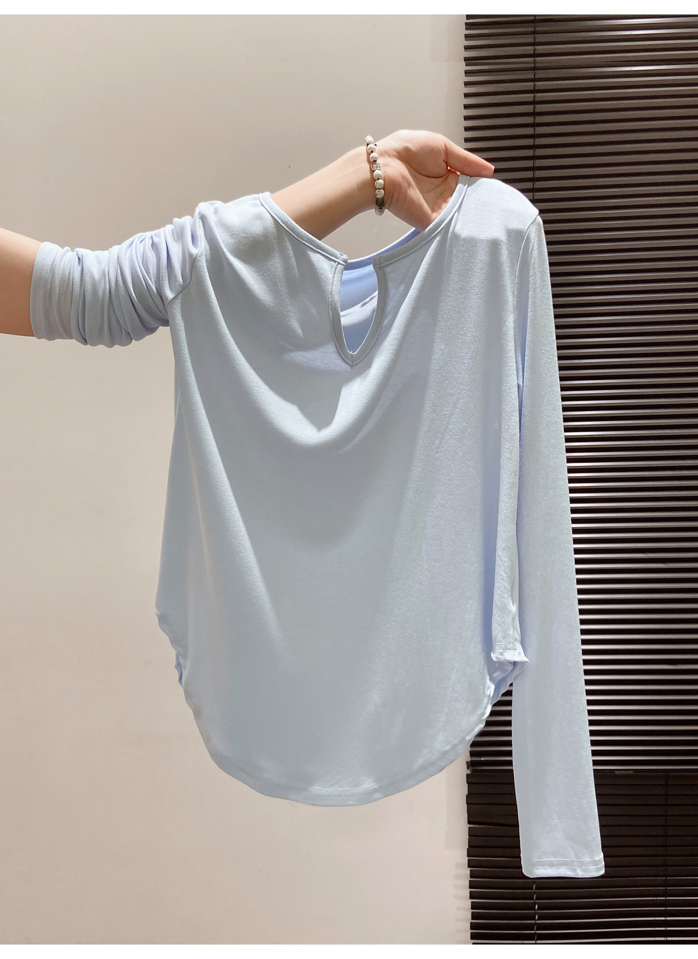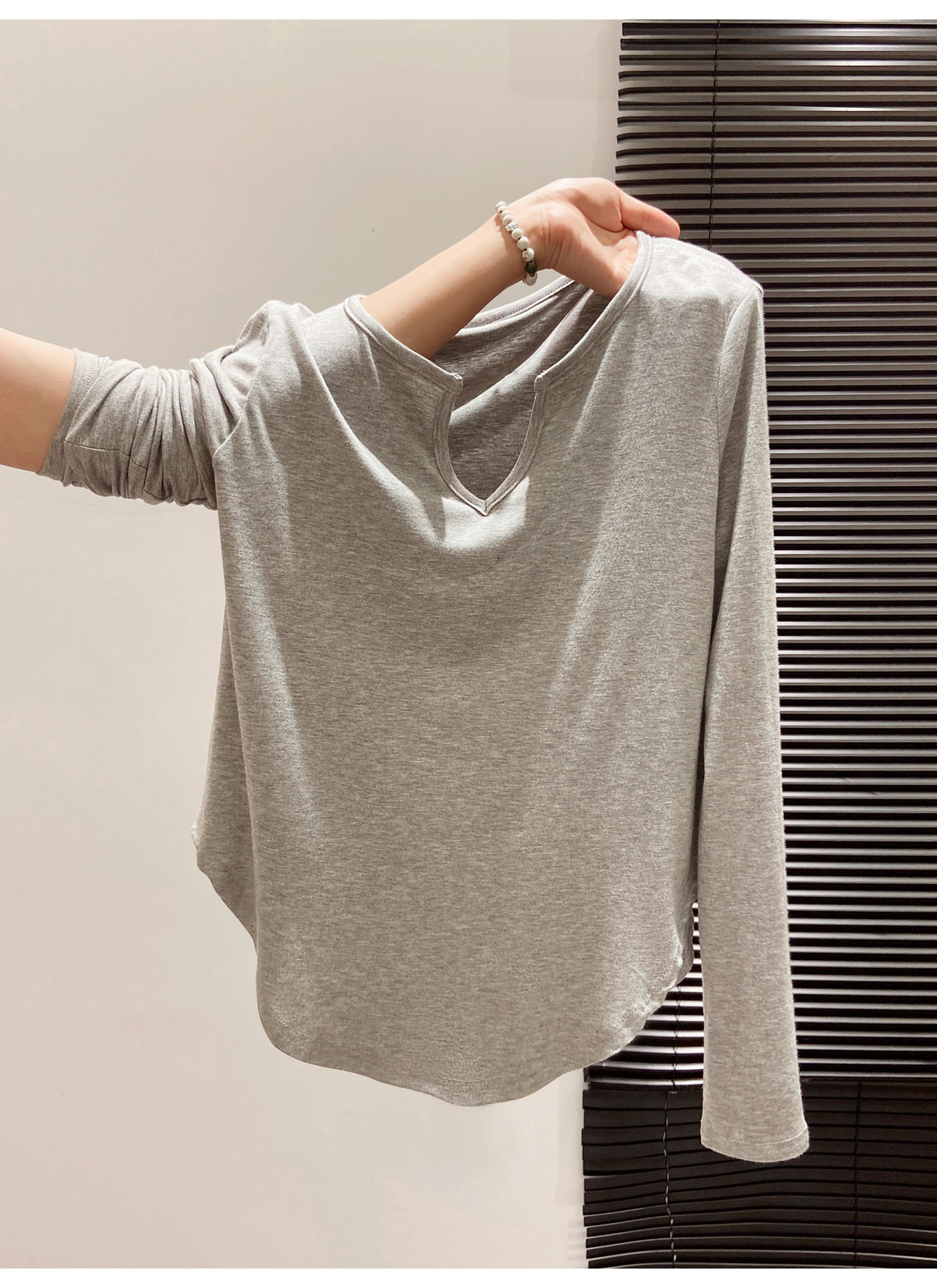 살을 커버해주는 곡선형 밑단, 브이넥 긴팔티셔츠, 여성용 여름 오른쪽 어깨 자외선 차단 블라우스, 루즈한 에어컨 셔츠, 하의탑스토어 가기