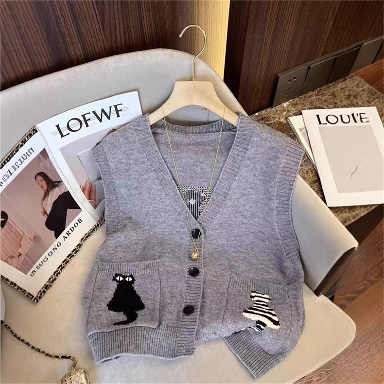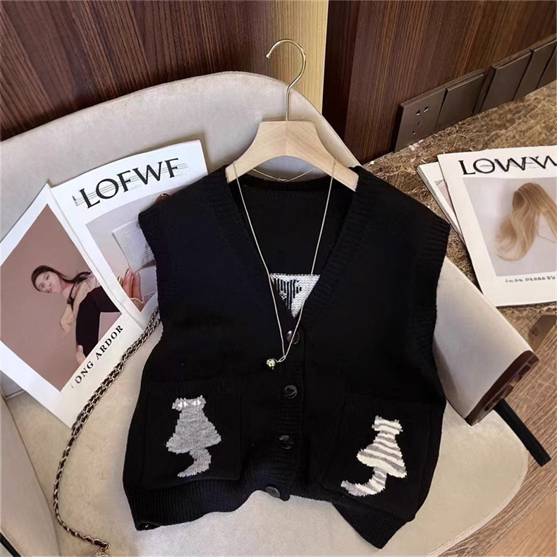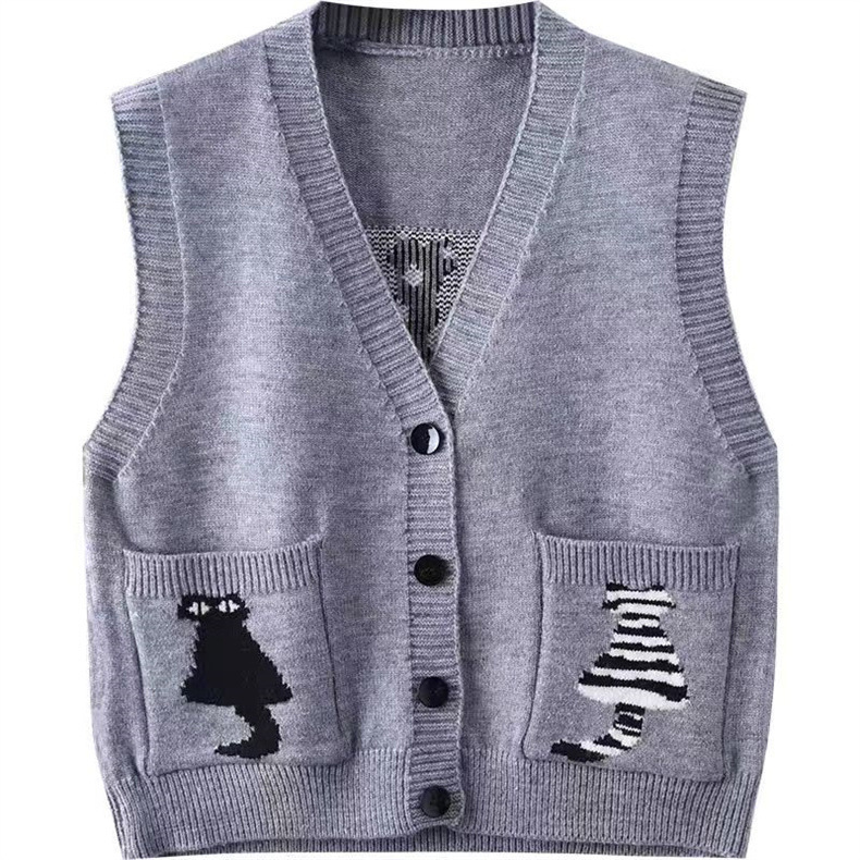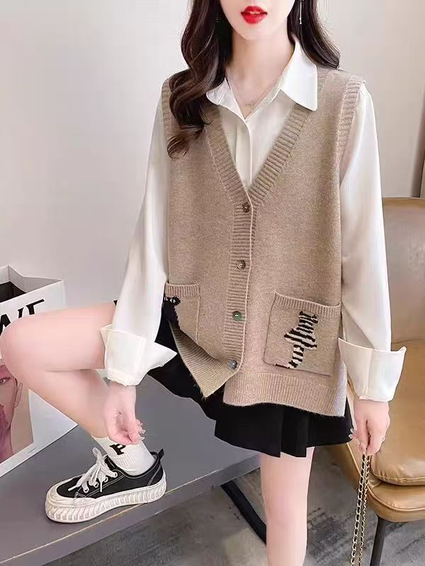 여성을 위한 패셔너블한 브이넥 조끼, 스타일리시한 봄, 가을 새로운 한국식 싱글 브레스트 포켓 루즈한 민소매 스웨터 조끼스토어 가기