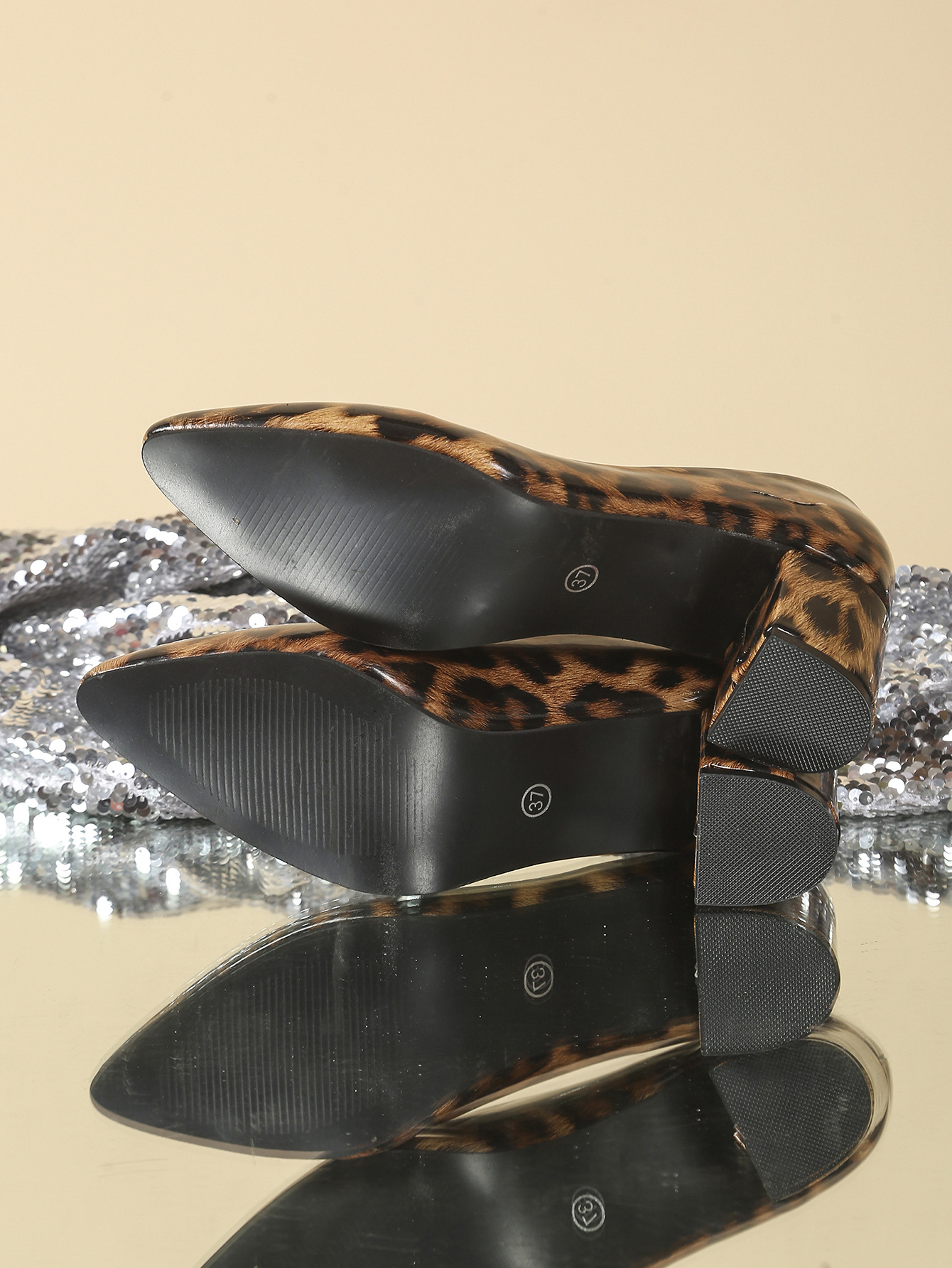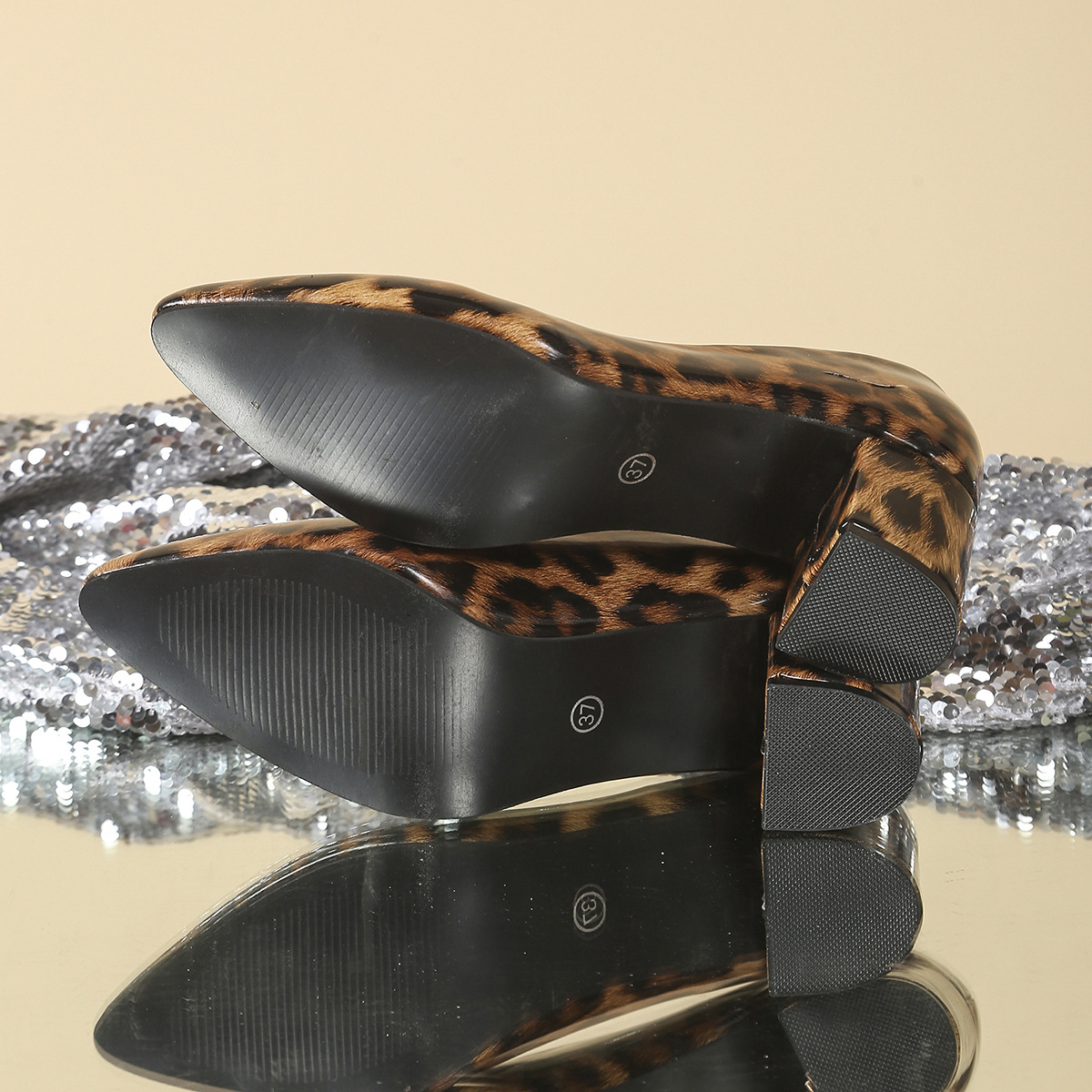 유럽과 미국의 대형 하이힐 여성 클래식 뾰족한 두꺼운 하이힐 섹시한 레오파드 프린트 특허 가죽 연회 파티 신발