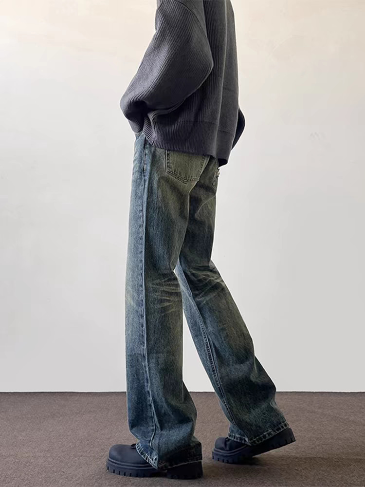 아메리칸 레트로 워싱 디스트레스드 청바지 남성 하이 스트리트 바이브 트렌디 스트레이트 레그 마이크로 플레어 슬리밍 클린핏 롱 팬츠