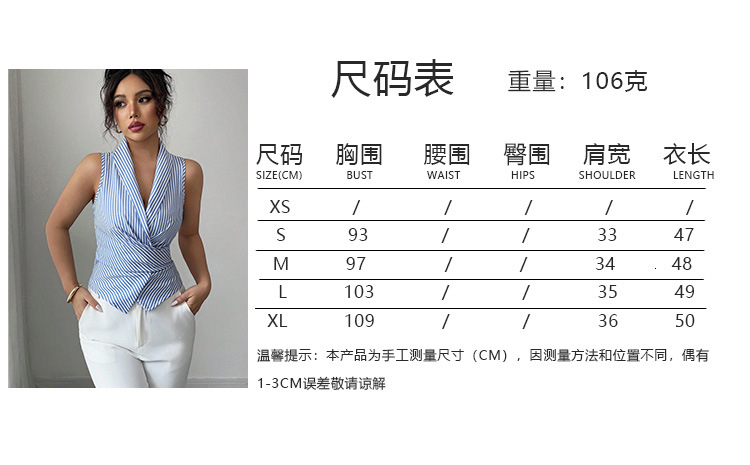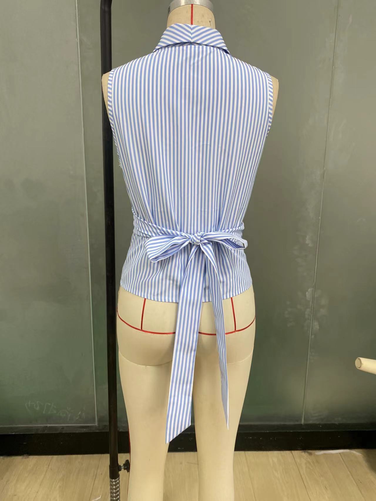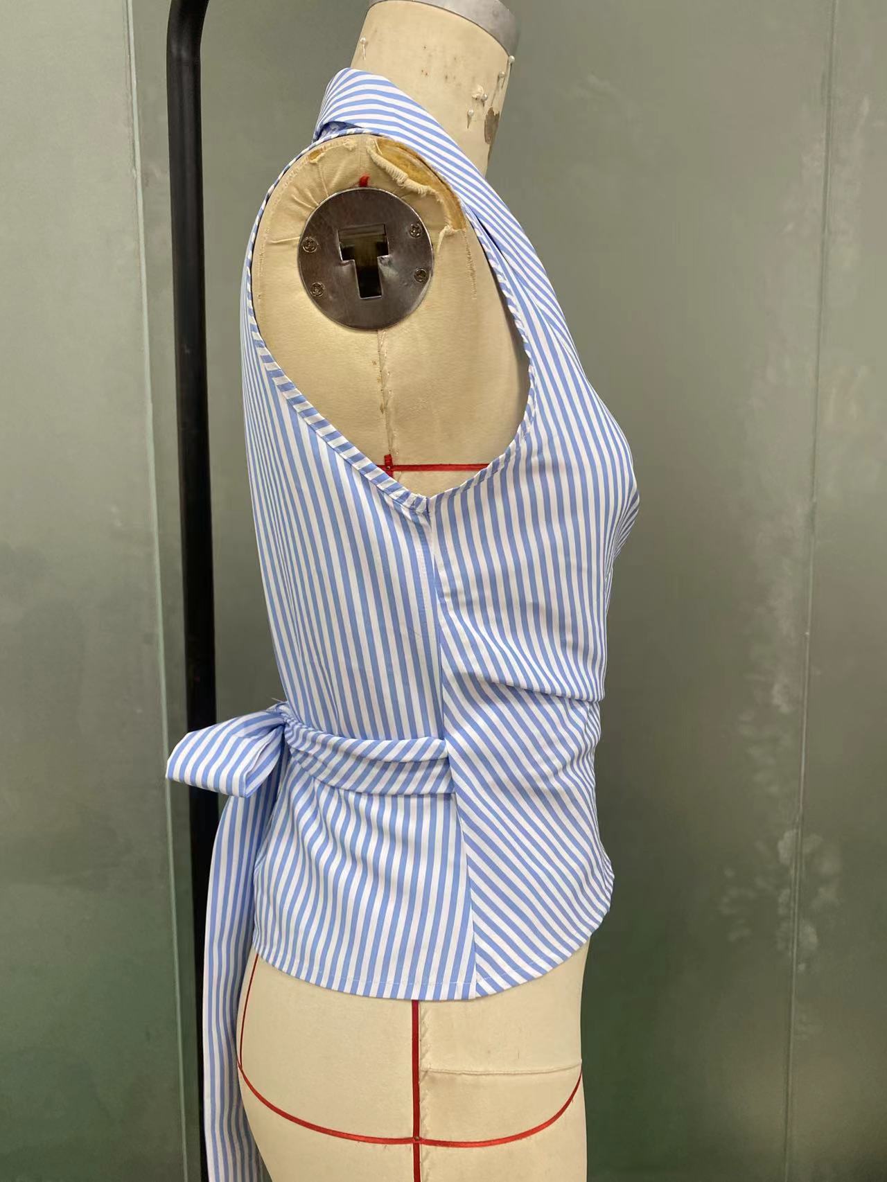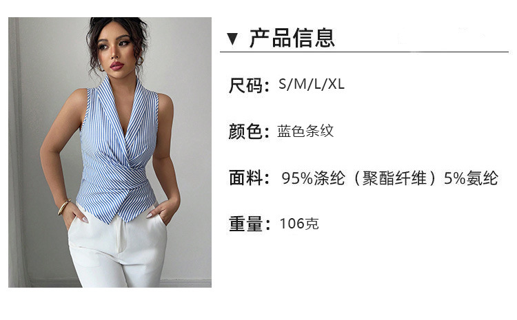2025 유럽과 미국 스타일의 여름 새로운 스타일 유럽과 미국의 줄무늬 민소매 셔츠 스트랩 허리 슬리밍 조끼 셔츠 여성 의류스토어 가기