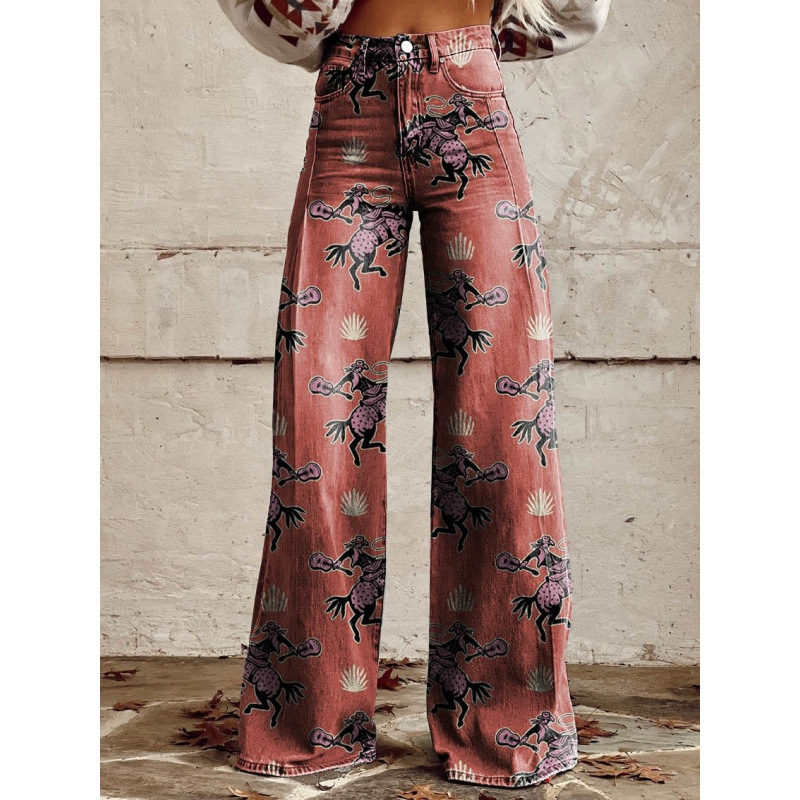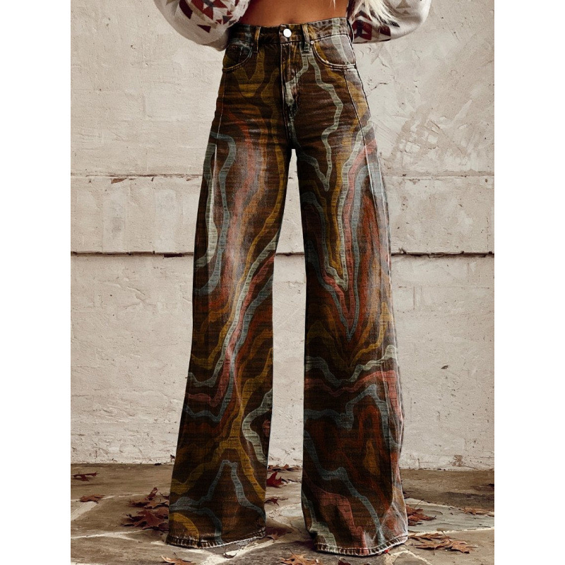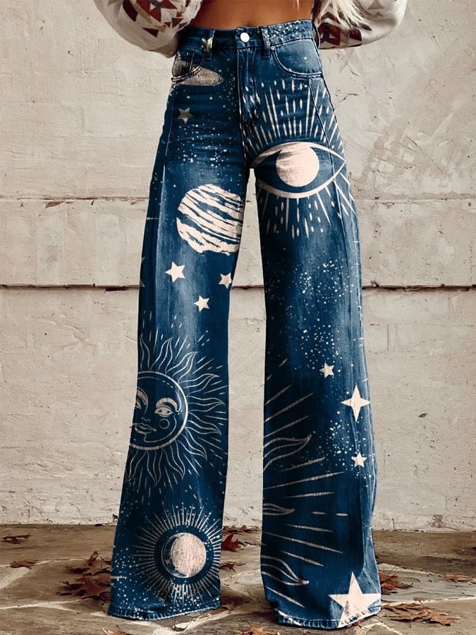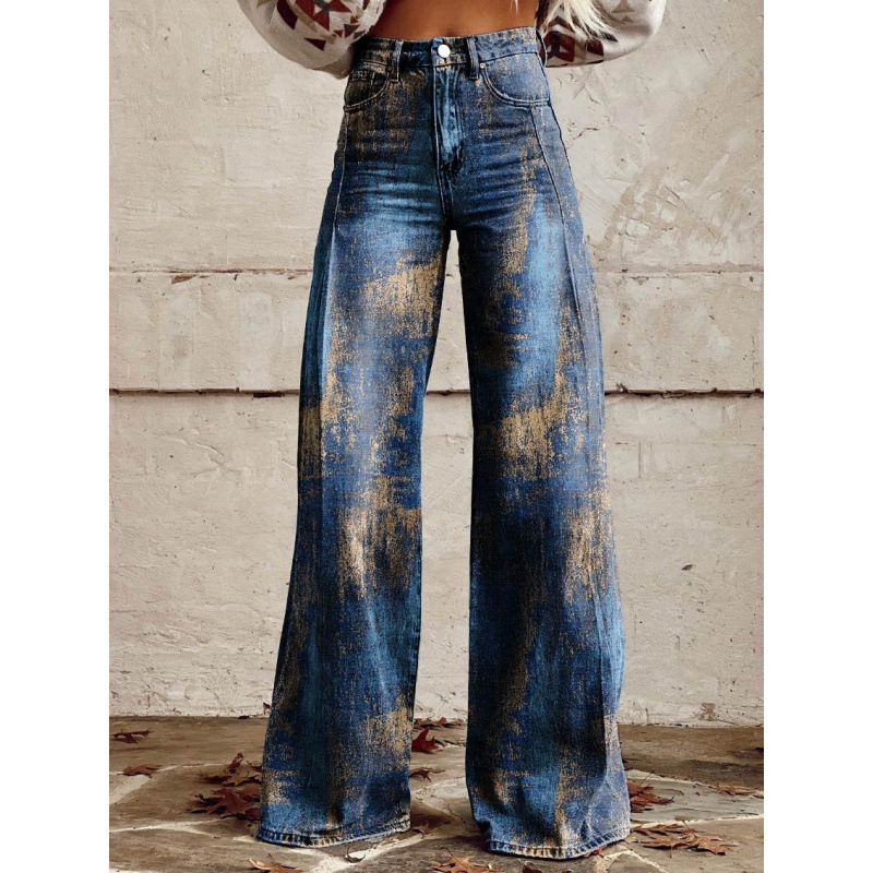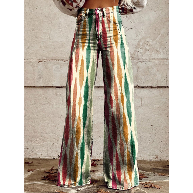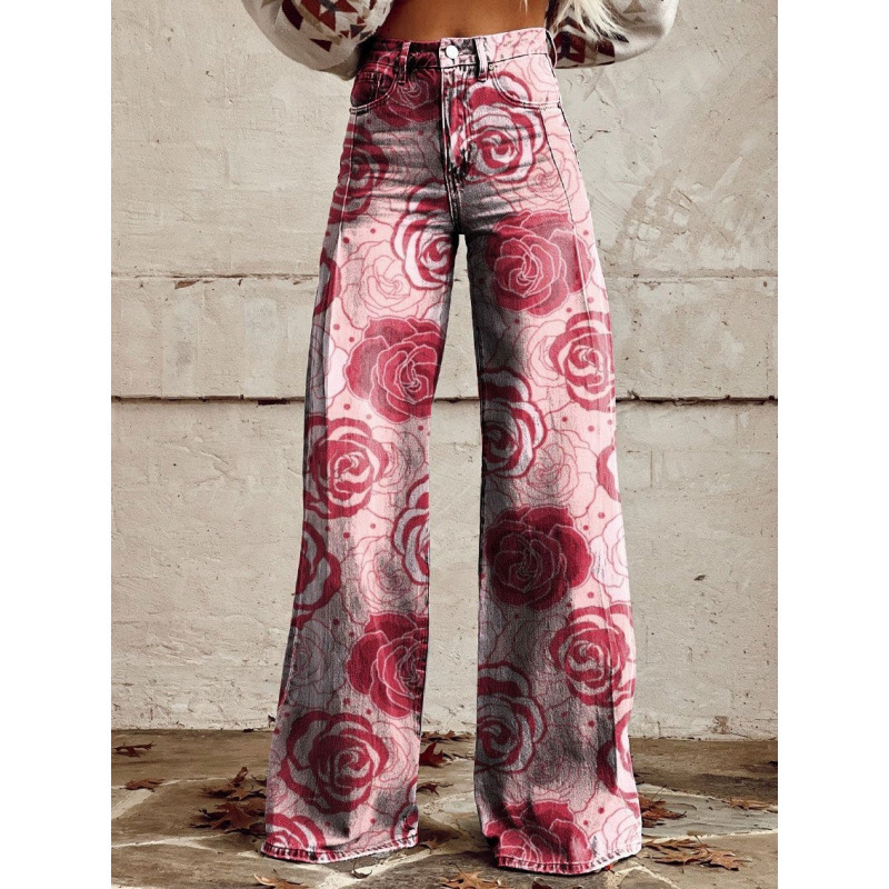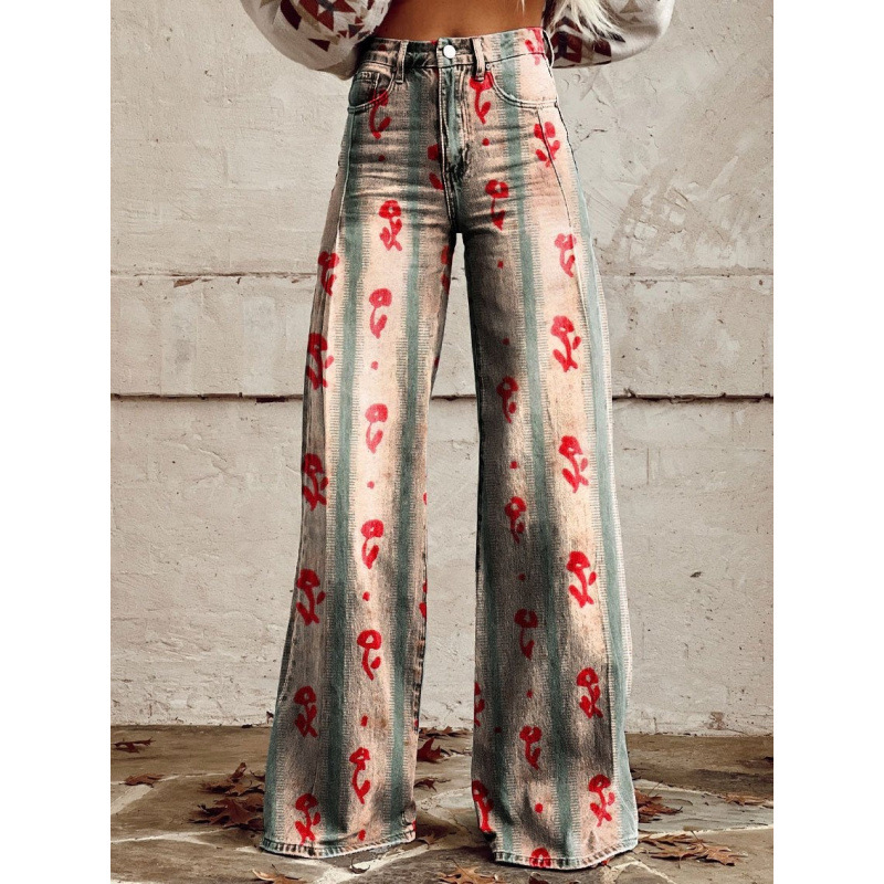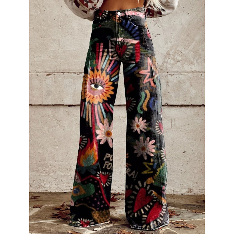 이베이 유럽과 미국 대외 무역 플러스 사이즈 여성 캐주얼 바지 트렌디 모조 청바지 와이드 레그 디지털 프린트 능직 바지스토어 가기
