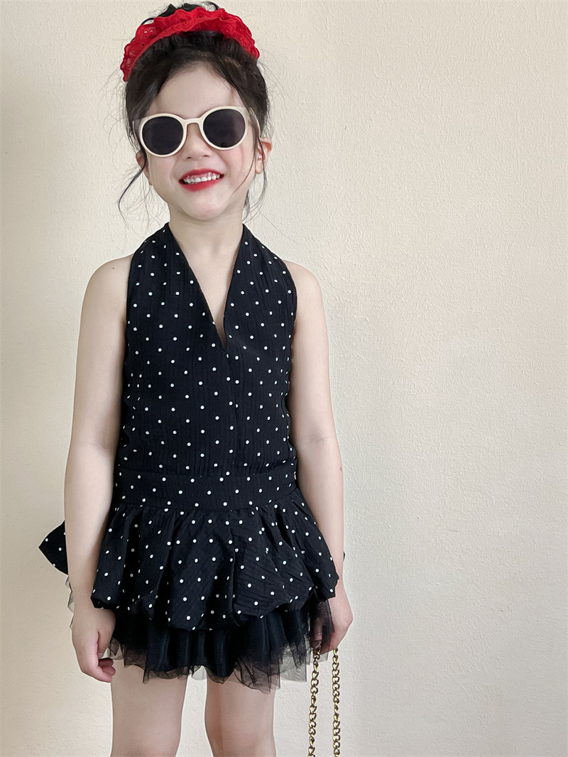 2025 새로운 여름 한국 스타일 아동복 소녀 홍콩 스타일 홀터 탑 폴카 도트 서스펜더 복고풍 거즈 스커트스토어 가기