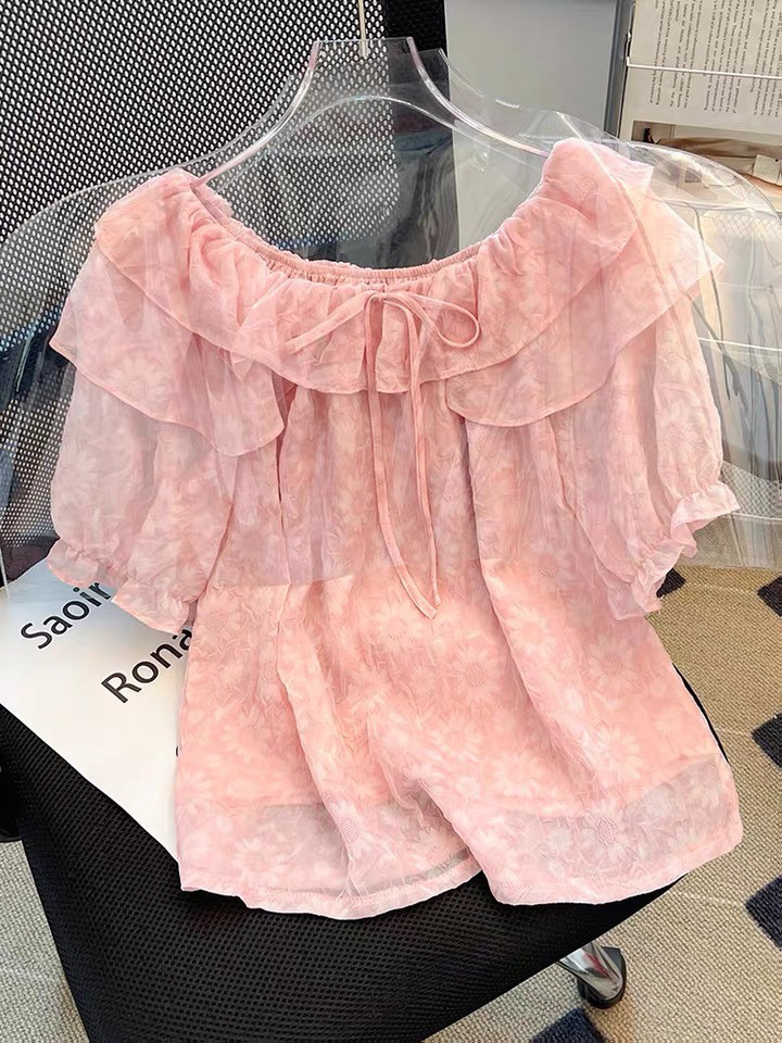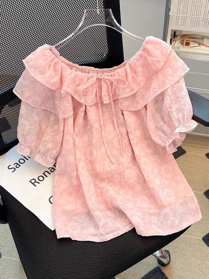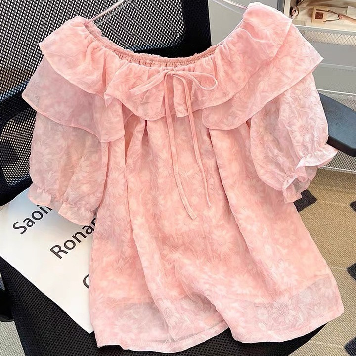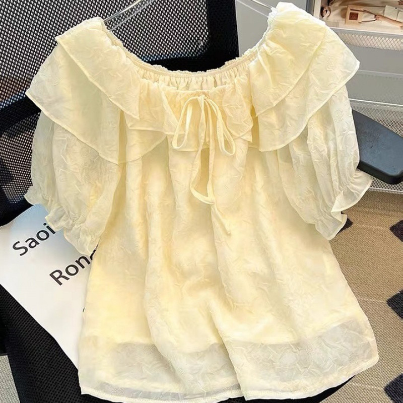 M8N2025 디자인 쉬폰 셔츠 원라인 칼라 셔츠 여름 연잎 스타일 슬리밍 뉴 탑 쇼트 스위트