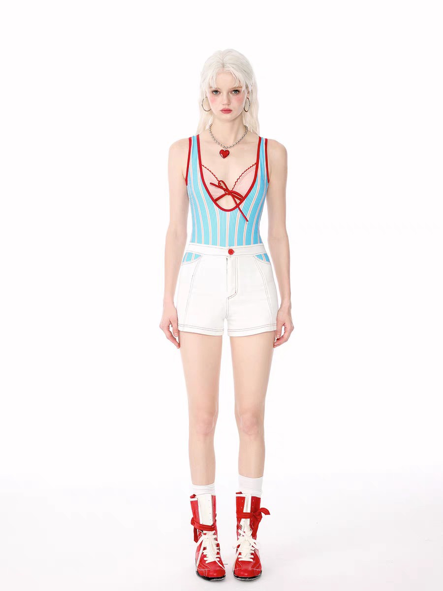 • 빨간 스커트 + 파란색 줄무늬 수영복