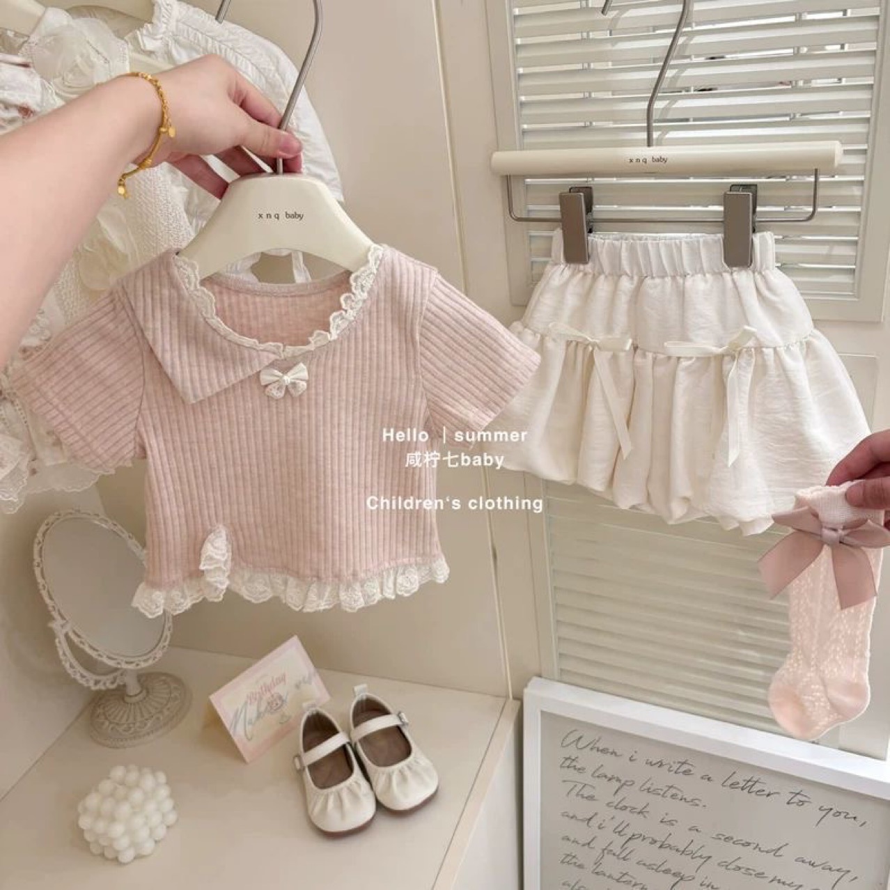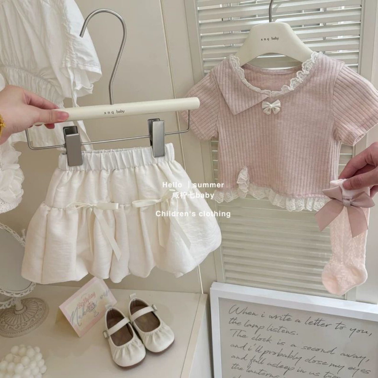 아동복, 여아 상의, 레이스 리본 여름옷, 여아 스위트 핑크 반팔 티셔츠, 꽃바지 투피스 세트