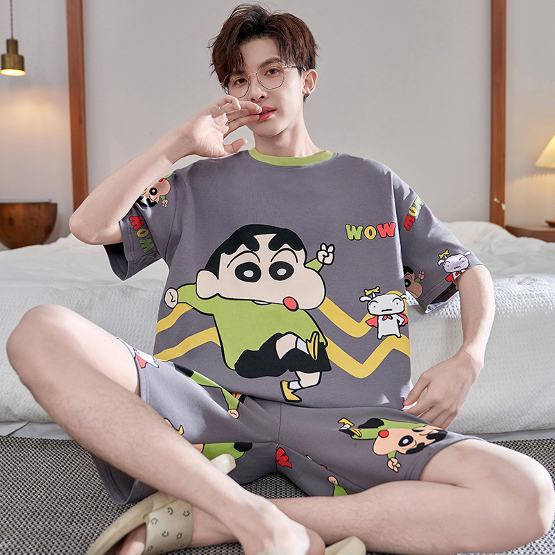 남성용 잠옷 반팔 얇은 여름 캐주얼 루즈 플러스 사이즈 여름 라운드 넥 심플 청소년 홈웨어 세트