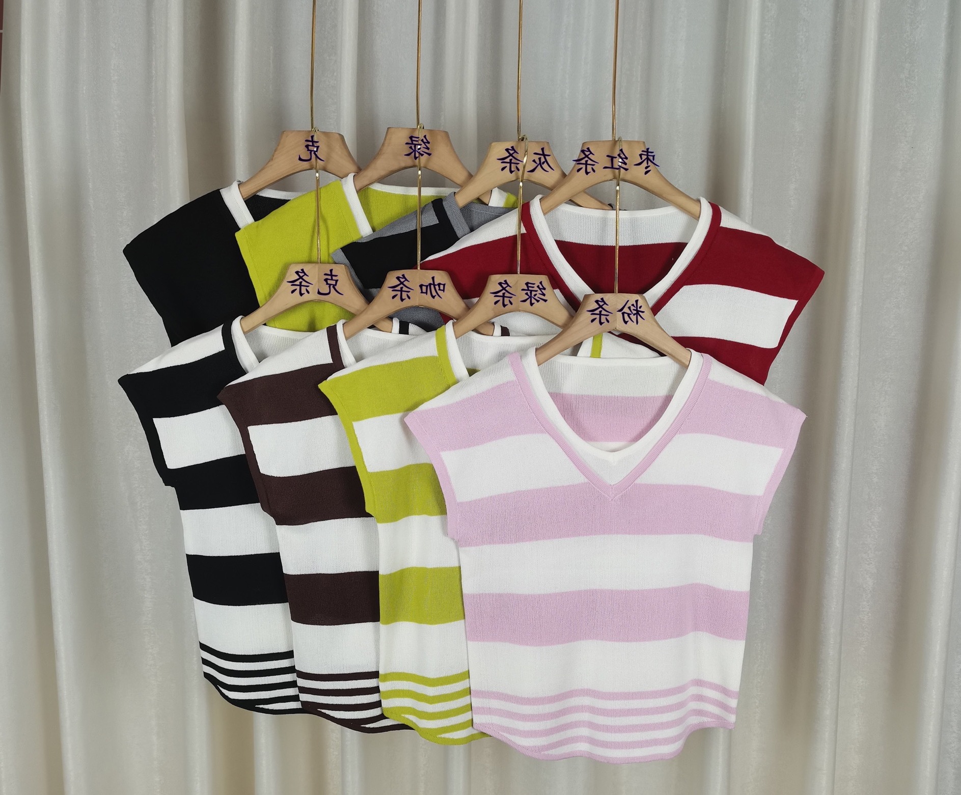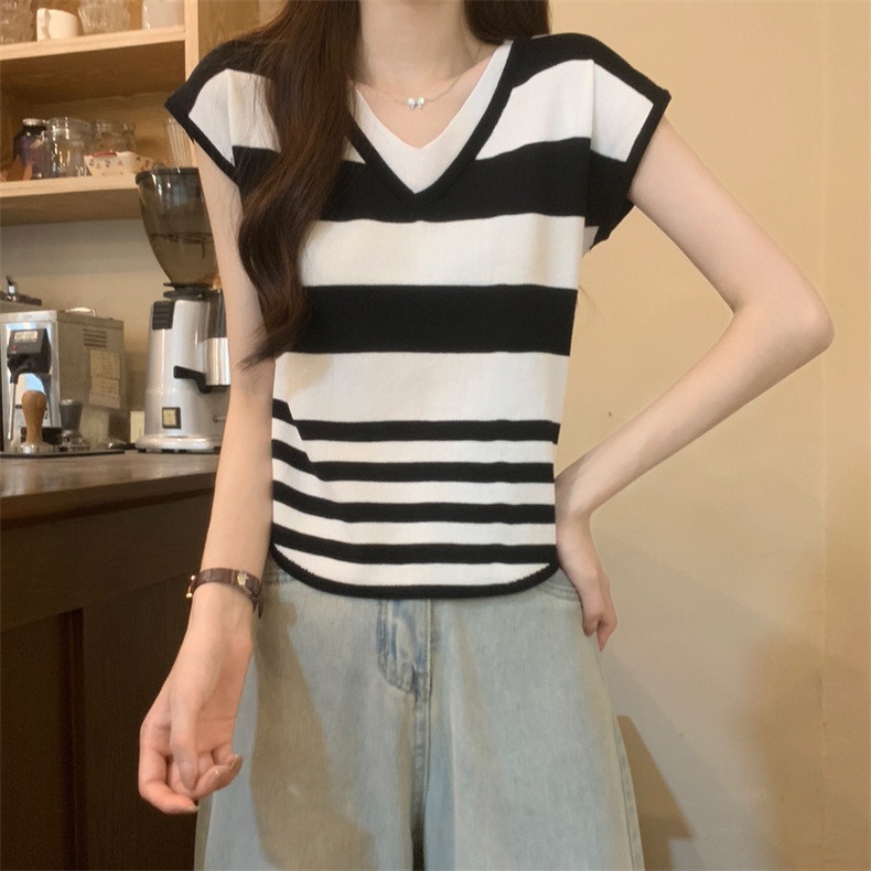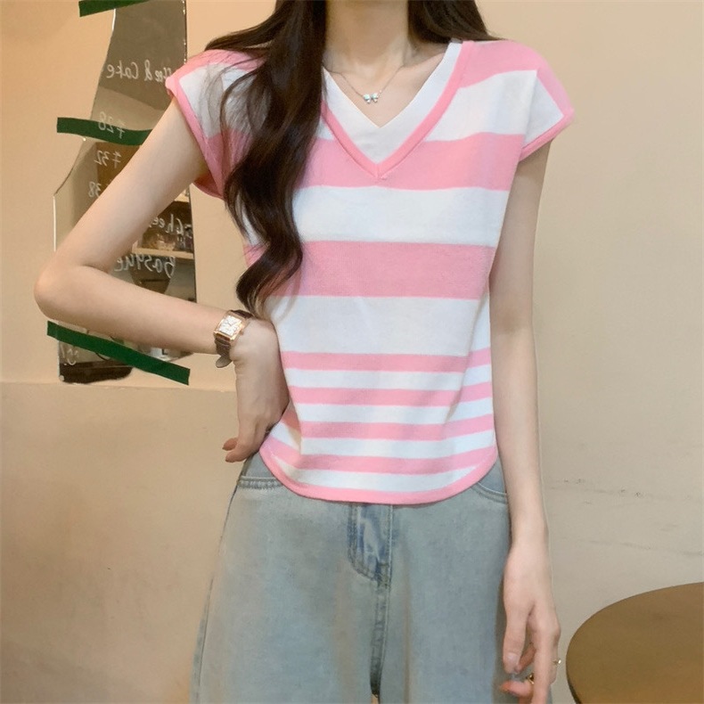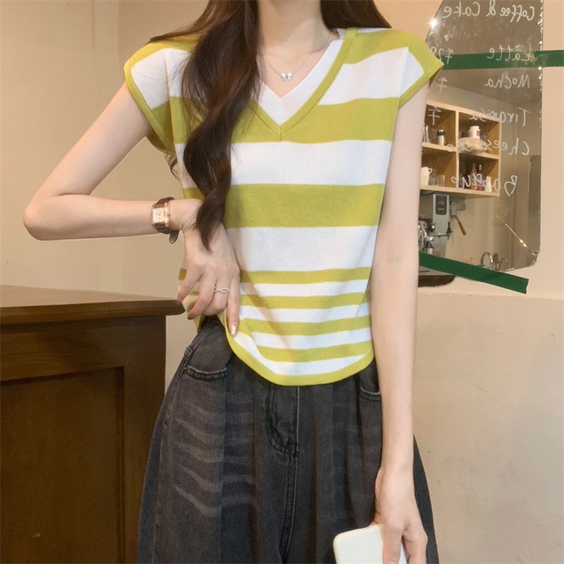 여름 아우터로 입기 좋은 여성용 페이크 투피스 브이넥 스플리싱 반팔 스웨터, 여성용 슬림핏 스트라이프 탑스토어 가기