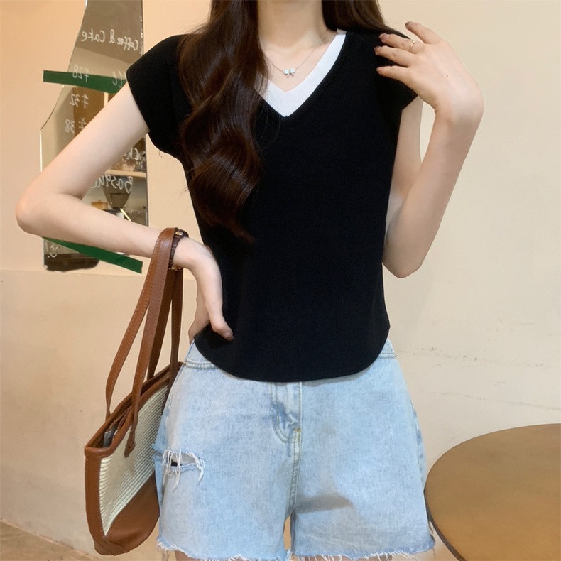 여름 아우터로 입기 좋은 여성용 페이크 투피스 브이넥 스플리싱 반팔 스웨터, 여성용 슬림핏 스트라이프 탑