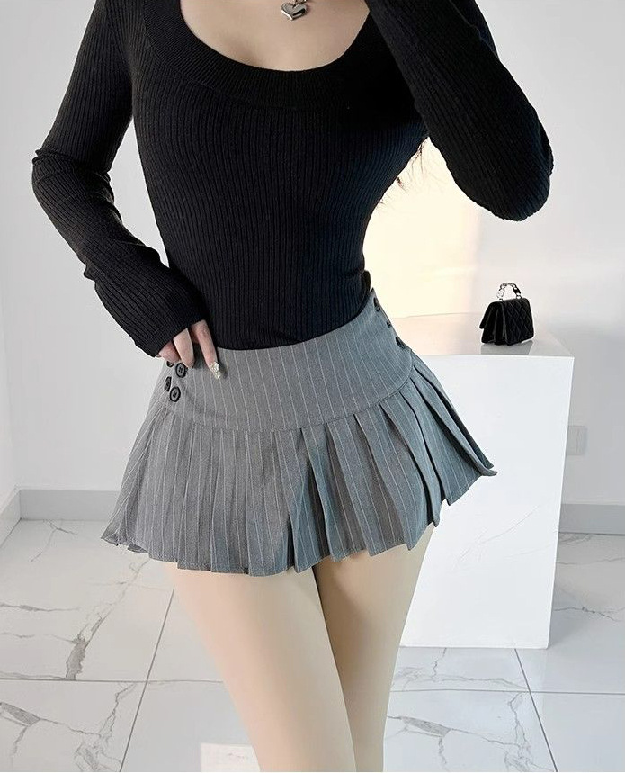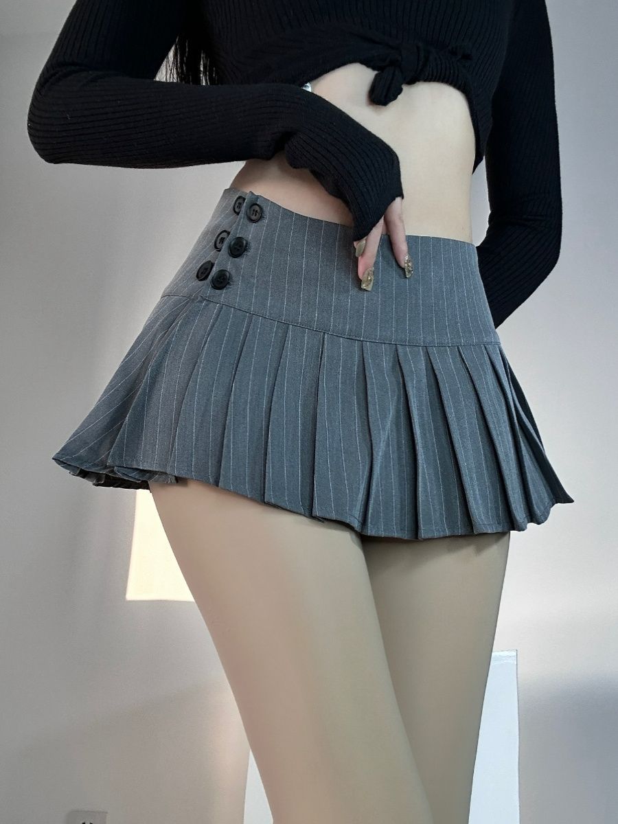 여름 미국 복고풍 줄무늬 회색 정장 원단 로우 웨이스트 여성 다목적 섹시한 핫 소녀 로우 웨이스트 플리츠 미니 스커트