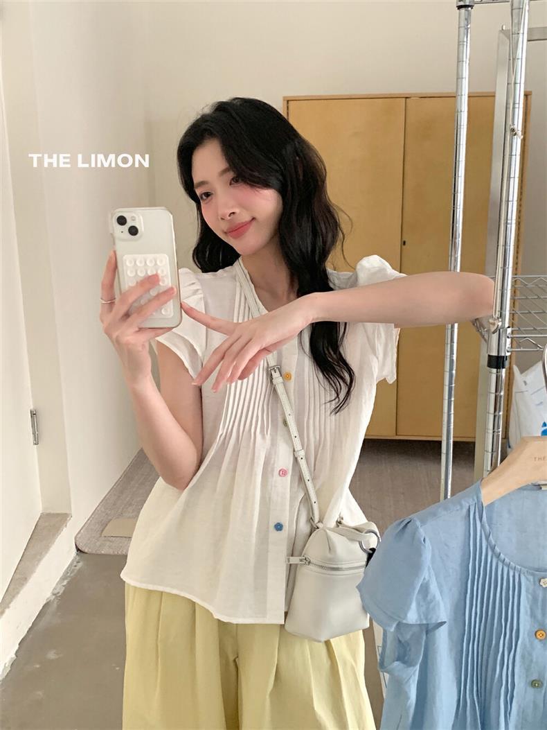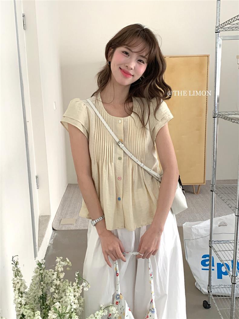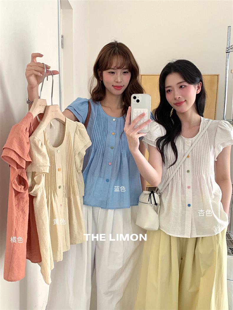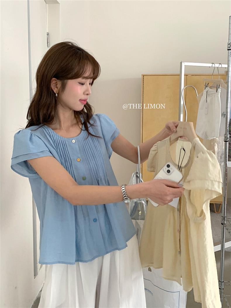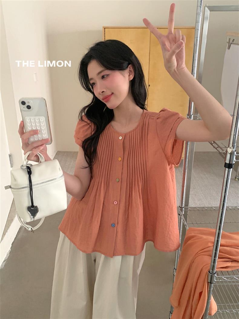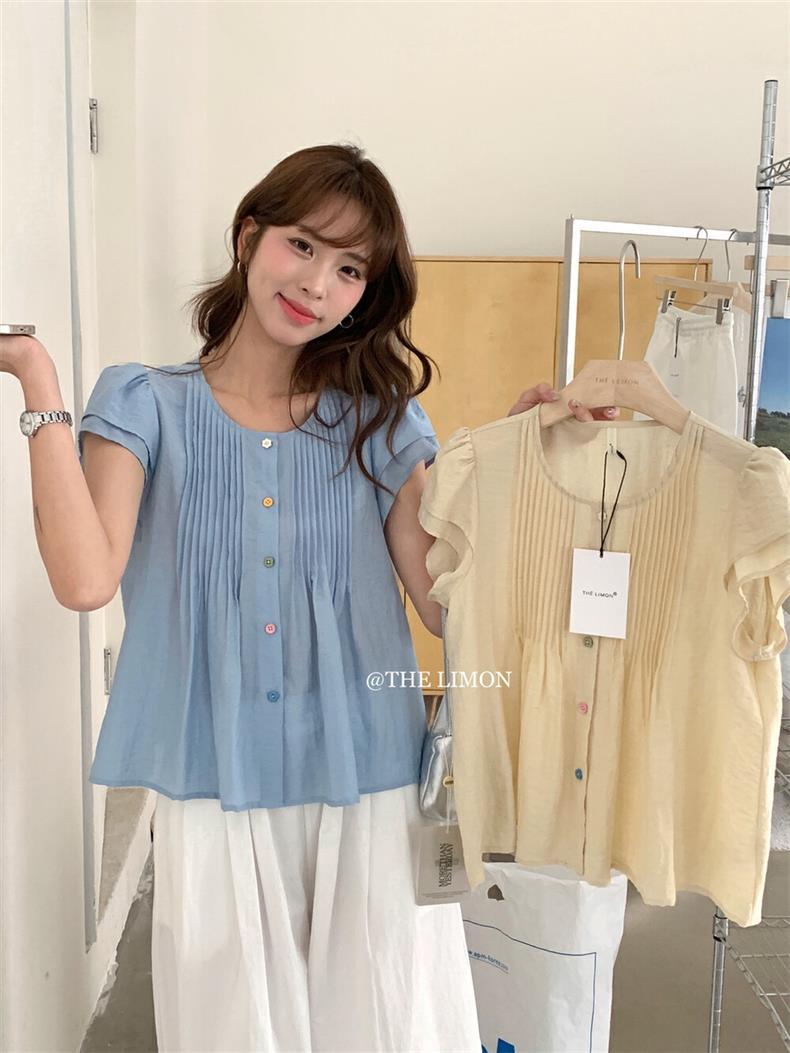레몬 그린티 한국 디자인 플리츠 슬리밍 싱글 행 컬러 버튼 연령 감소 여성용 여름용 반팔 셔츠스토어 가기