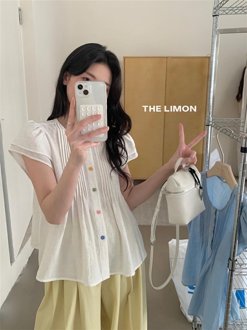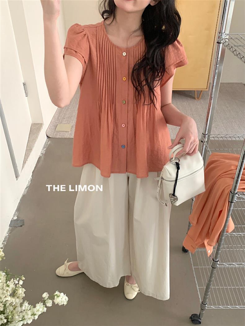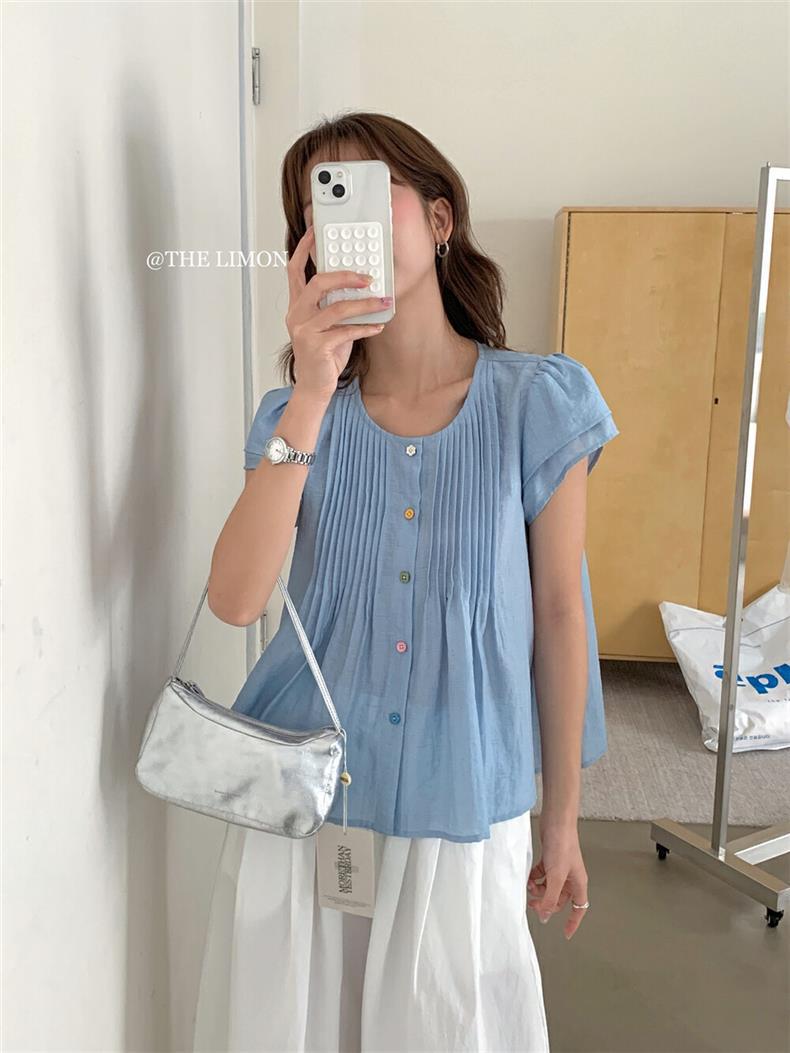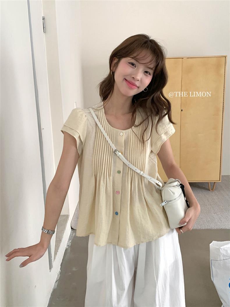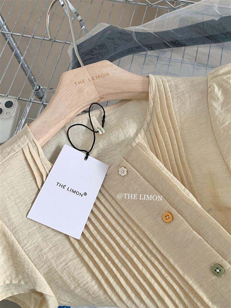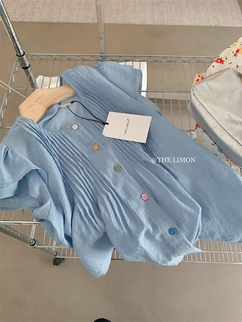 레몬 그린티 한국 디자인 플리츠 슬리밍 싱글 행 컬러 버튼 연령 감소 여성용 여름용 반팔 셔츠스토어 가기