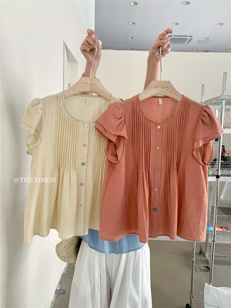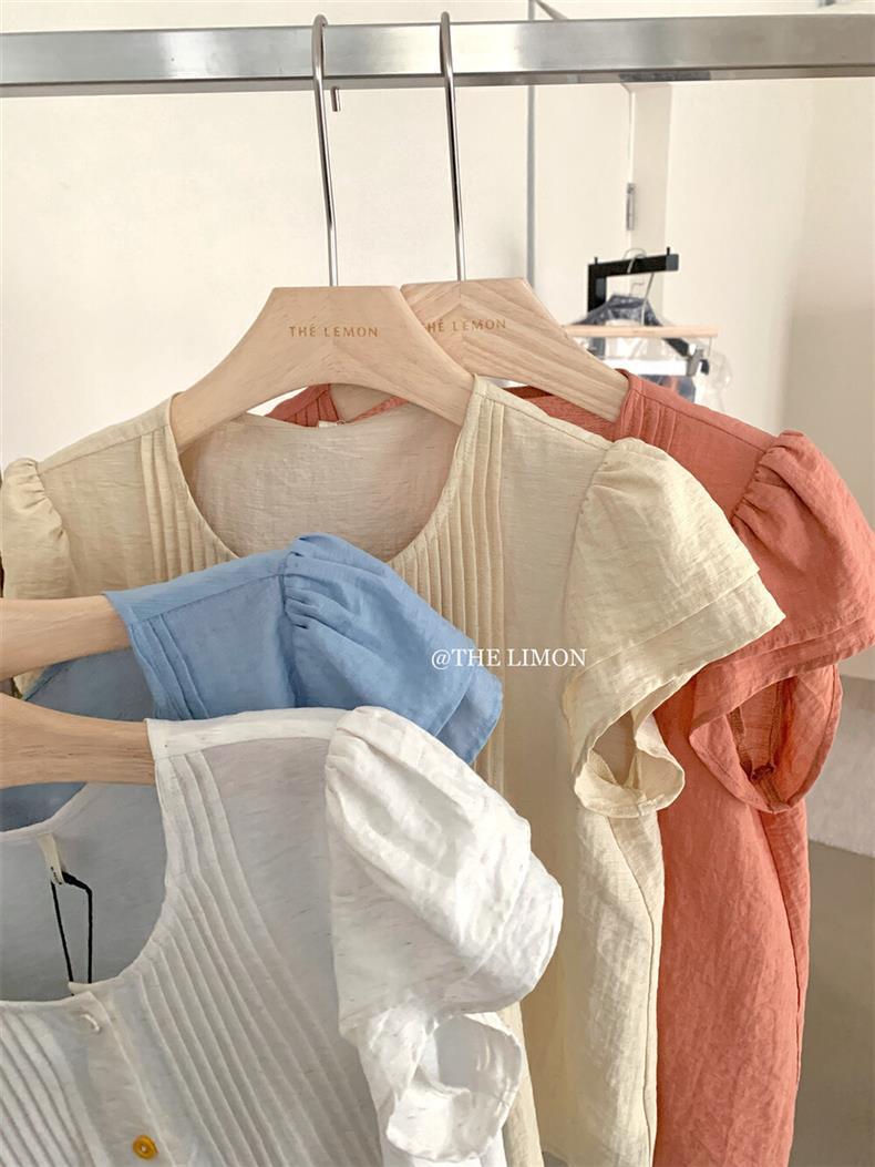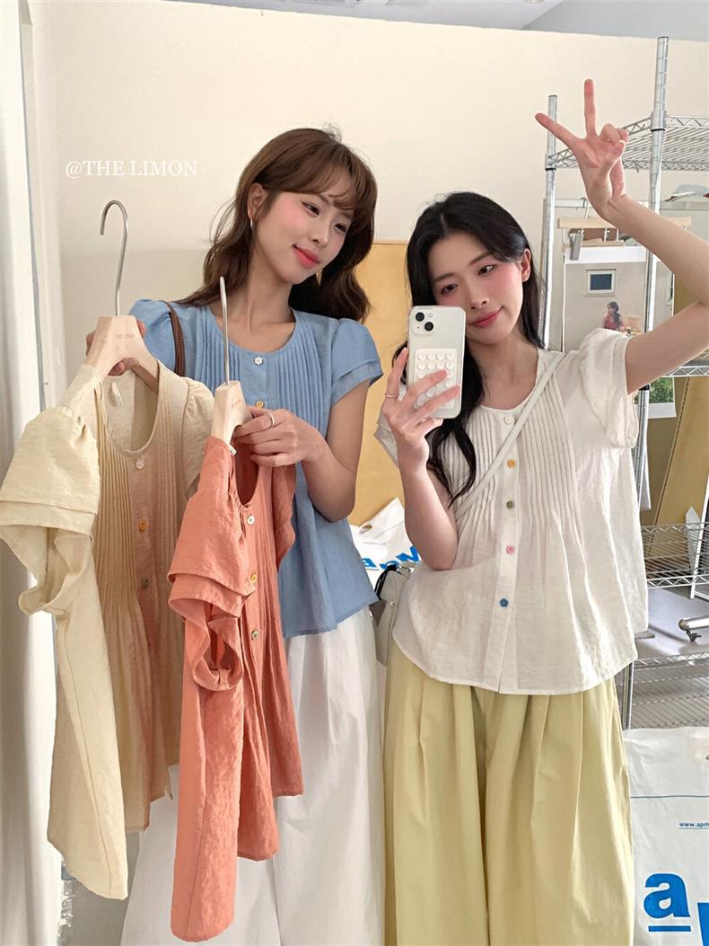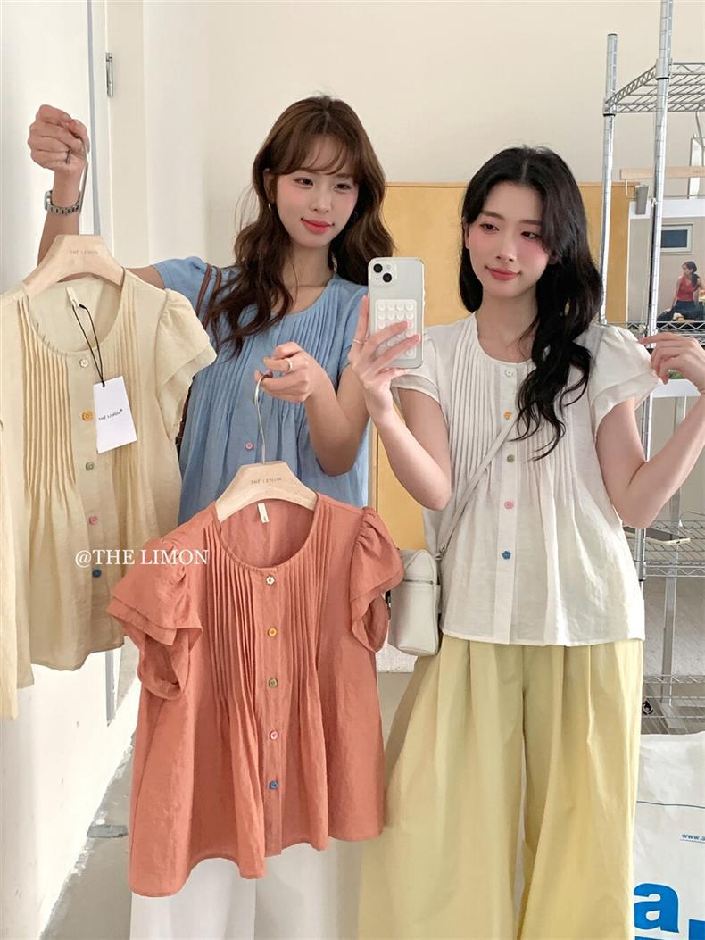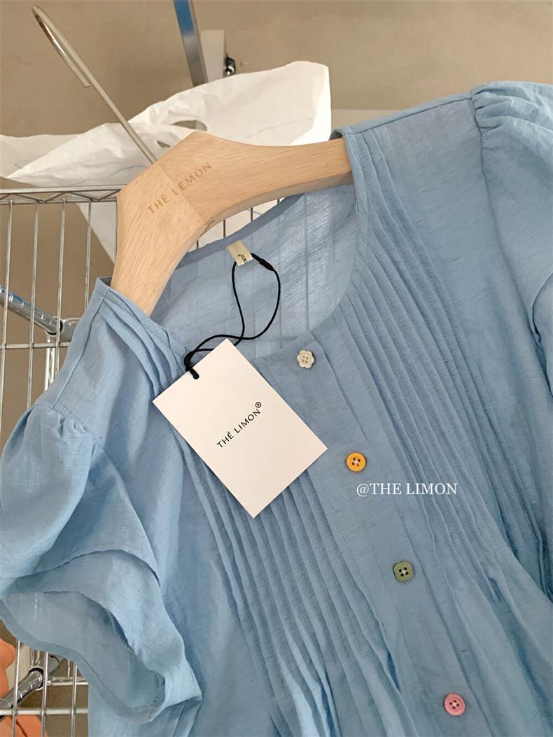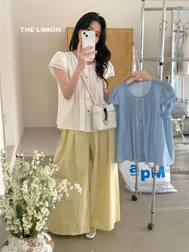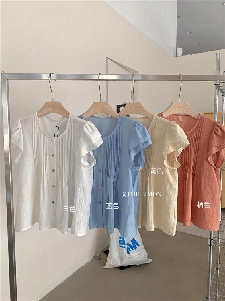 레몬 그린티 한국 디자인 플리츠 슬리밍 싱글 행 컬러 버튼 연령 감소 여성용 여름용 반팔 셔츠스토어 가기