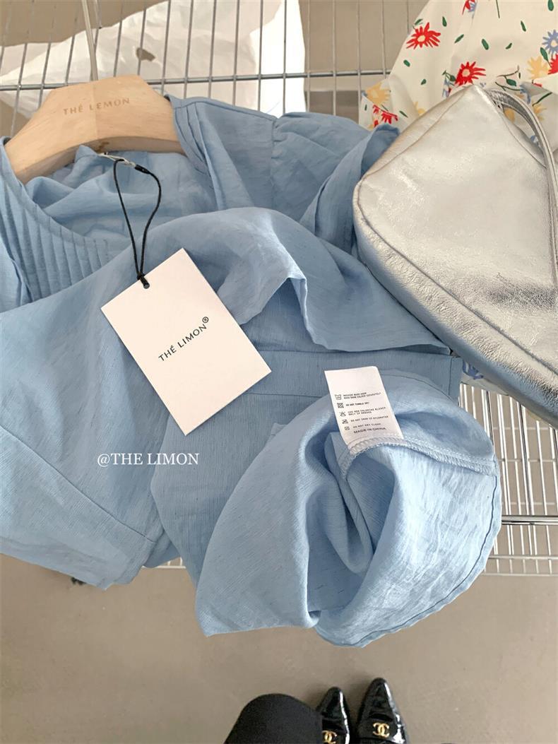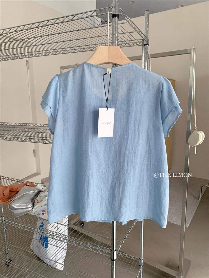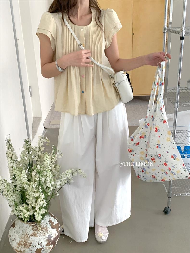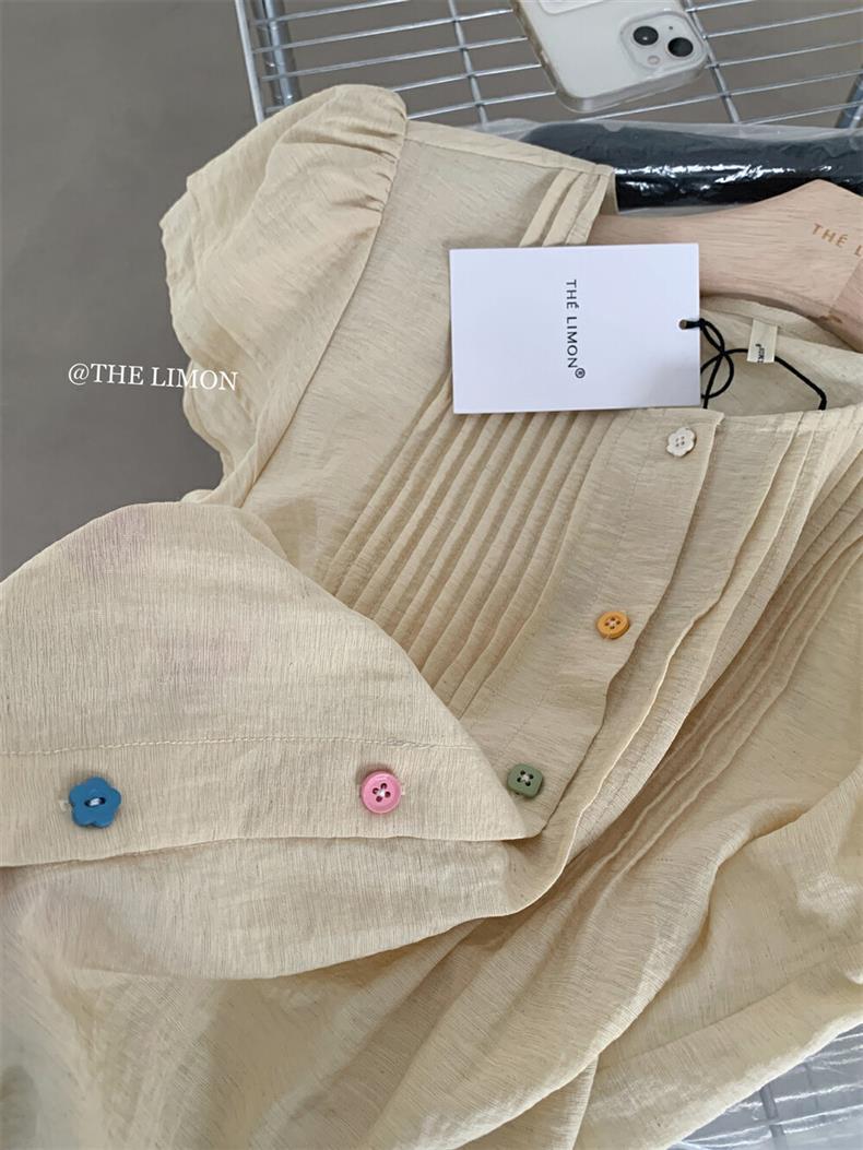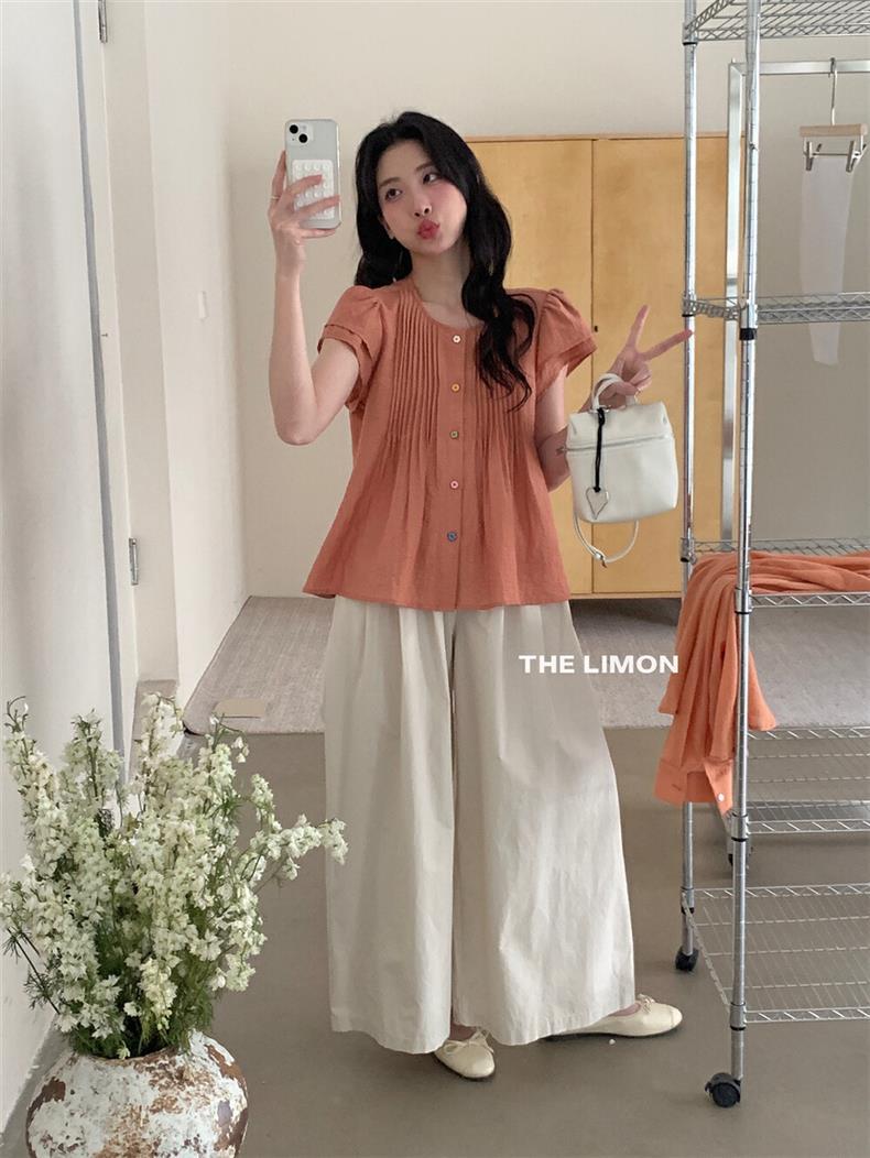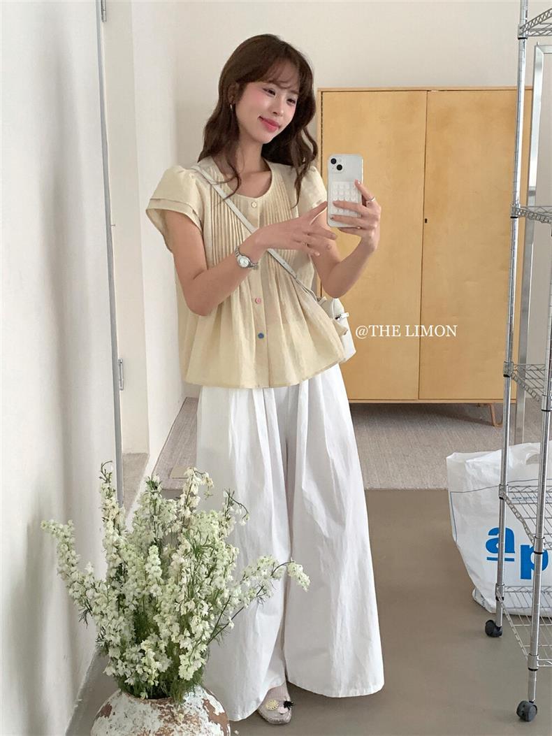 레몬 그린티 한국 디자인 플리츠 슬리밍 싱글 행 컬러 버튼 연령 감소 여성용 여름용 반팔 셔츠스토어 가기