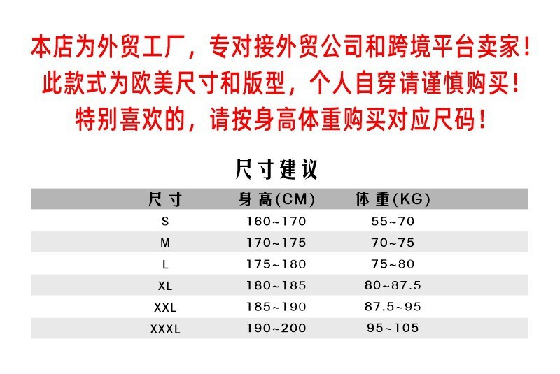 我工厂可开发票,请咨询客服。所有款式尺码都是欧美版型,主要对接跨境电商卖家。产品上只有洗水唛+尺码,跨境卖家方便挂自己的吊牌包装袋为PE拉链环保袋,适合大部分跨境平台。