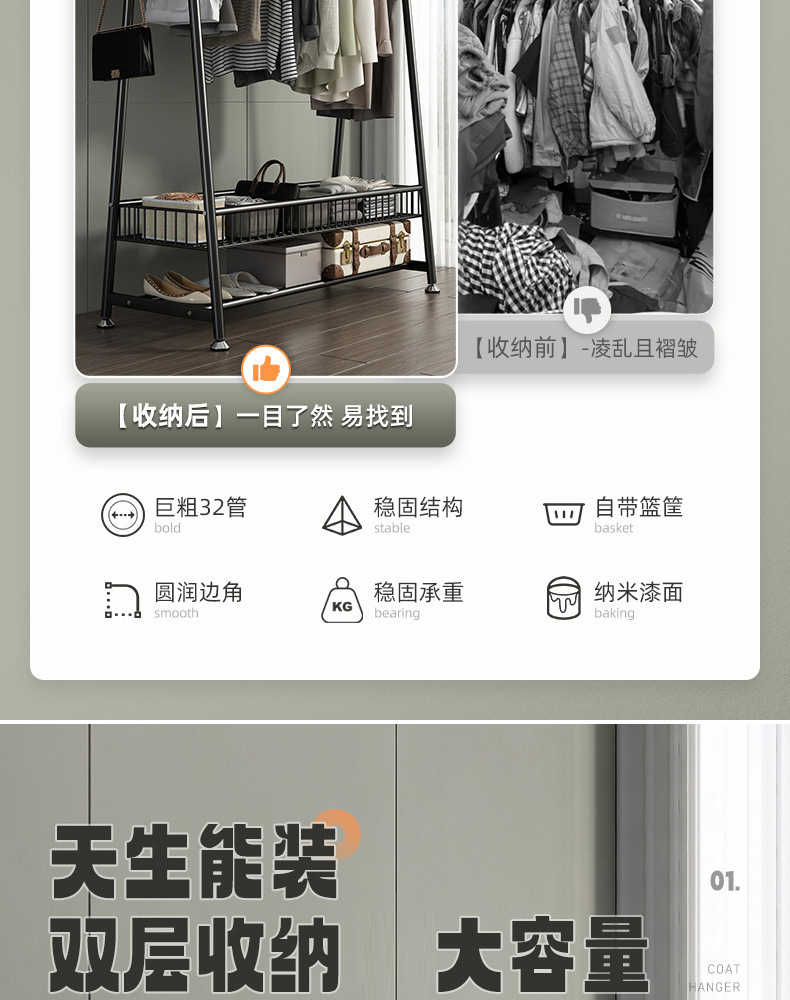 • [특대두께 25관] 크림화이트 - 길이 80*높이 170丨업그레이드된 이중 수납망바구니