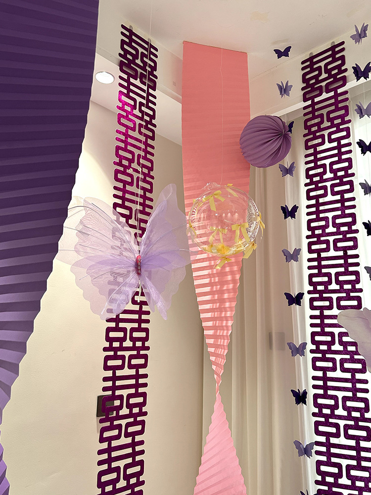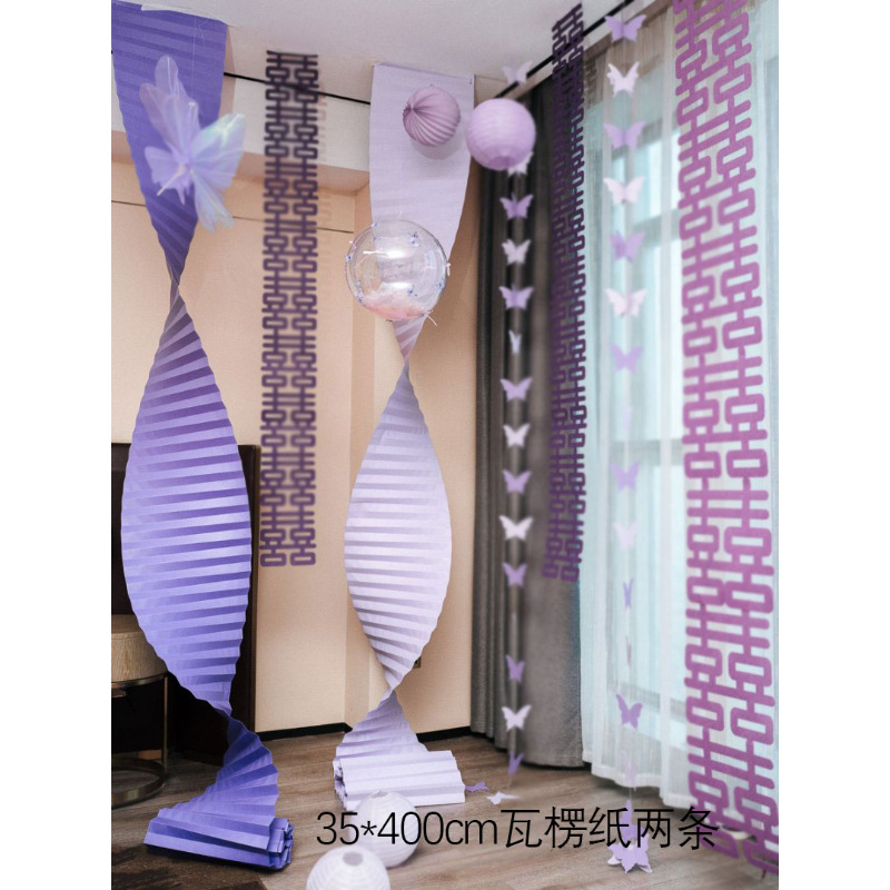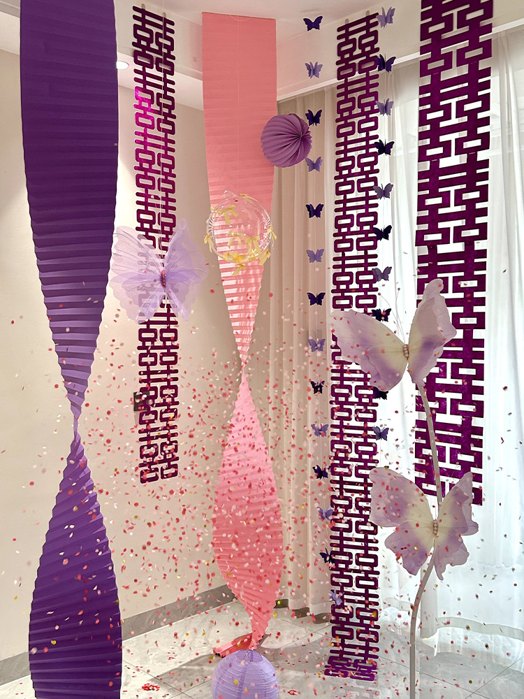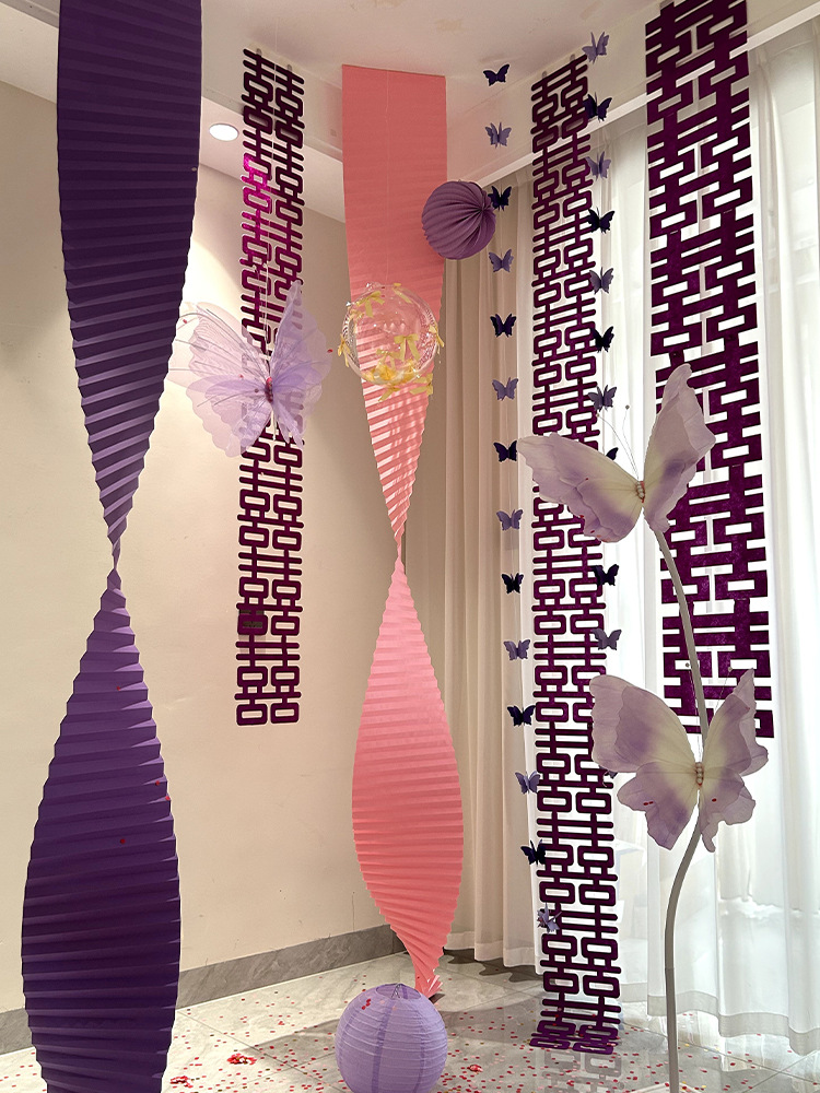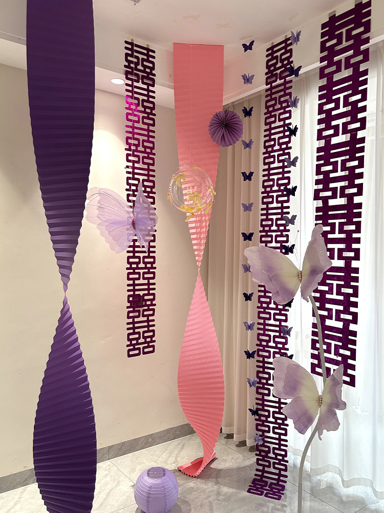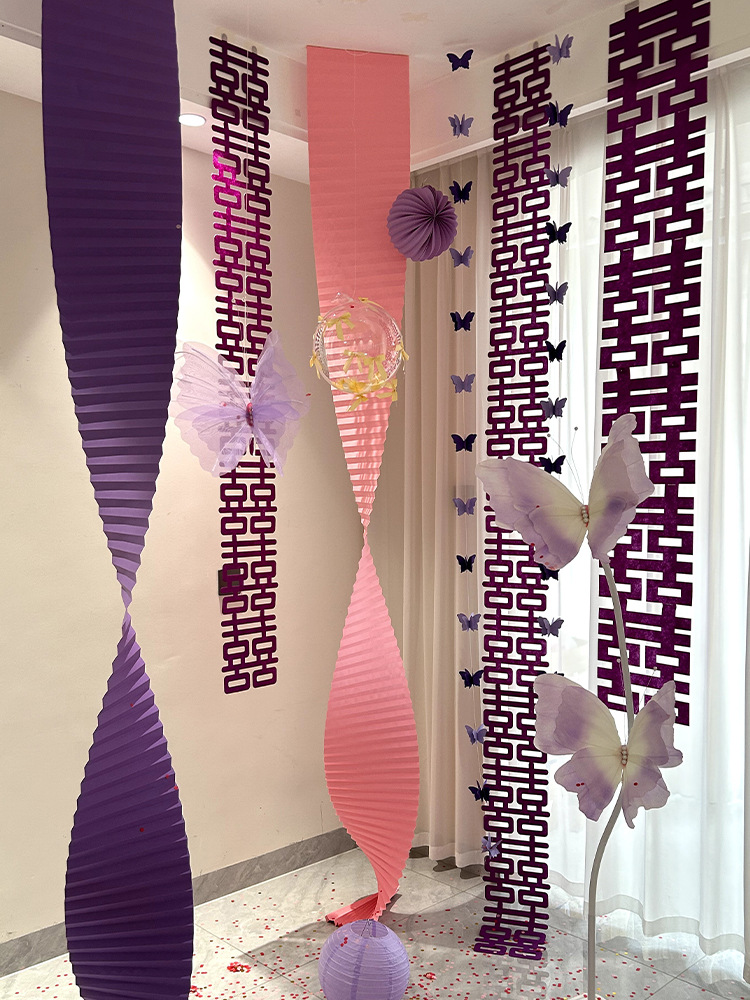 보라색 웨딩룸 분위기 레이아웃 웨딩 새집 거실 침실 커튼 장식 행복한 단어 긴 나비 꽃 웨딩스토어 가기