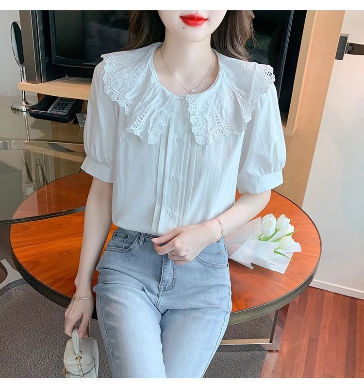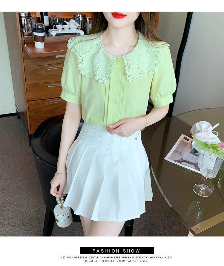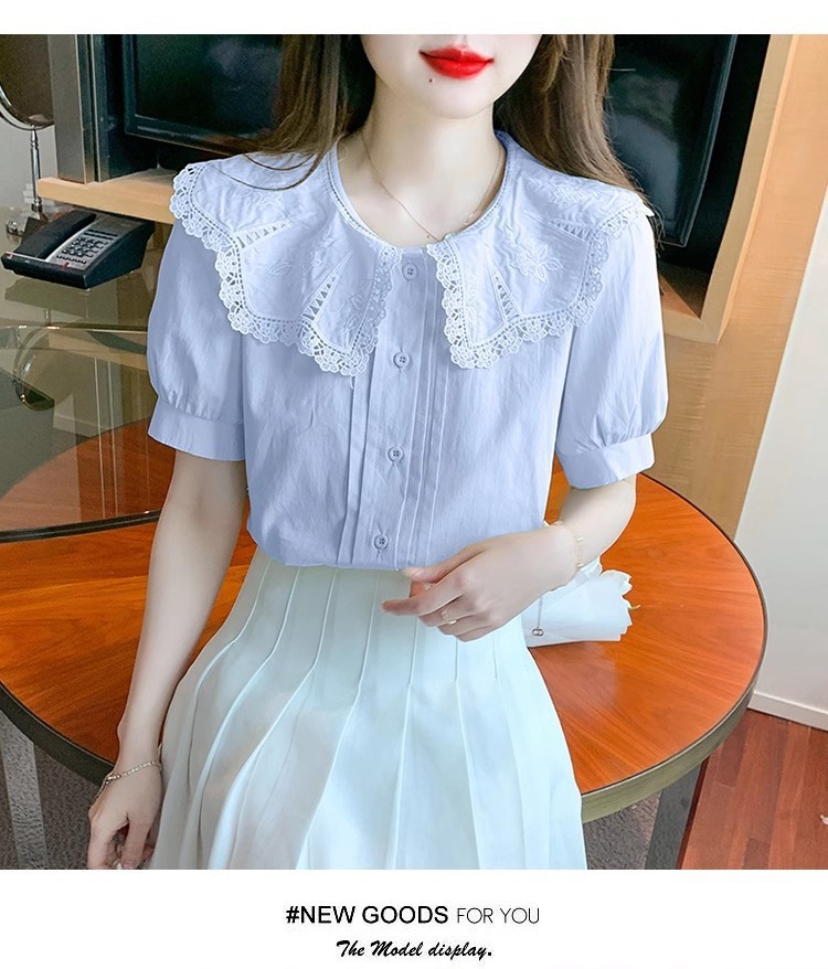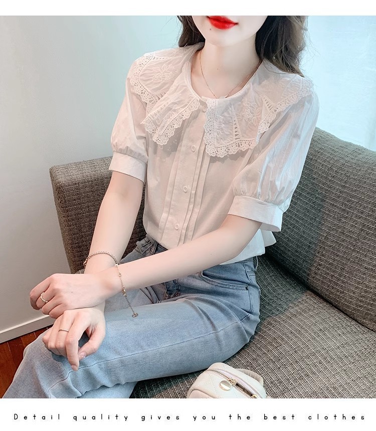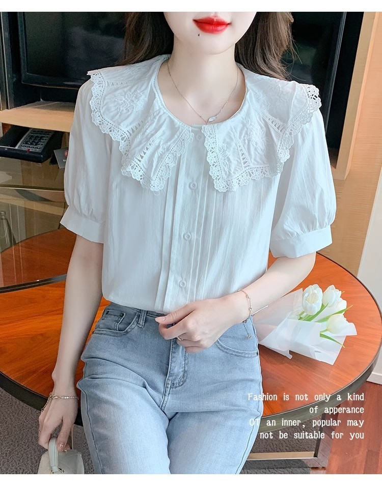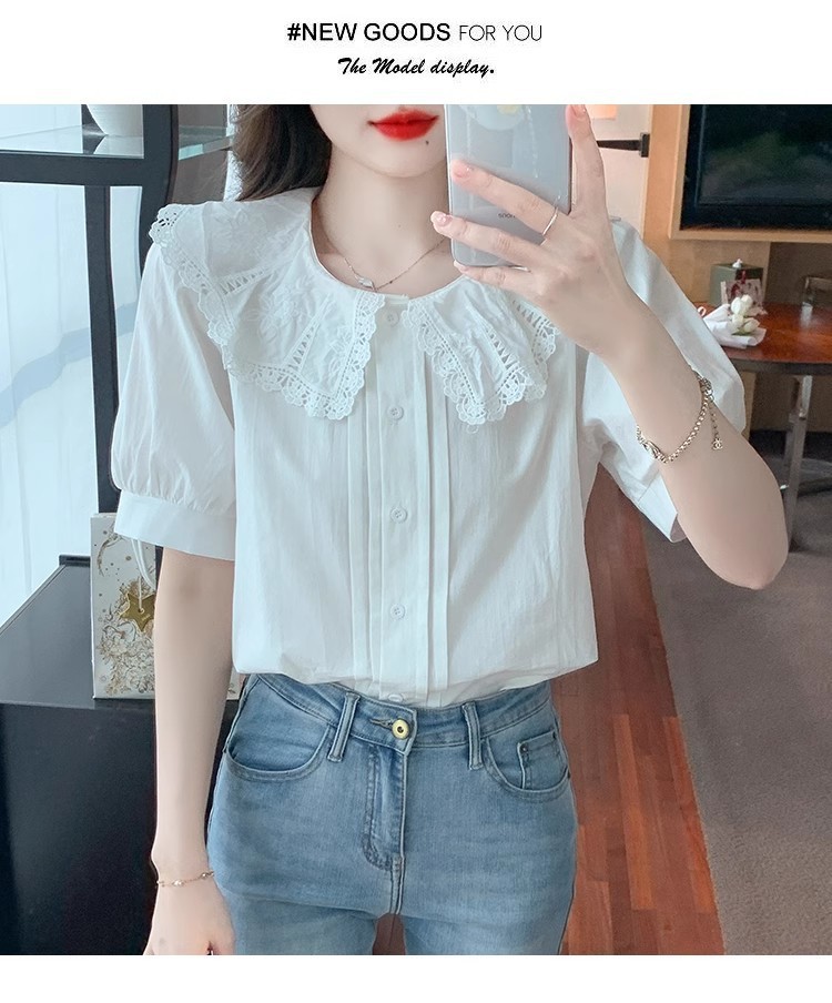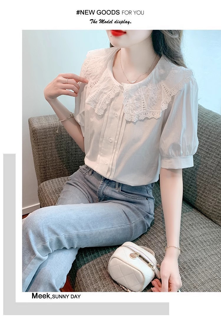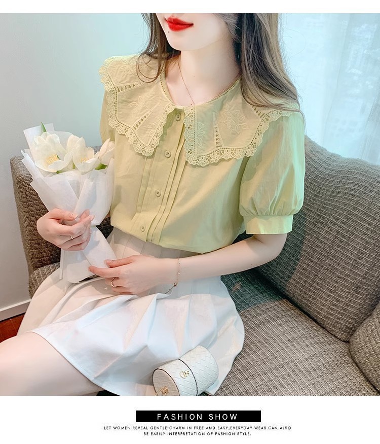 Q7N 여성용 반팔 쉬폰 셔츠, 루즈핏 슬리밍 인형 칼라 셔츠, 패셔너블한 아우터웨어