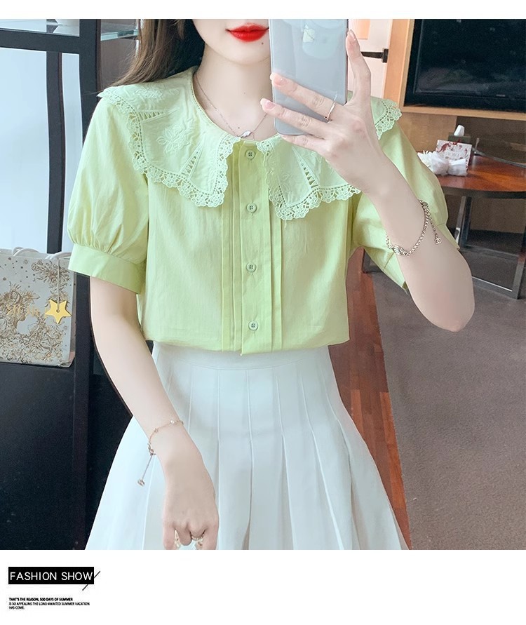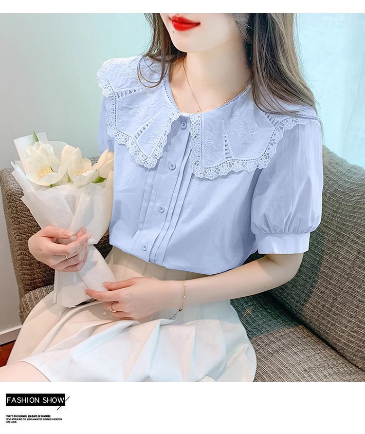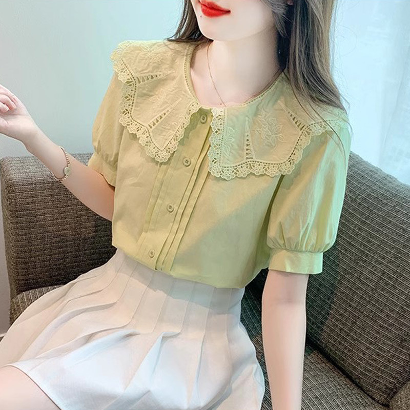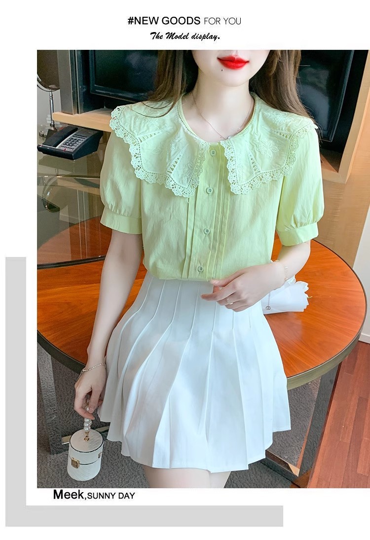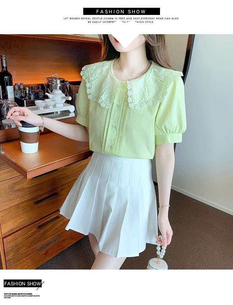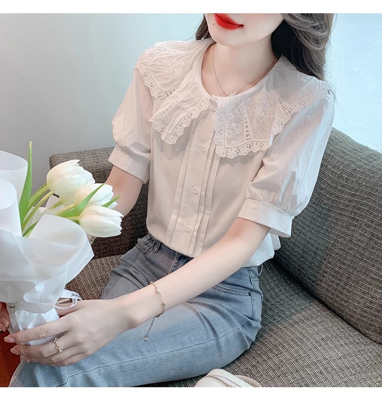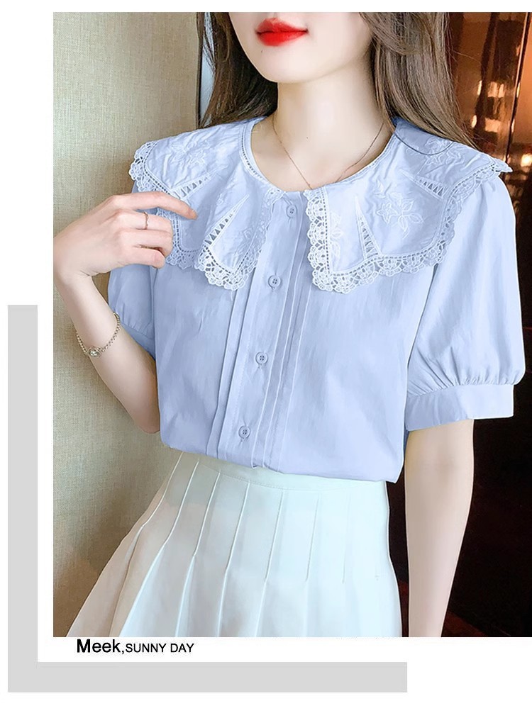 Q7N 여성용 반팔 쉬폰 셔츠, 루즈핏 슬리밍 인형 칼라 셔츠, 패셔너블한 아우터웨어