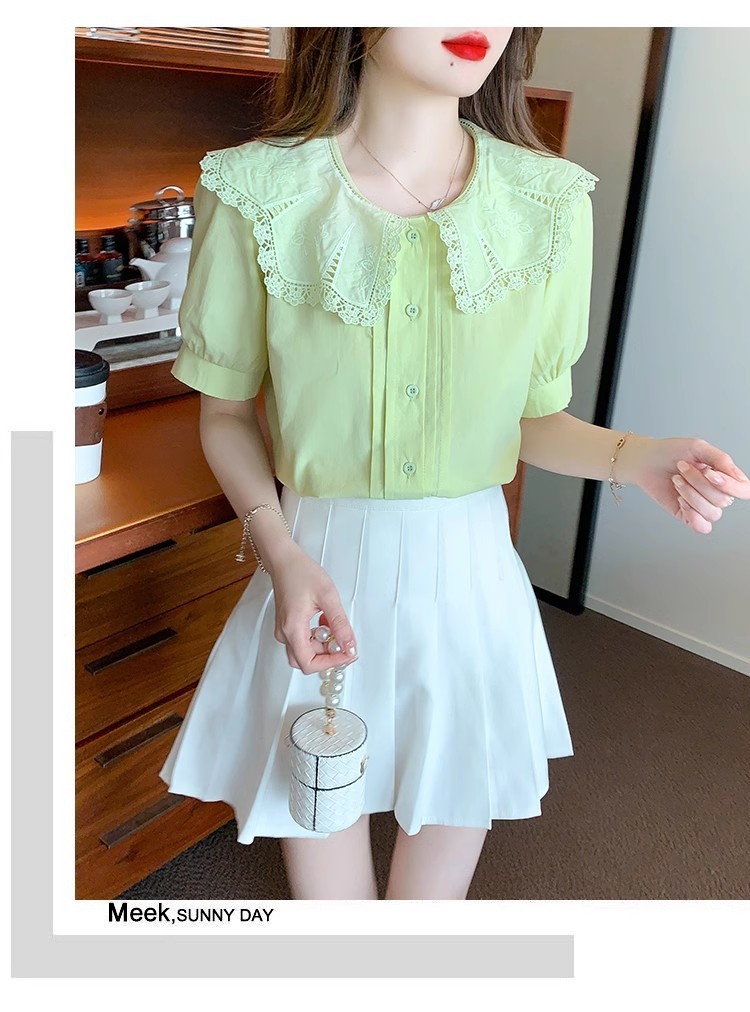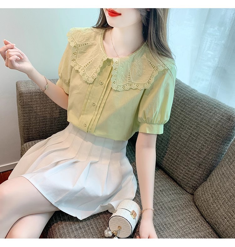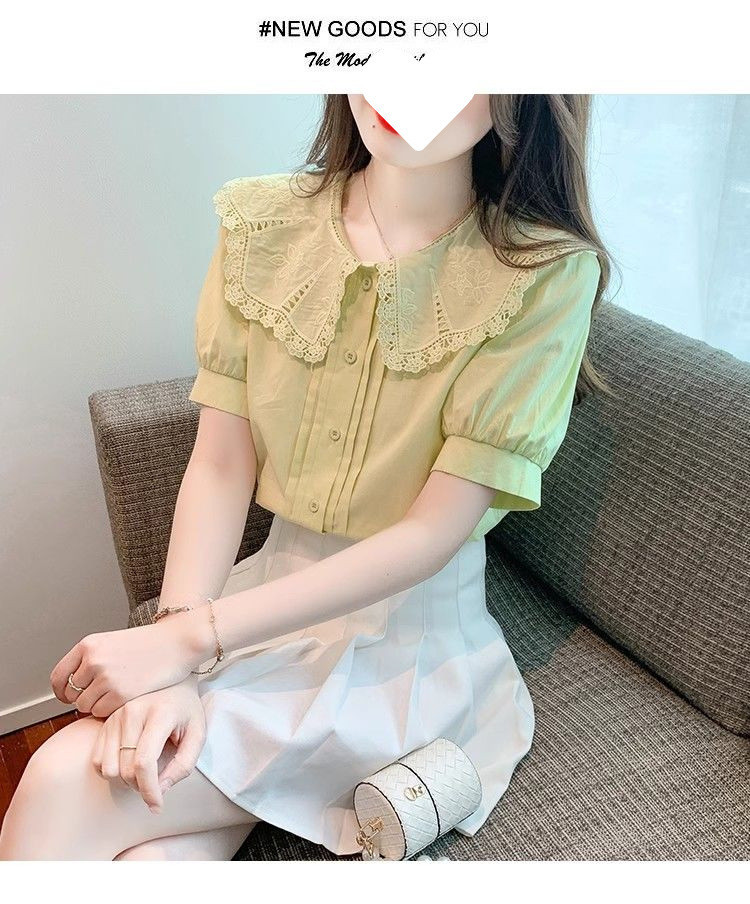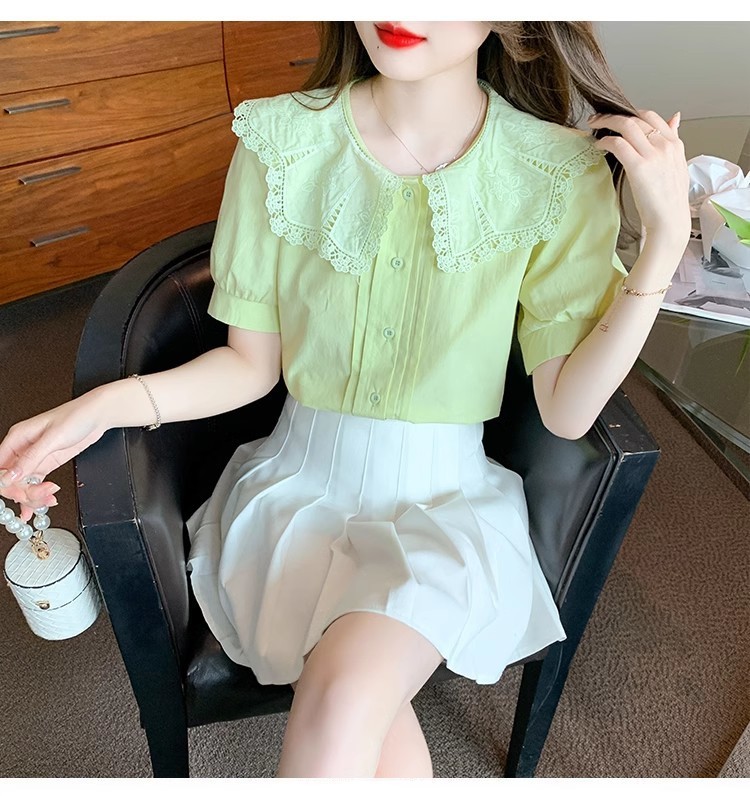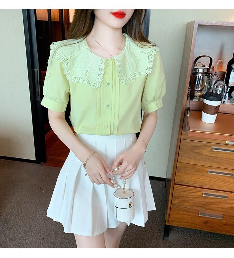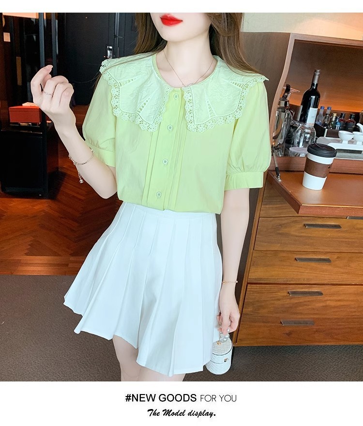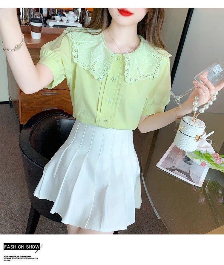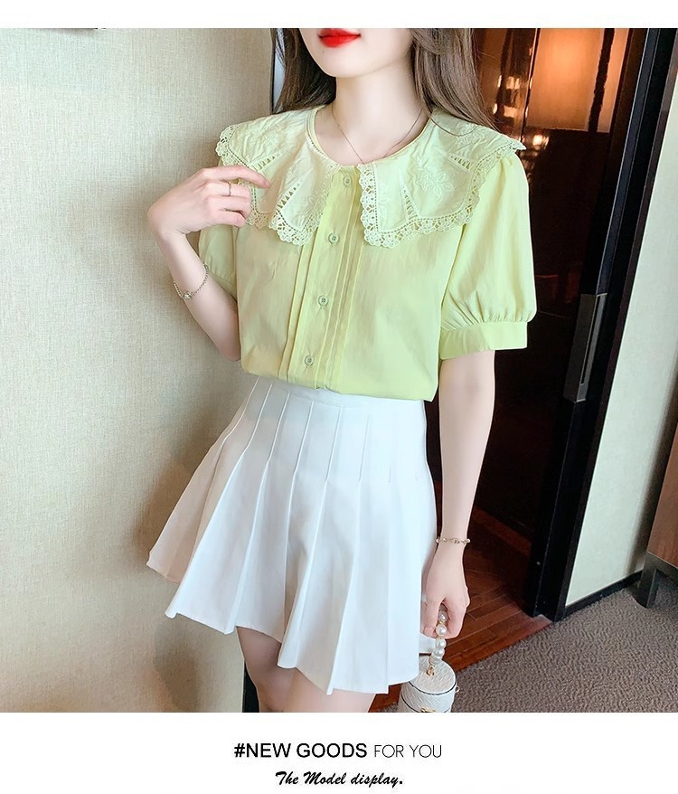 Q7N 여성용 반팔 쉬폰 셔츠, 루즈핏 슬리밍 인형 칼라 셔츠, 패셔너블한 아우터웨어