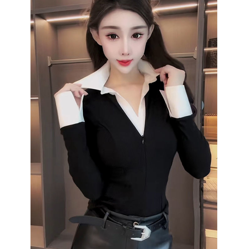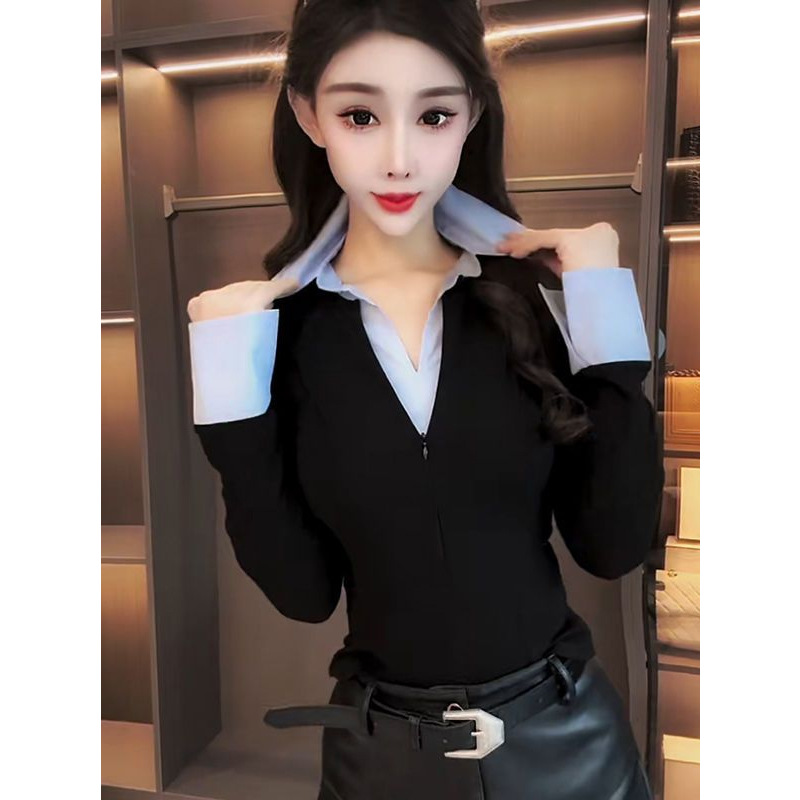 2025 봄 신작 대비 색상 셔츠 칼라 스플 라이스 허리 슬리밍 V 넥 가짜 투피스 플레어 슬리브 셔츠 여성용스토어 가기