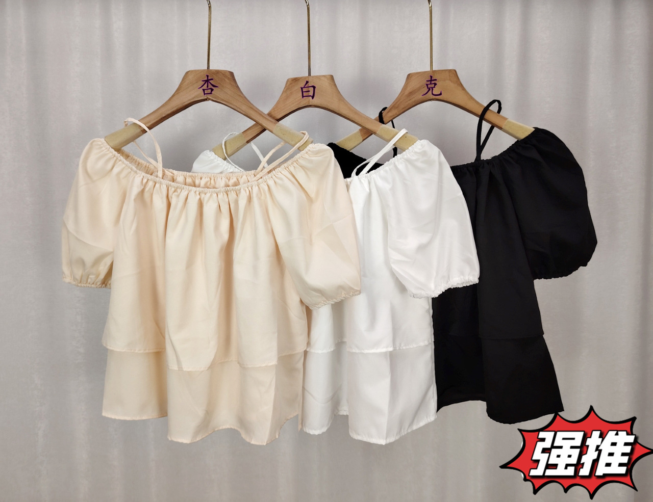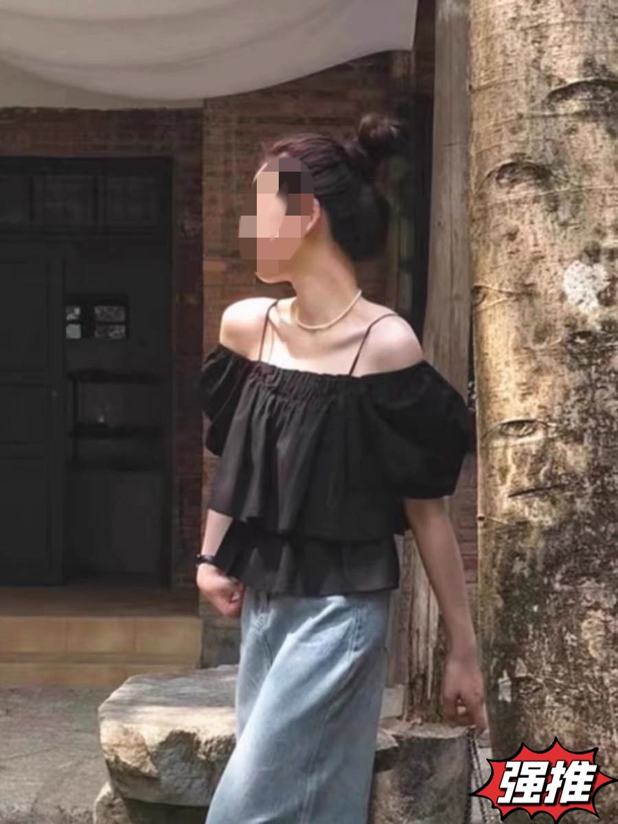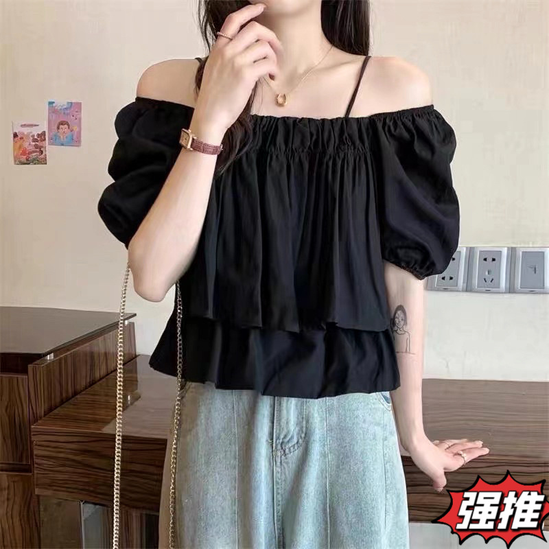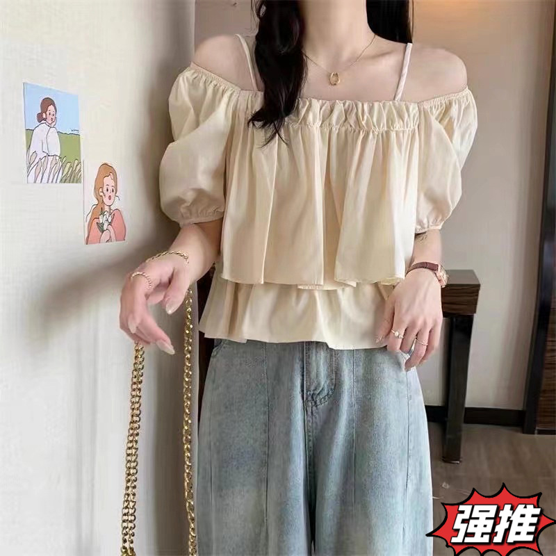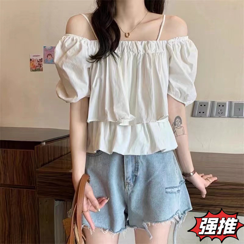 여성용 오프 숄더 원 라인 칼라 서스펜더 베이비돌 셔츠, 얇은 퓨어 버블 슬리브 탑, 여름 텐셀 쉬폰 반팔스토어 가기