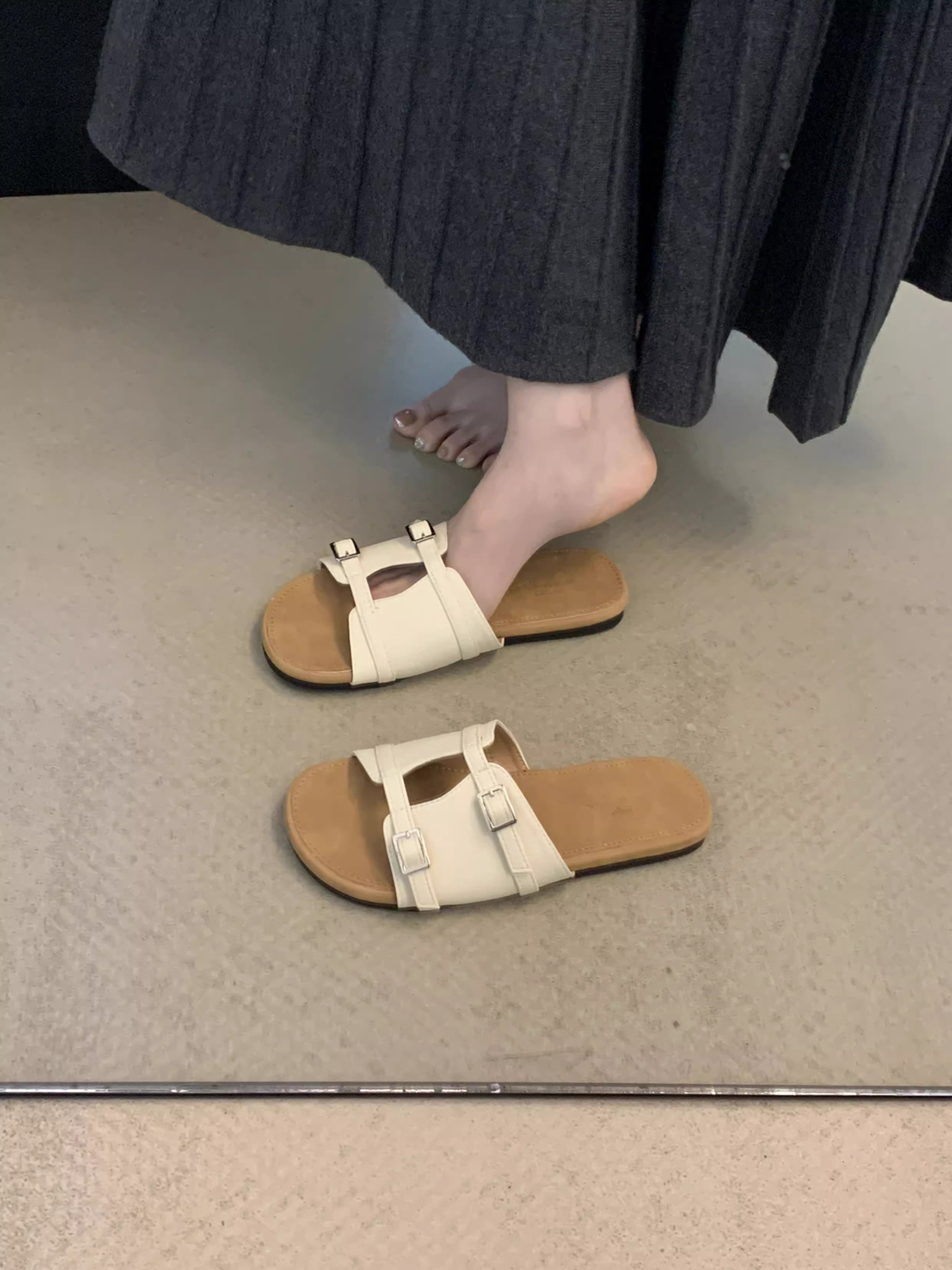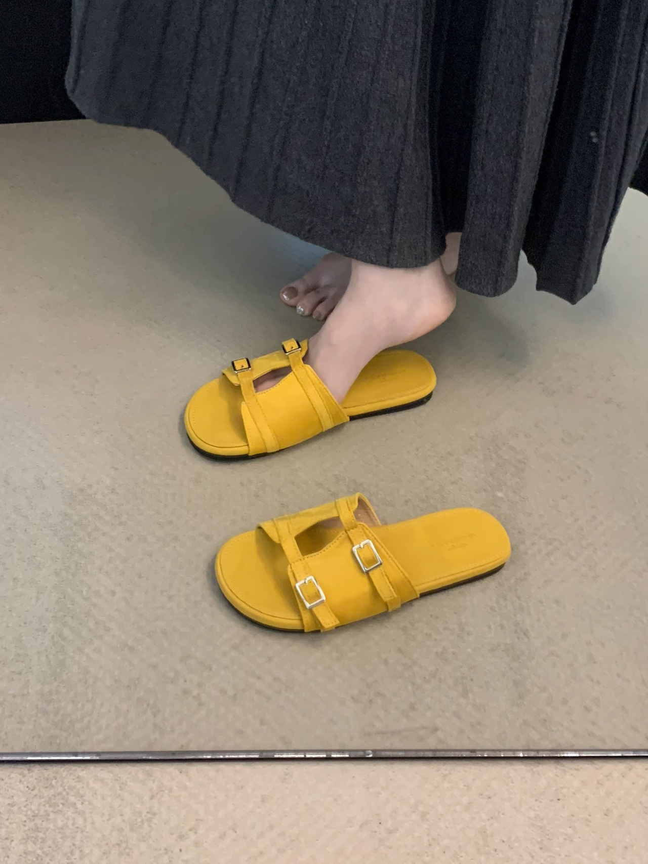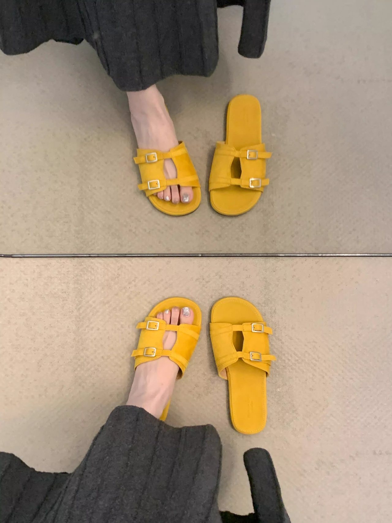 여성을위한 프랑스 슬리퍼 2025 새로운 여름 겉옷 플랫 슬리퍼 여성을위한 더블 버클 비치 샌들
