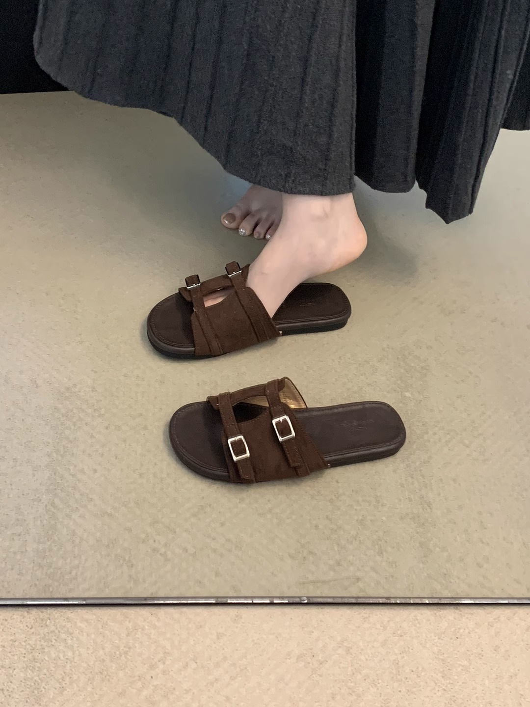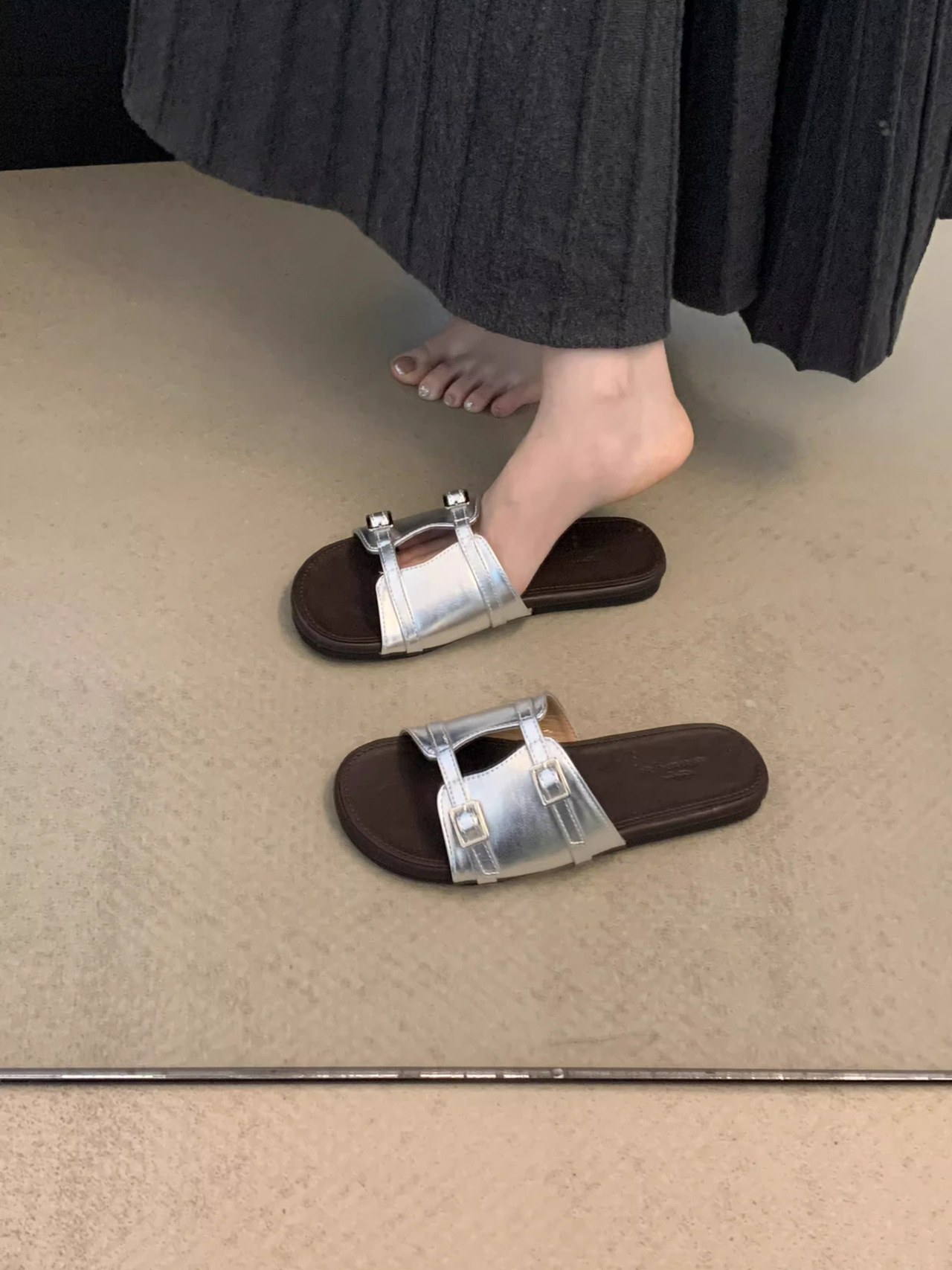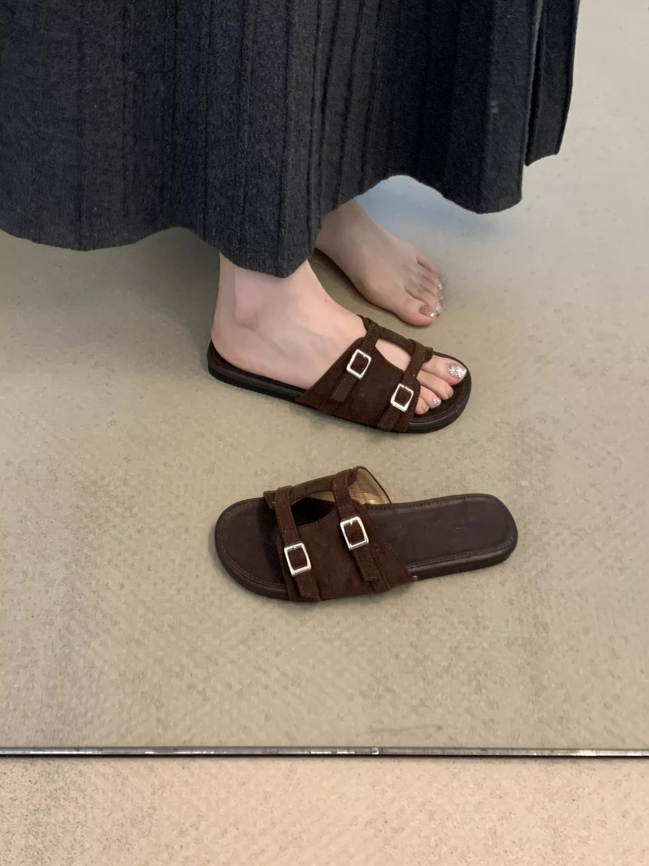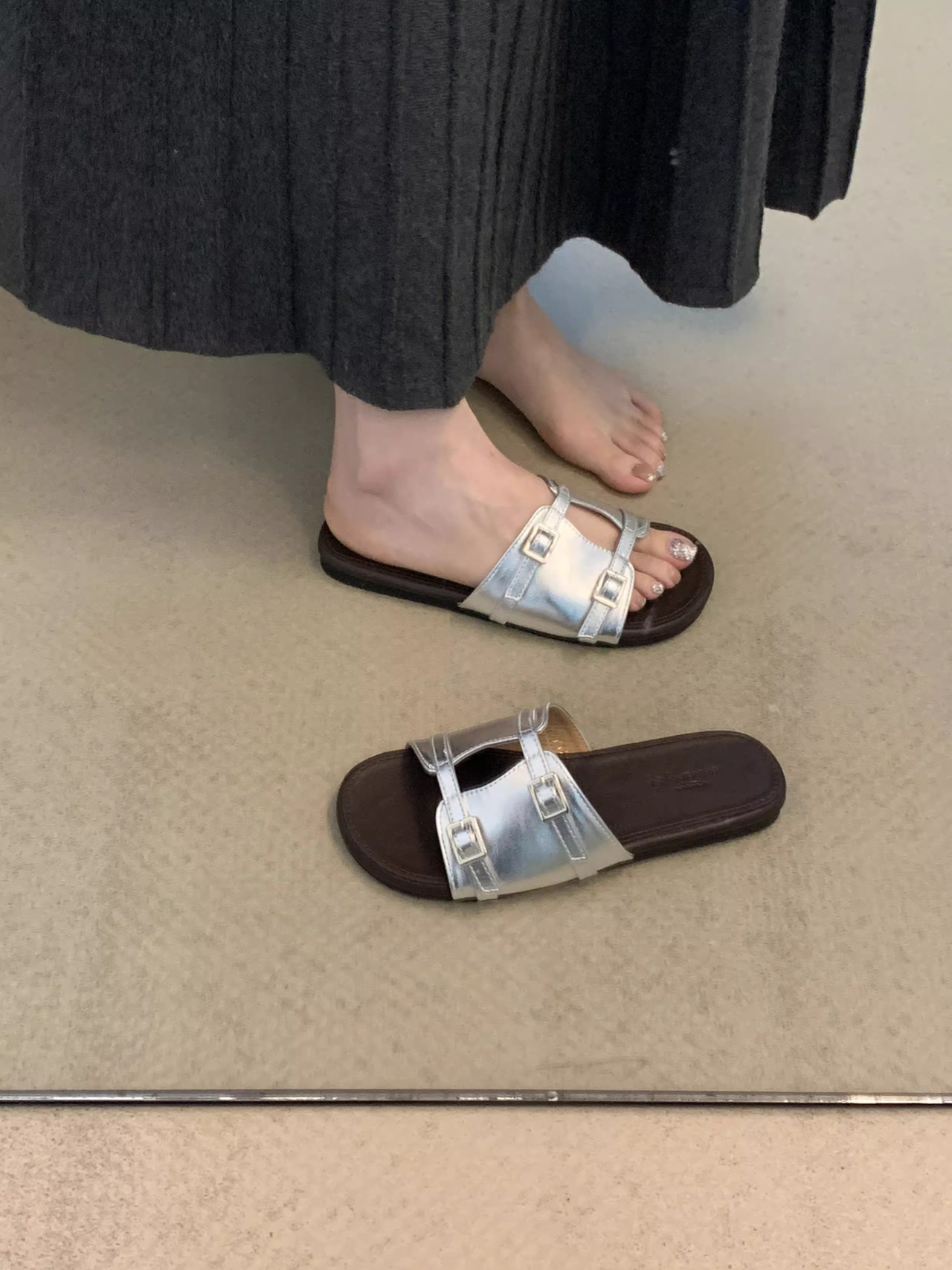 여성을위한 프랑스 슬리퍼 2025 새로운 여름 겉옷 플랫 슬리퍼 여성을위한 더블 버클 비치 샌들