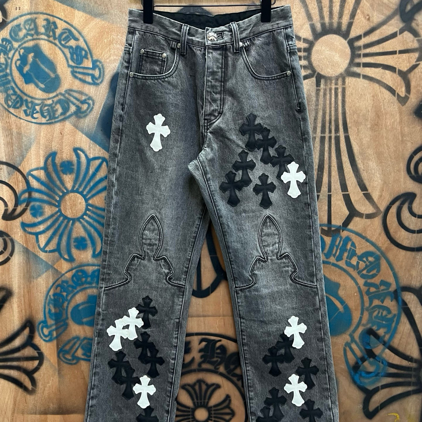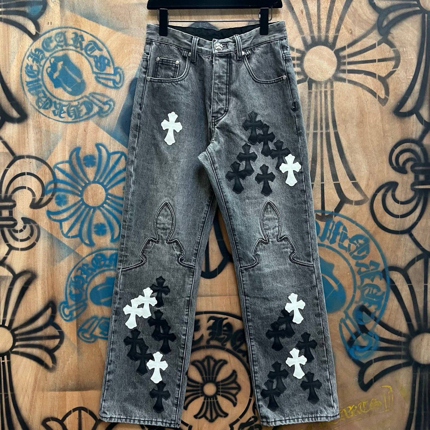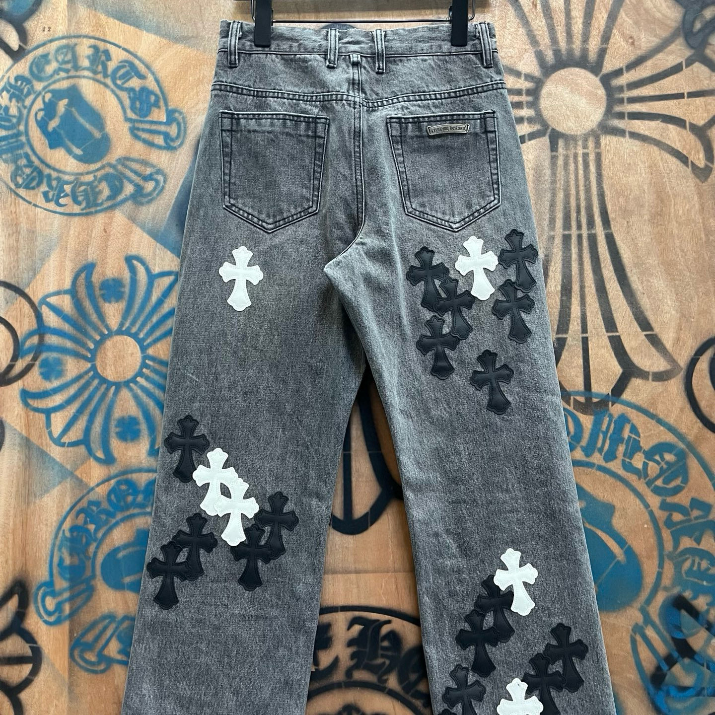 최고급 CH 크로 레미케이스 크로스 가죽 패치梵文 프린트 스트레이트 워싱 데님 팬츠 남녀공용 트렌디 스트레이트