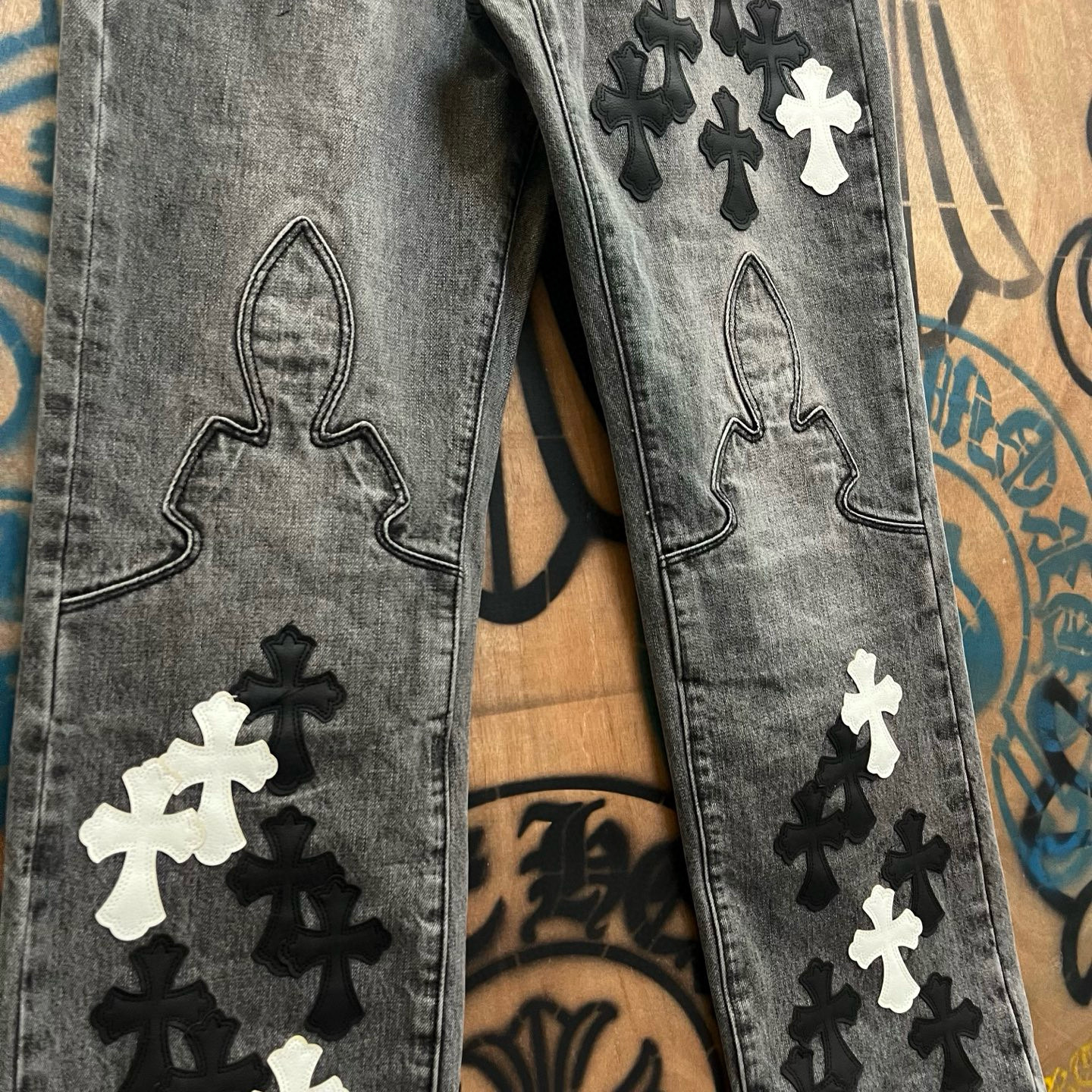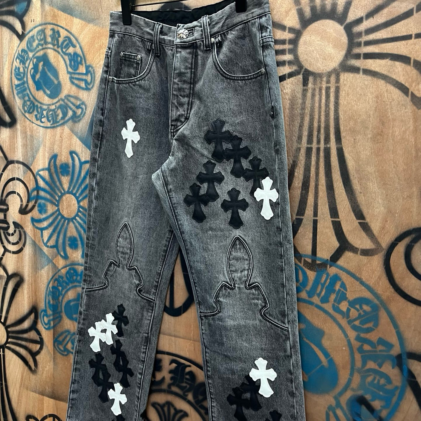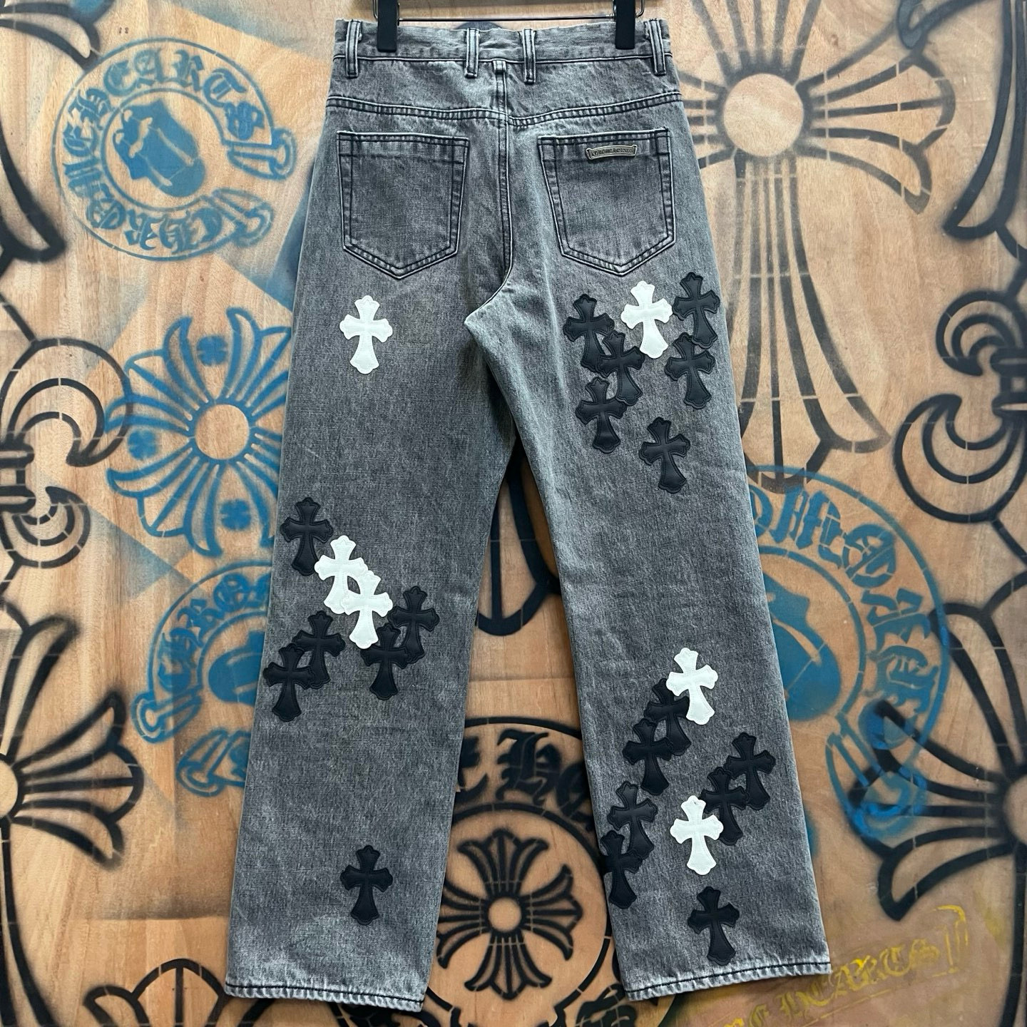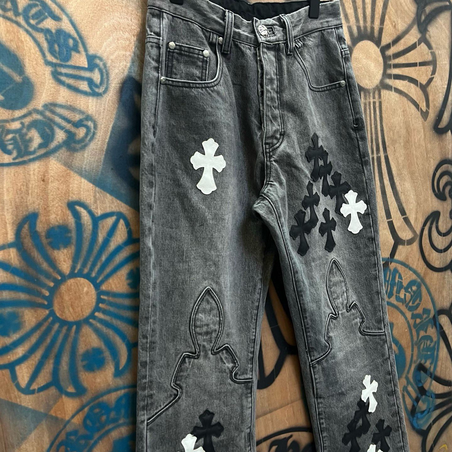 최고급 CH 크로 레미케이스 크로스 가죽 패치梵文 프린트 스트레이트 워싱 데님 팬츠 남녀공용 트렌디 스트레이트