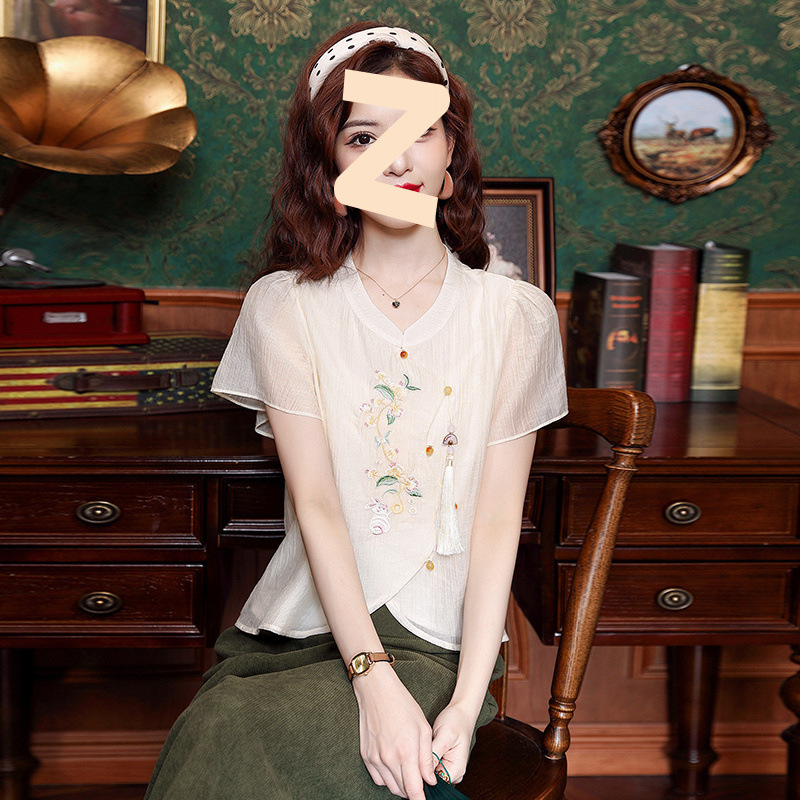 중국 스타일 자수 반팔 셔츠 여름 셔츠 2025 새로운 불규칙 버튼 탑 짧은 스타일스토어 가기