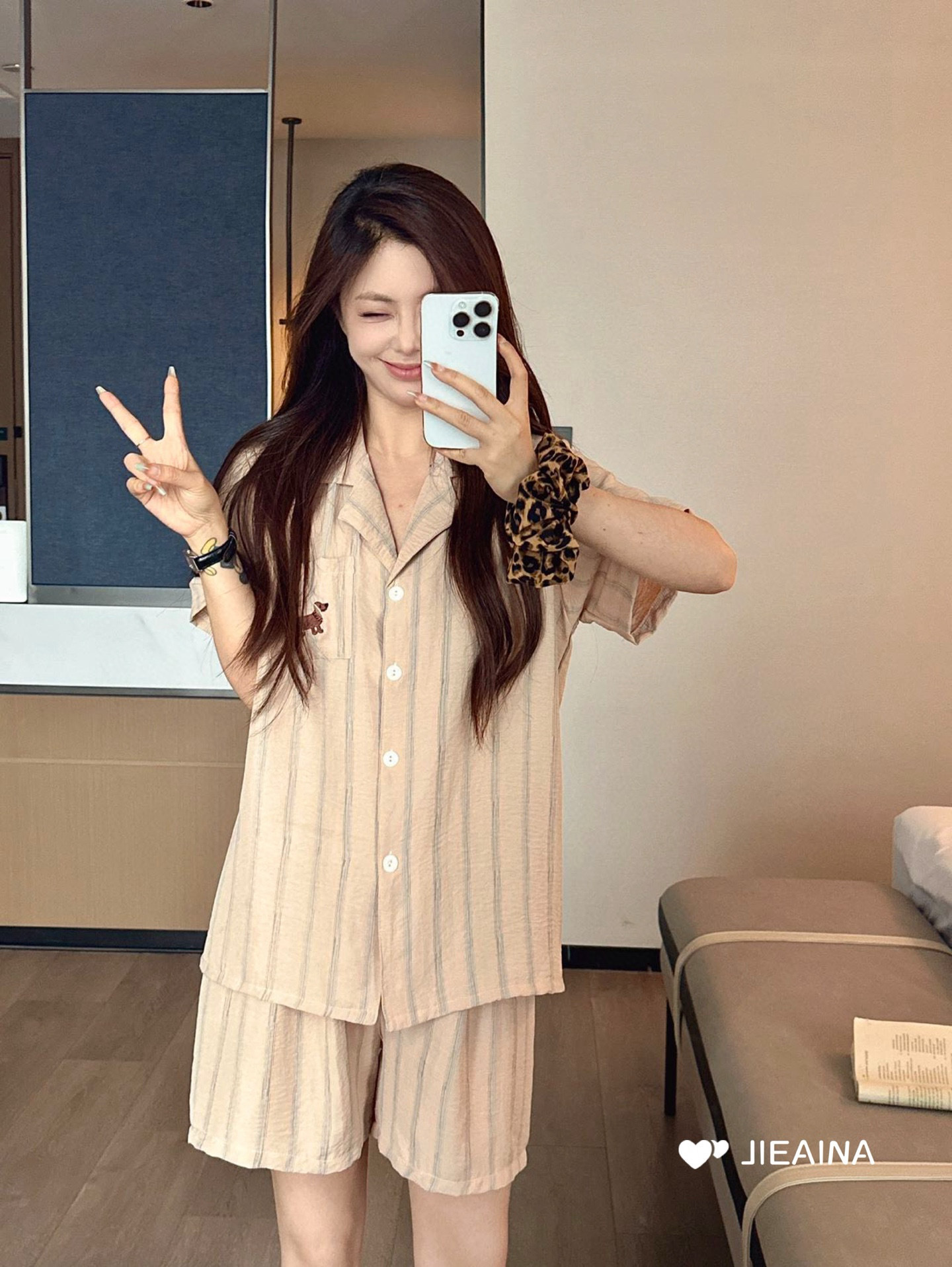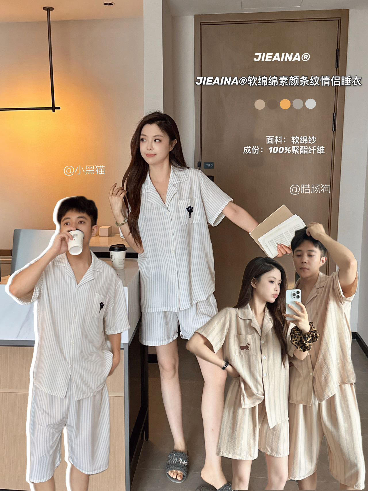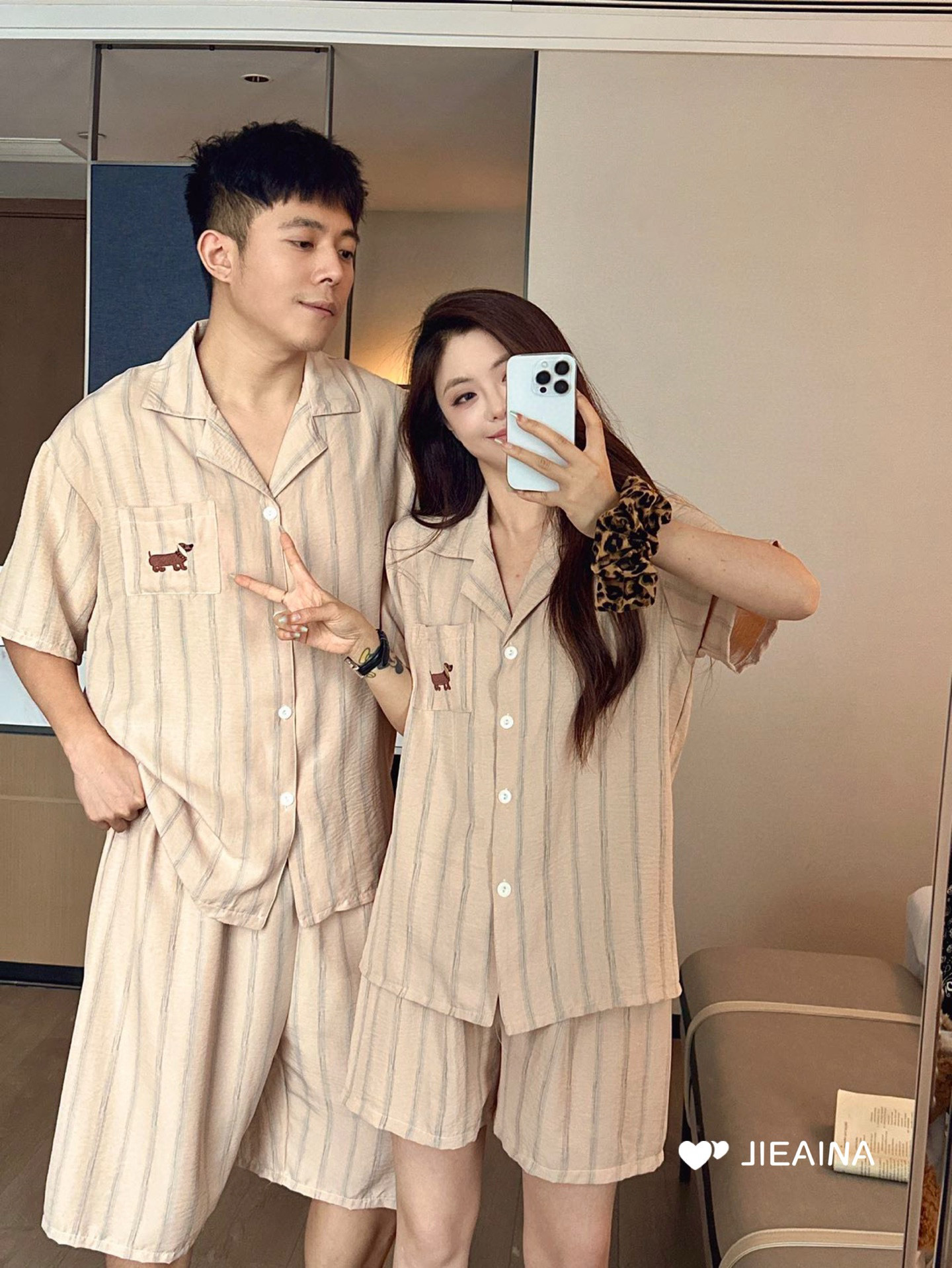 지에아이나 ® 부드러운 일반 줄무늬 커플 잠옷 여름 줄무늬 닥스훈트 반팔 잠옷 남성과 여성을위한