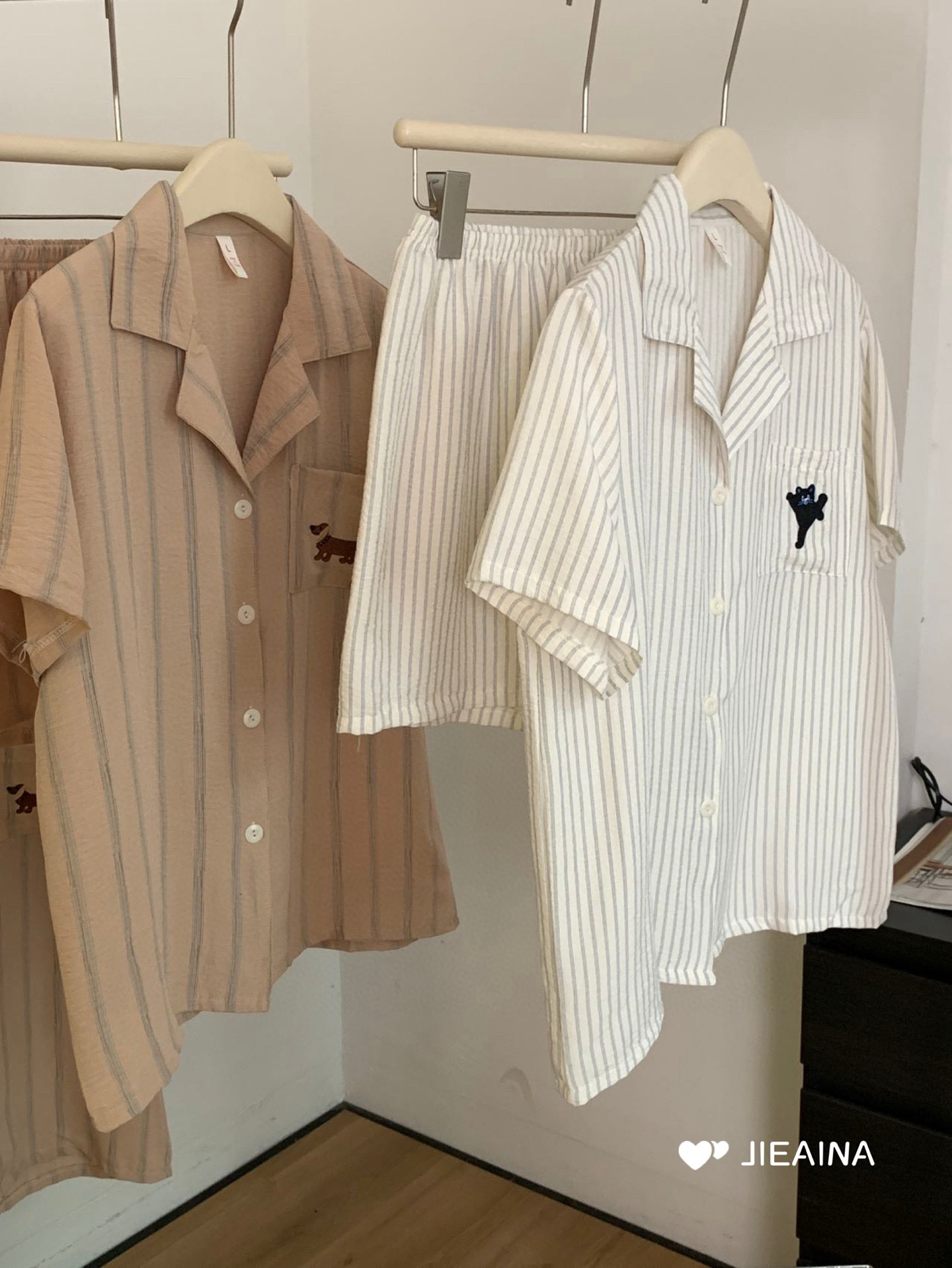 지에아이나 ® 부드러운 일반 줄무늬 커플 잠옷 여름 줄무늬 닥스훈트 반팔 잠옷 남성과 여성을위한스토어 가기