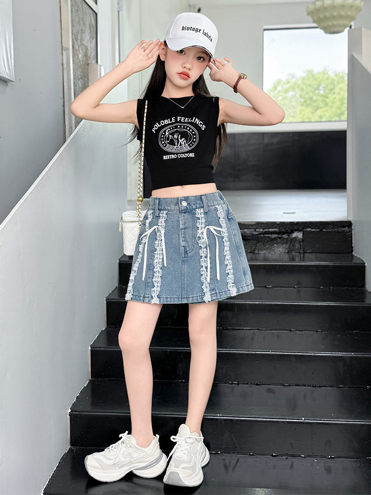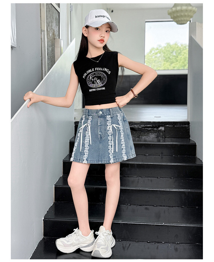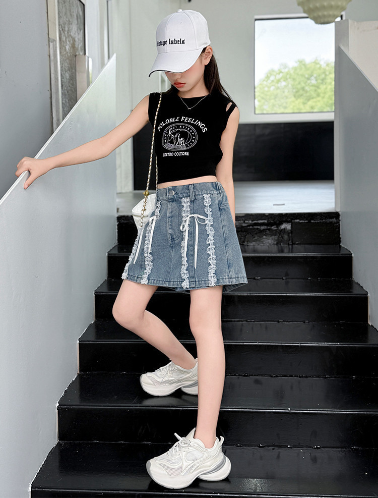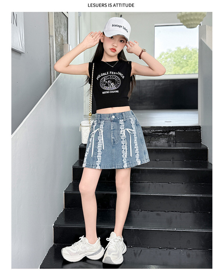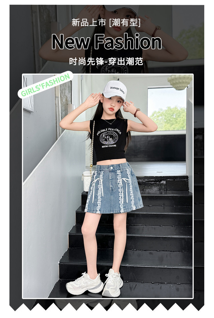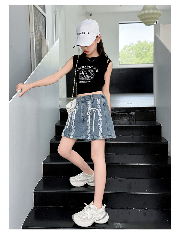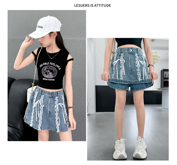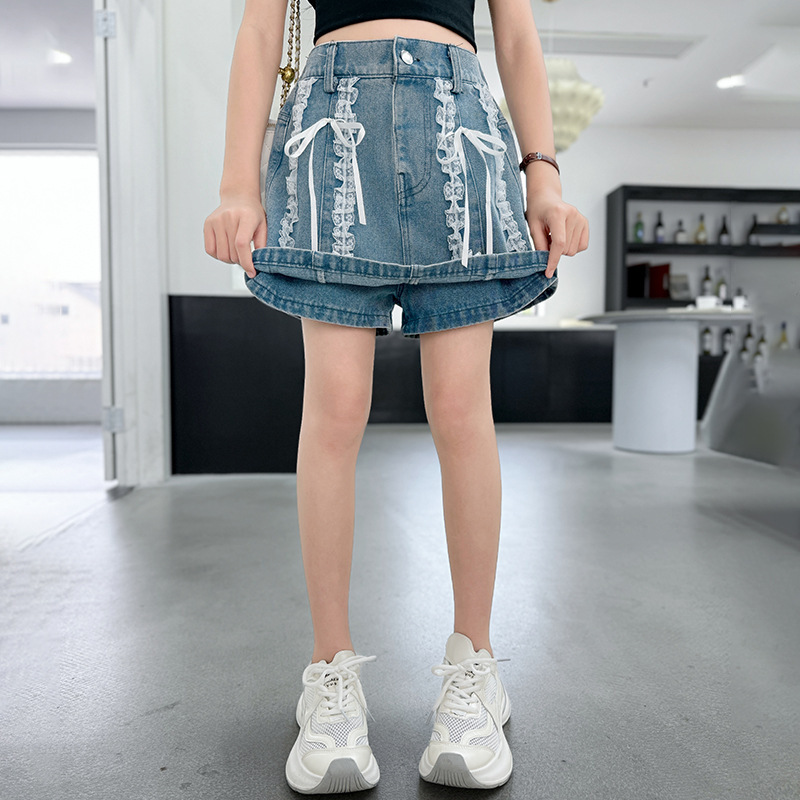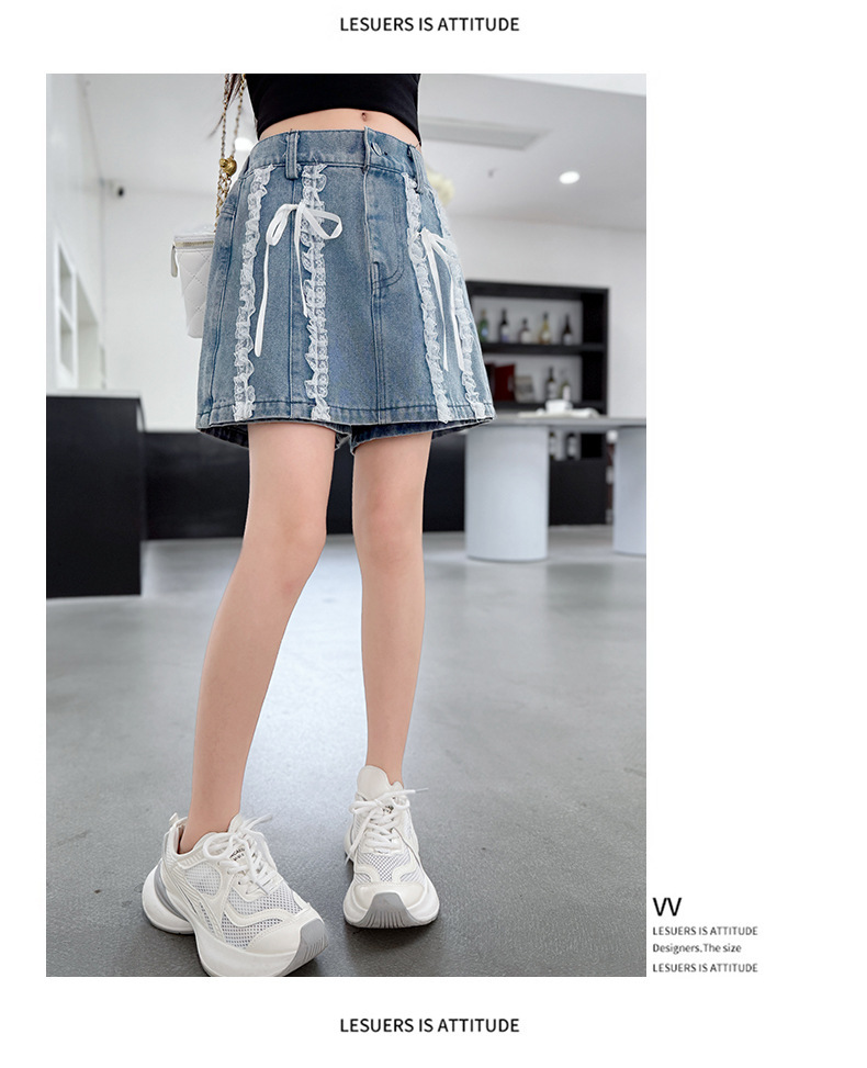 크로스보더 여아 여름 데님 스커트, 한국식 스위트 레이스 스커트, 중대형 아동 패션 다용도 반바지 스커트
