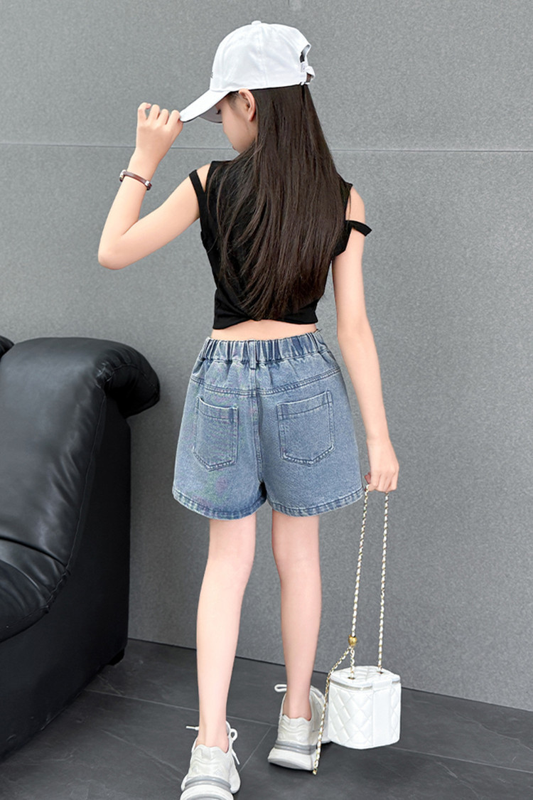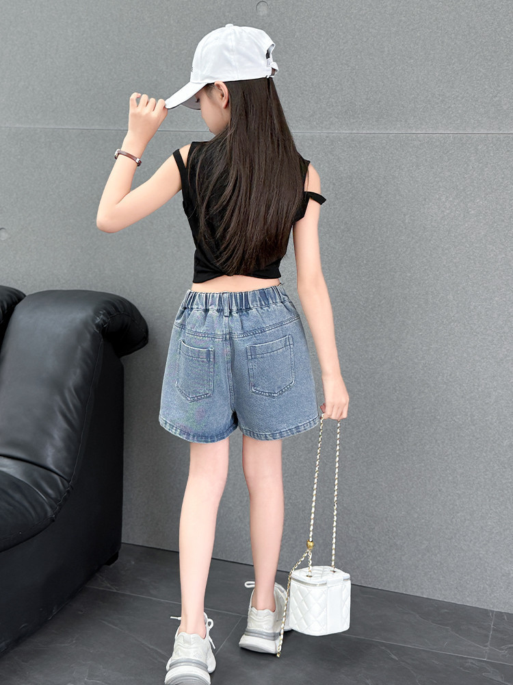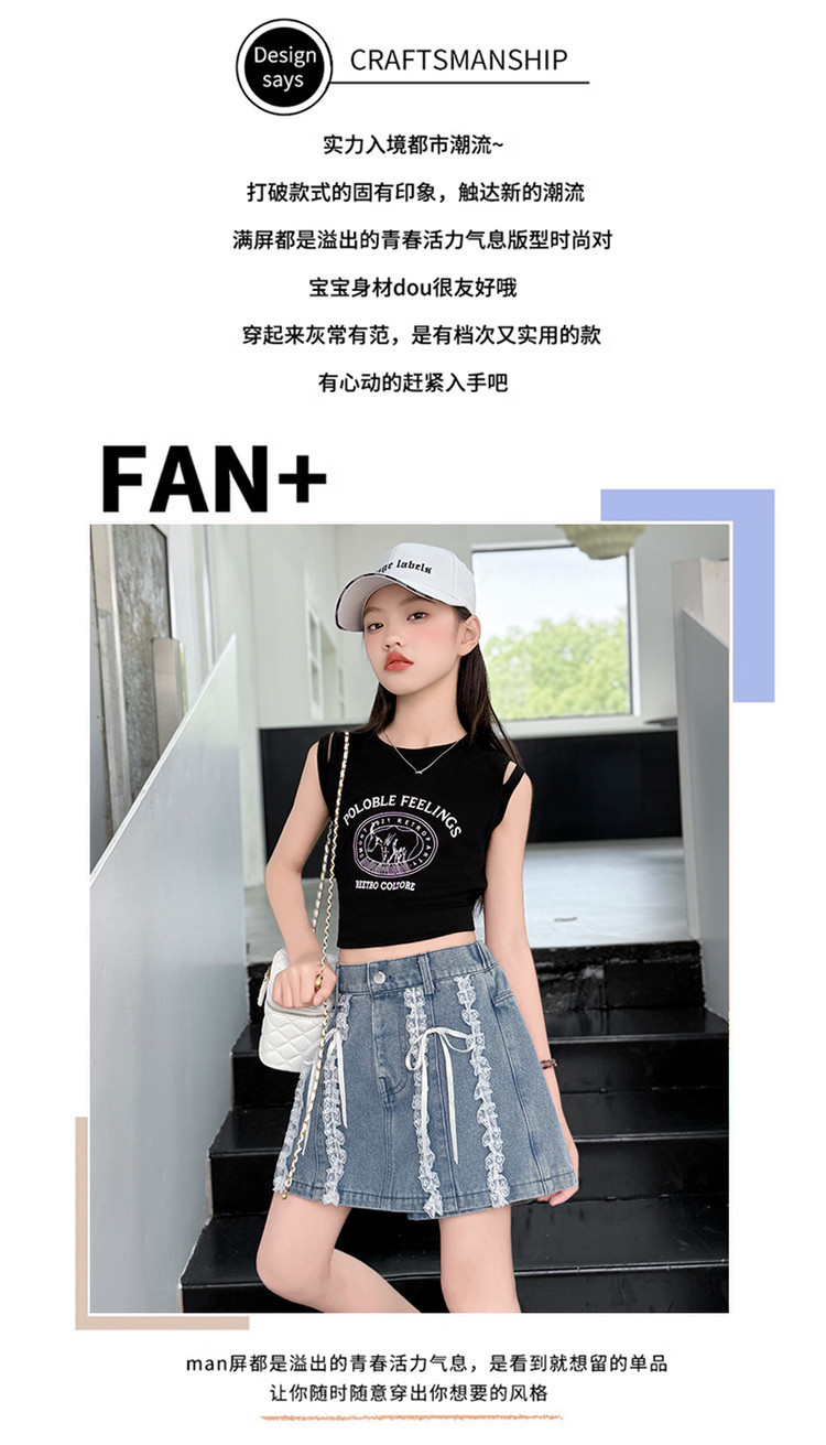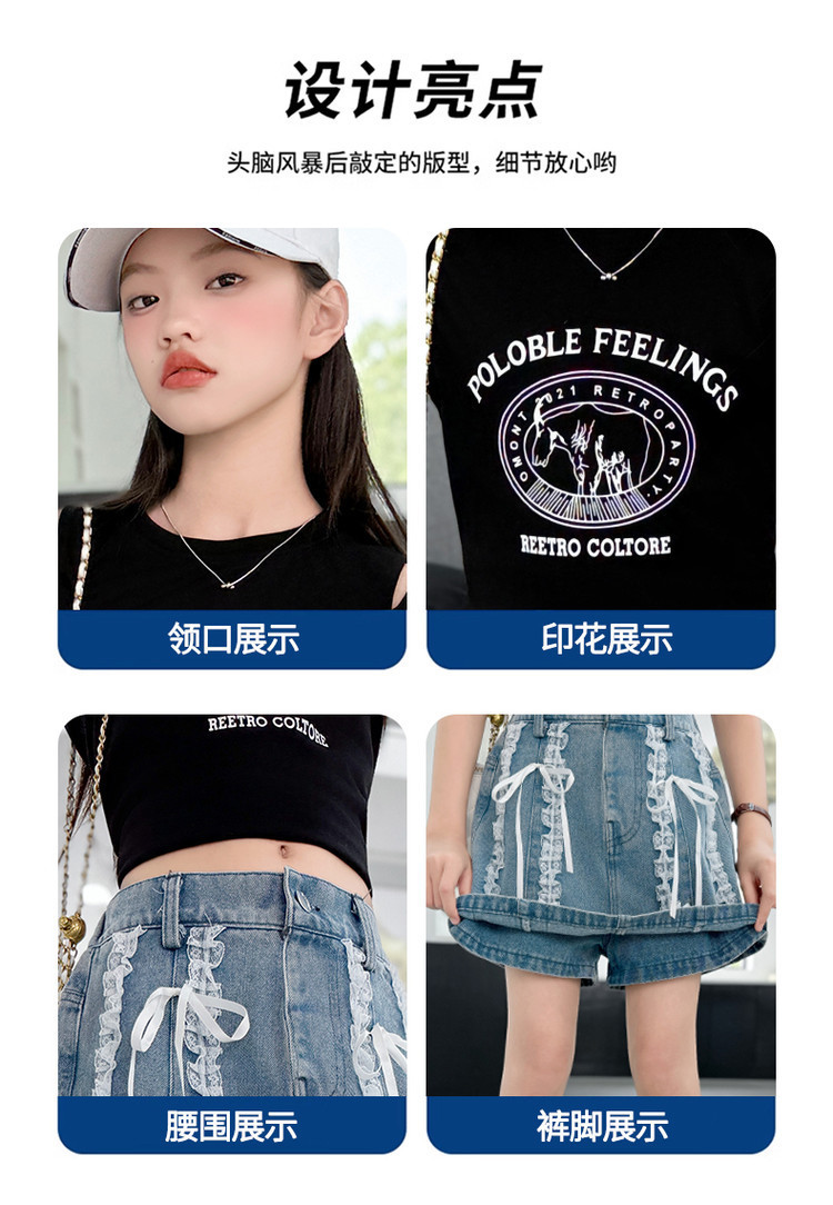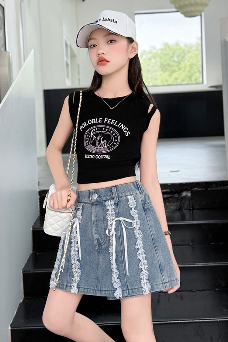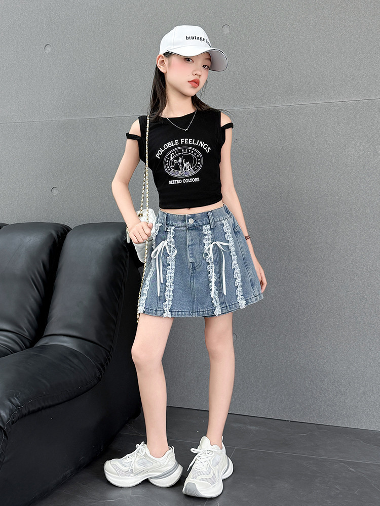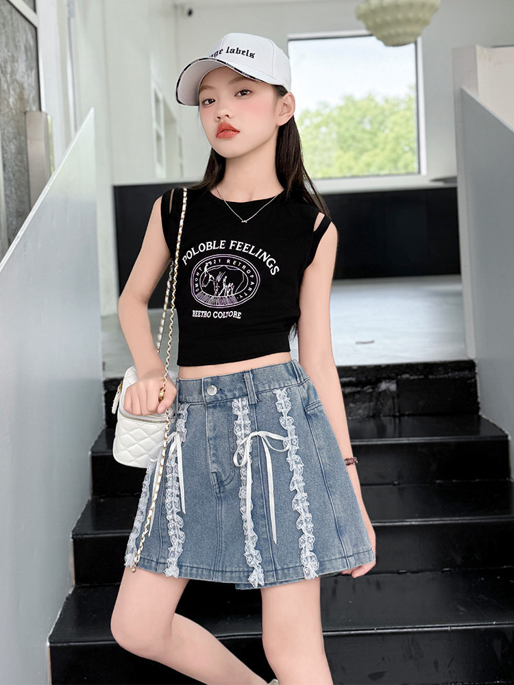 크로스보더 여아 여름 데님 스커트, 한국식 스위트 레이스 스커트, 중대형 아동 패션 다용도 반바지 스커트