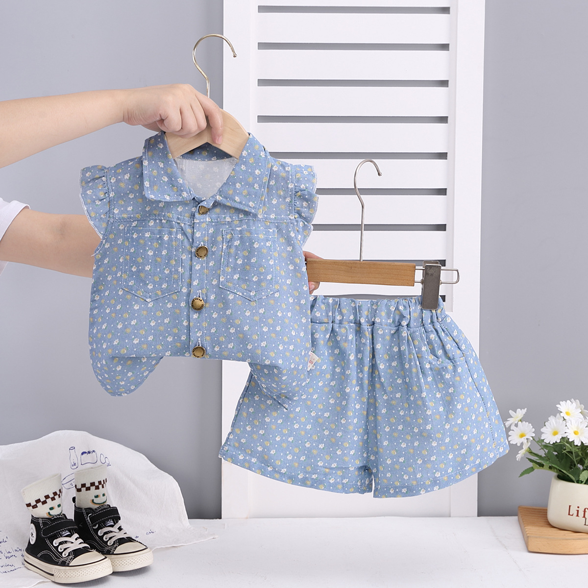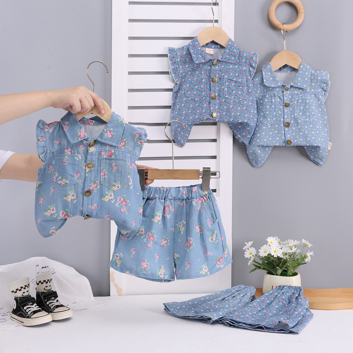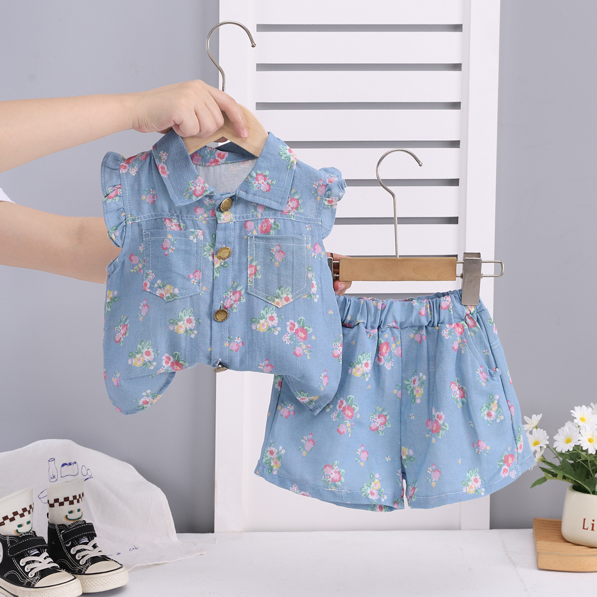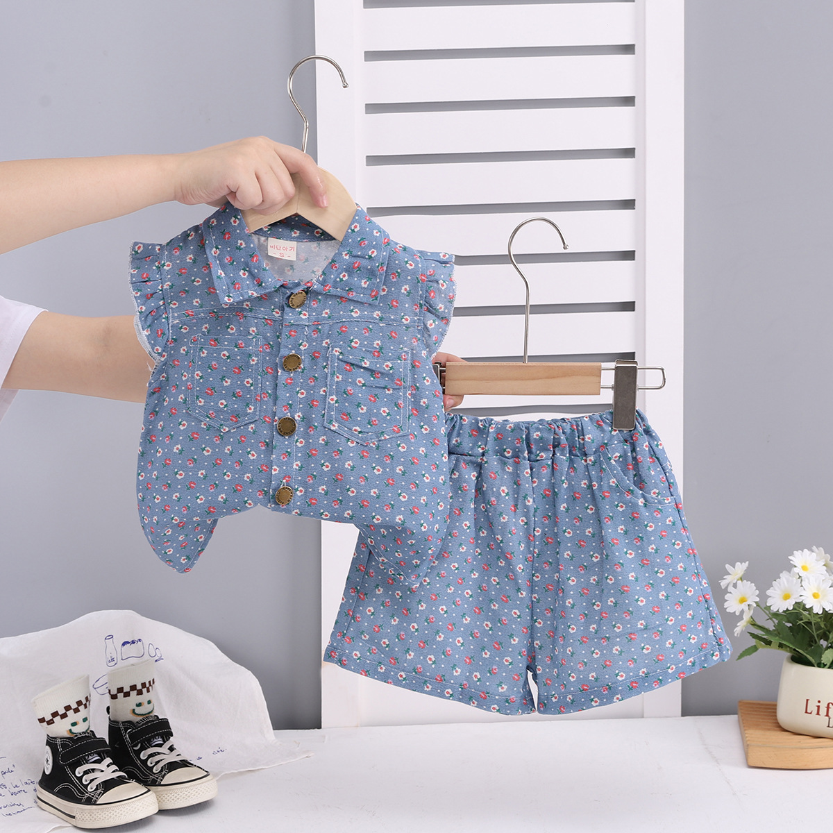 여아 정장 새로운 여름 옷 아동 여름 스타일 반팔 아기 소녀 얇은 꽃 무늬 모조 데님 투피스 세트