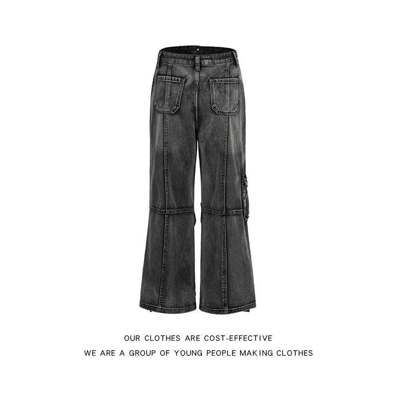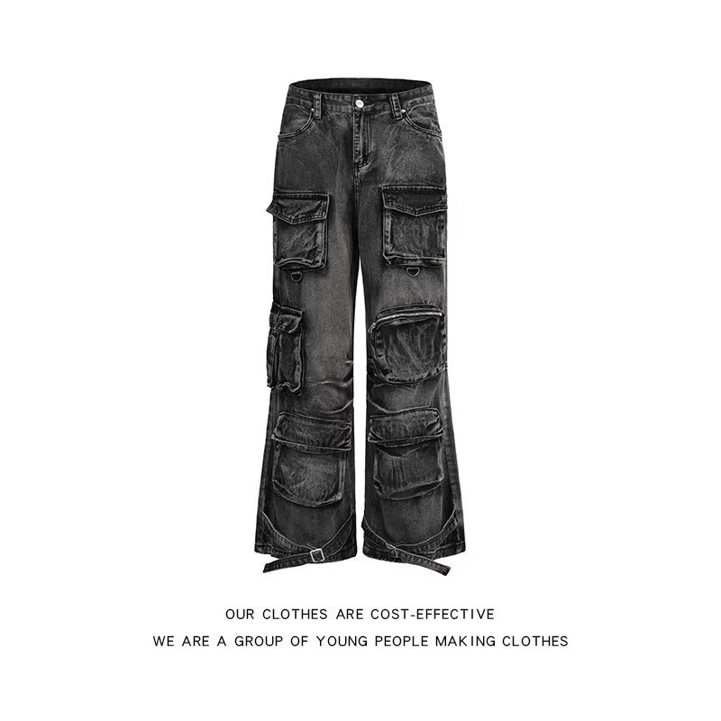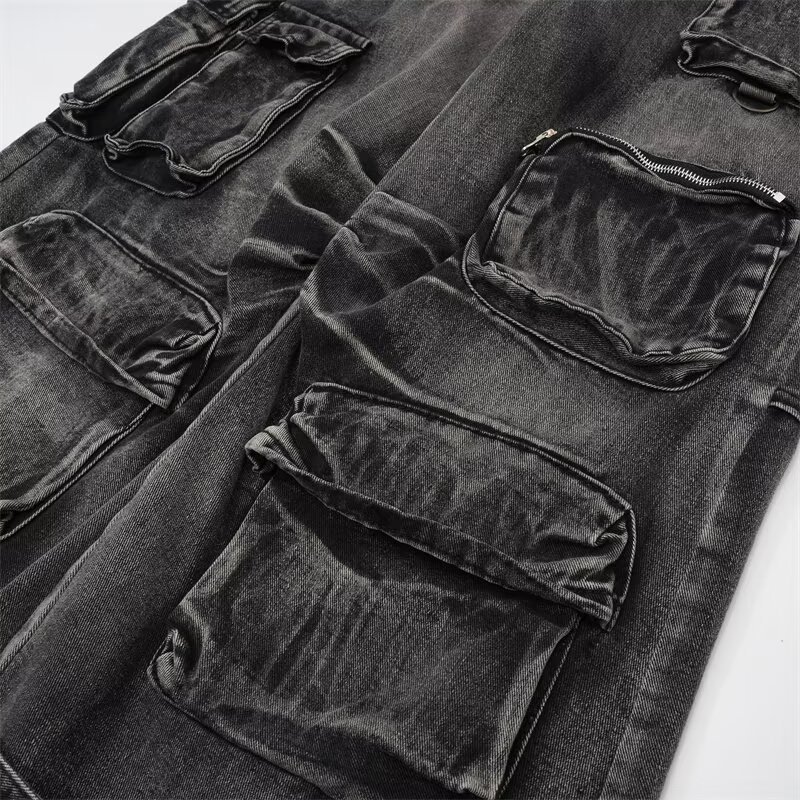 아메리칸 워싱 및 디스트레스드 멀티 포켓 워크 청바지 남성 트렌디 브랜드 펑크 디자인 맞춤형 기능성 와이드 팬츠