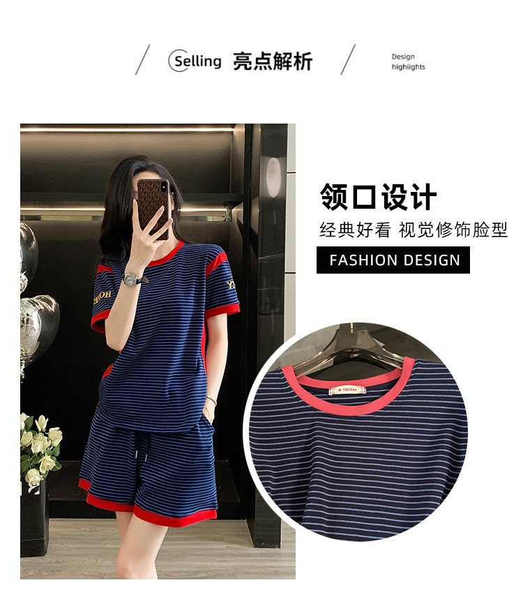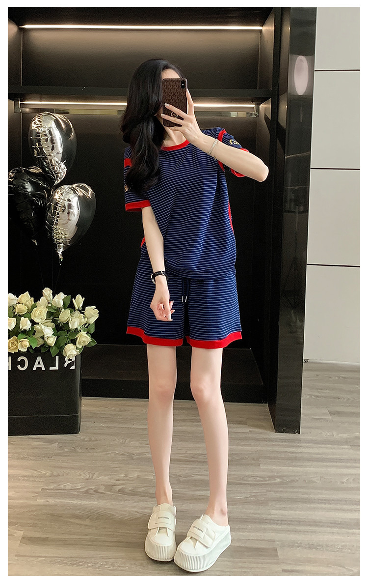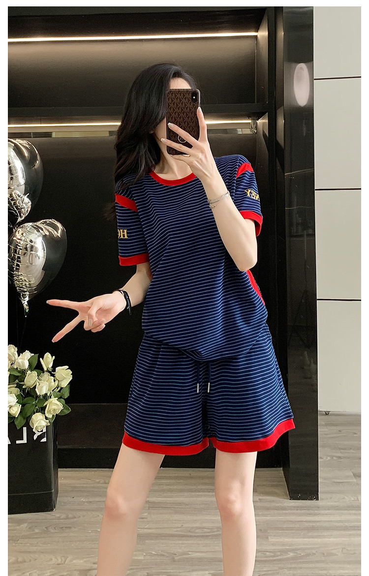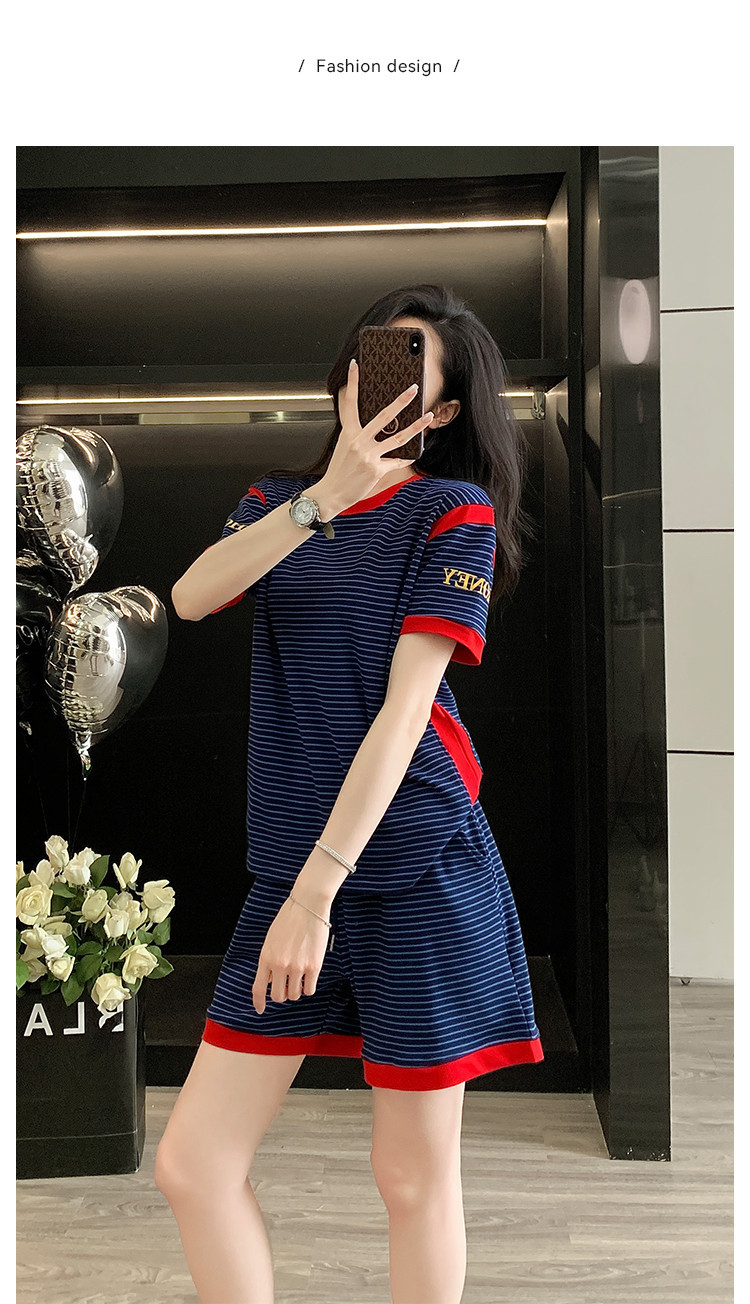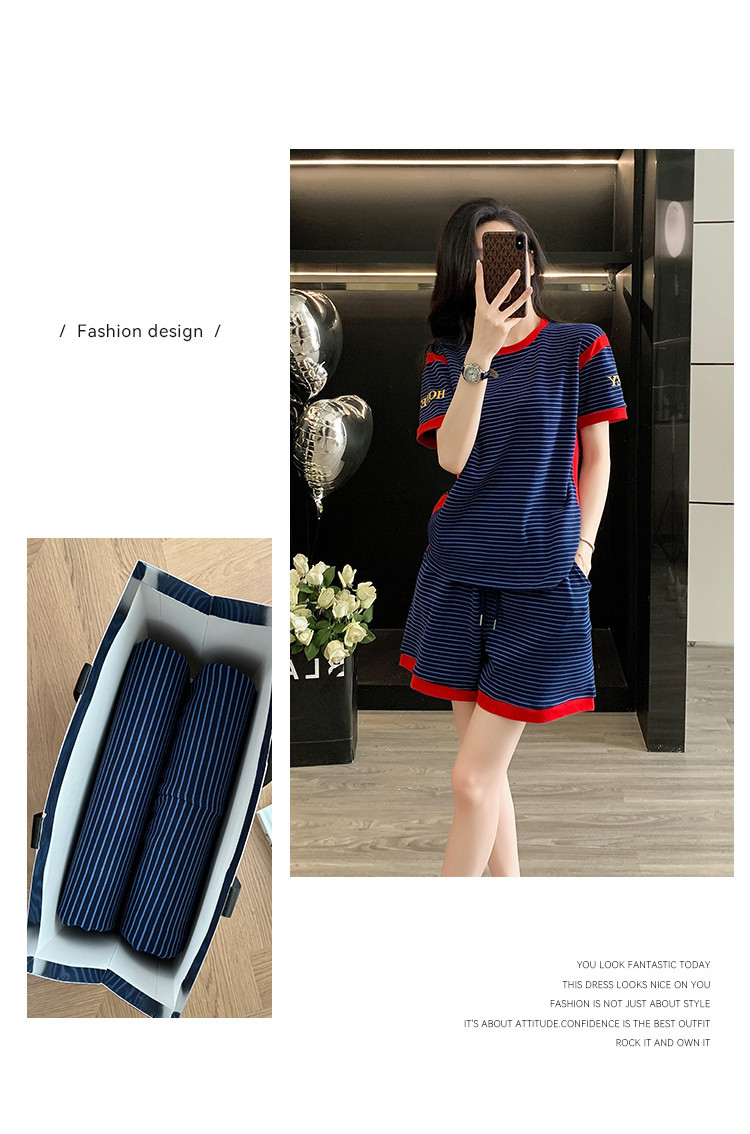 여성을위한 느슨한 한국 스타일 캐주얼 스포츠 정장 여성을위한 새로운 여름 패션 연령 감소 줄무늬 반팔 반바지 투피스 세트스토어 가기
