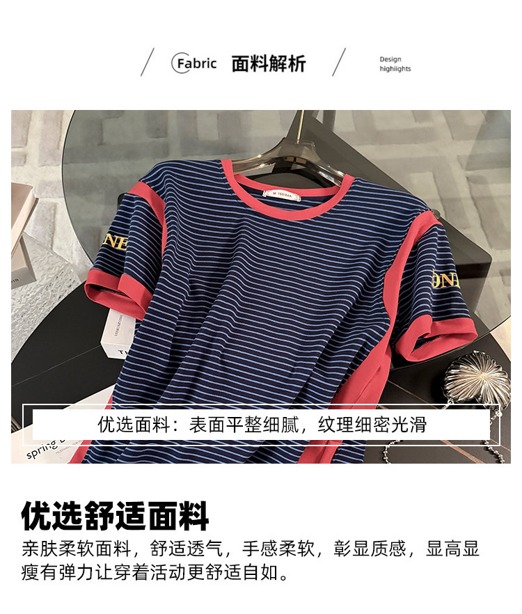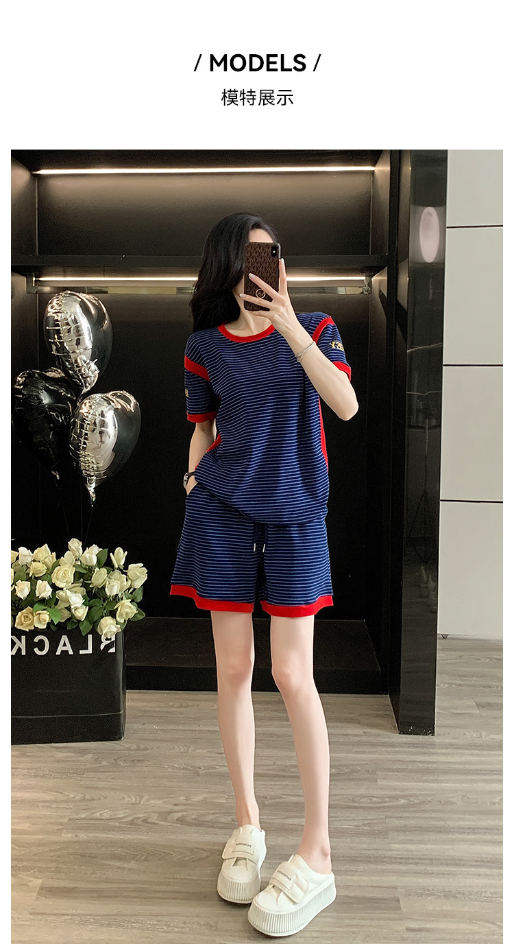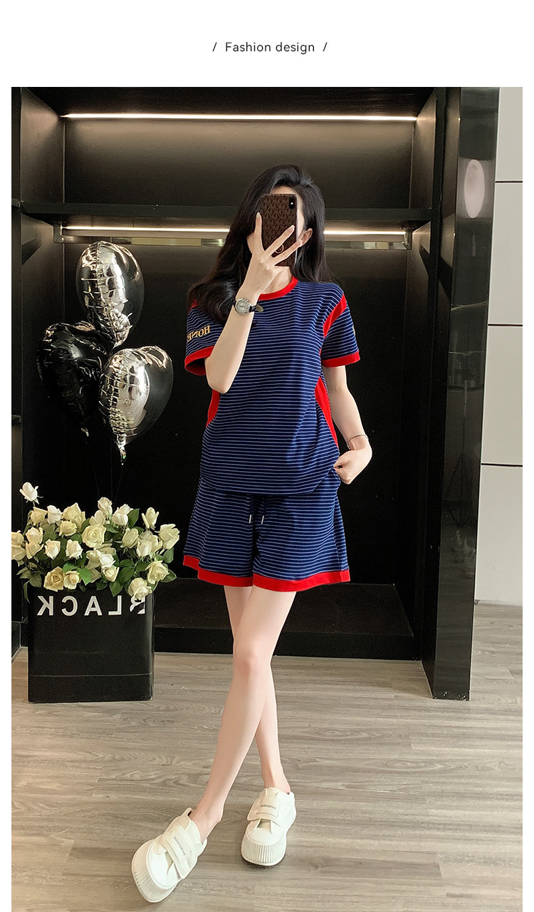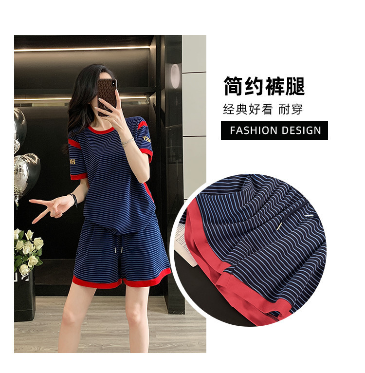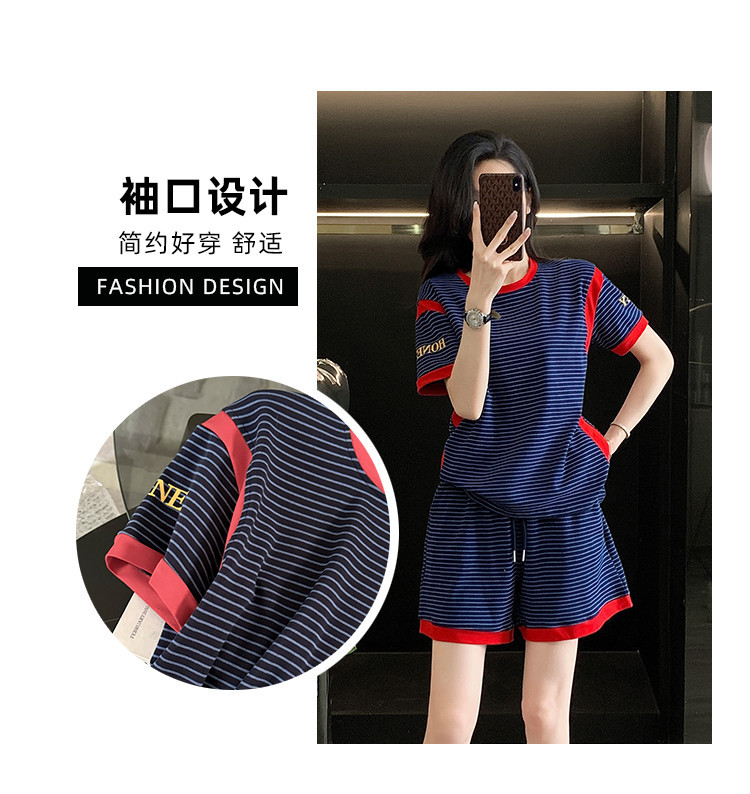 여성을위한 느슨한 한국 스타일 캐주얼 스포츠 정장 여성을위한 새로운 여름 패션 연령 감소 줄무늬 반팔 반바지 투피스 세트스토어 가기