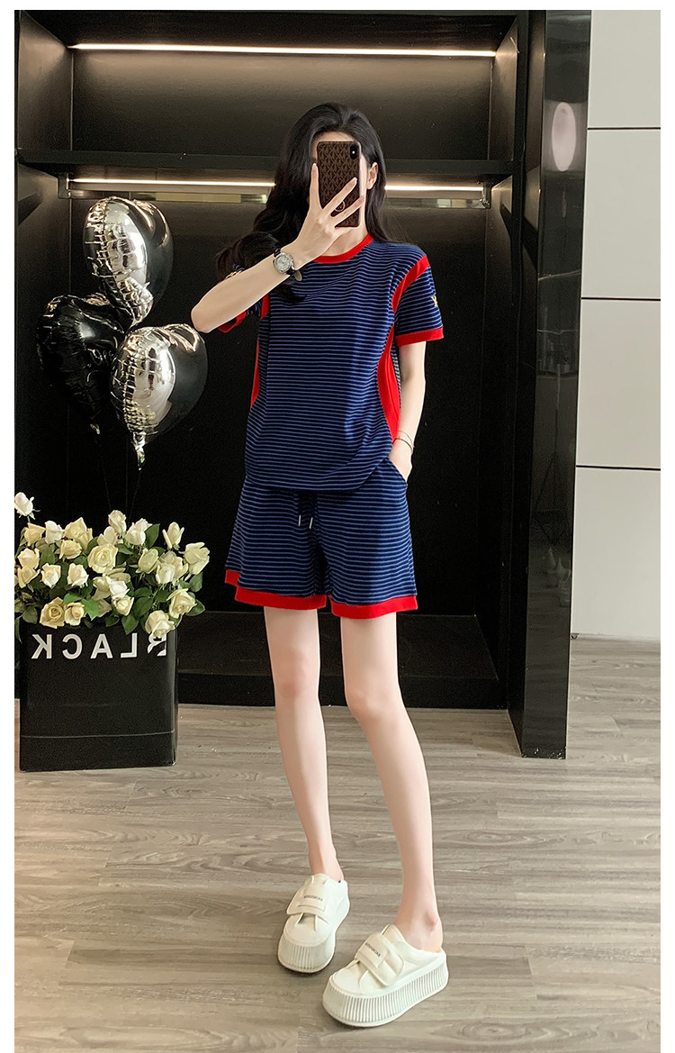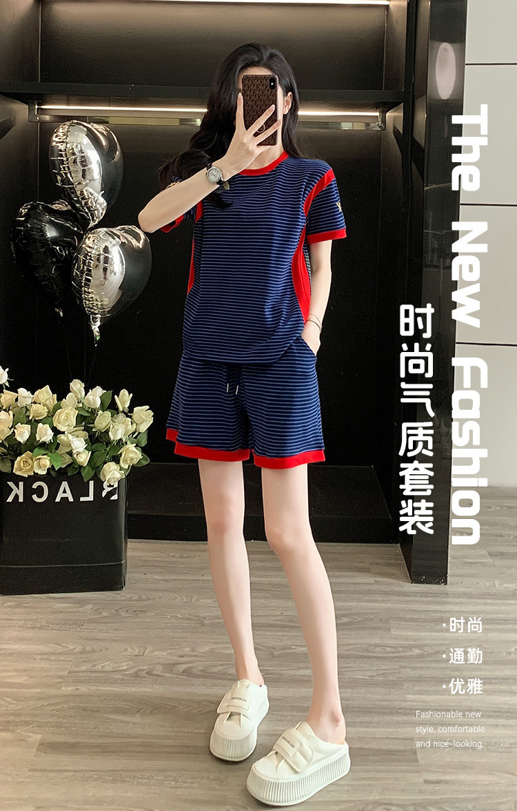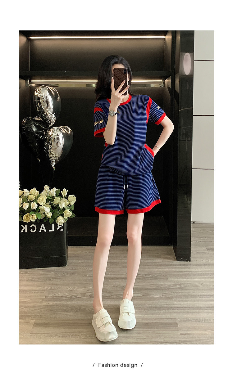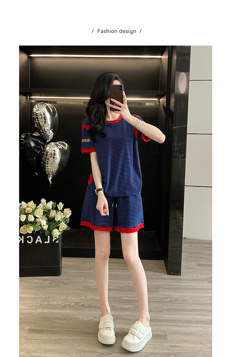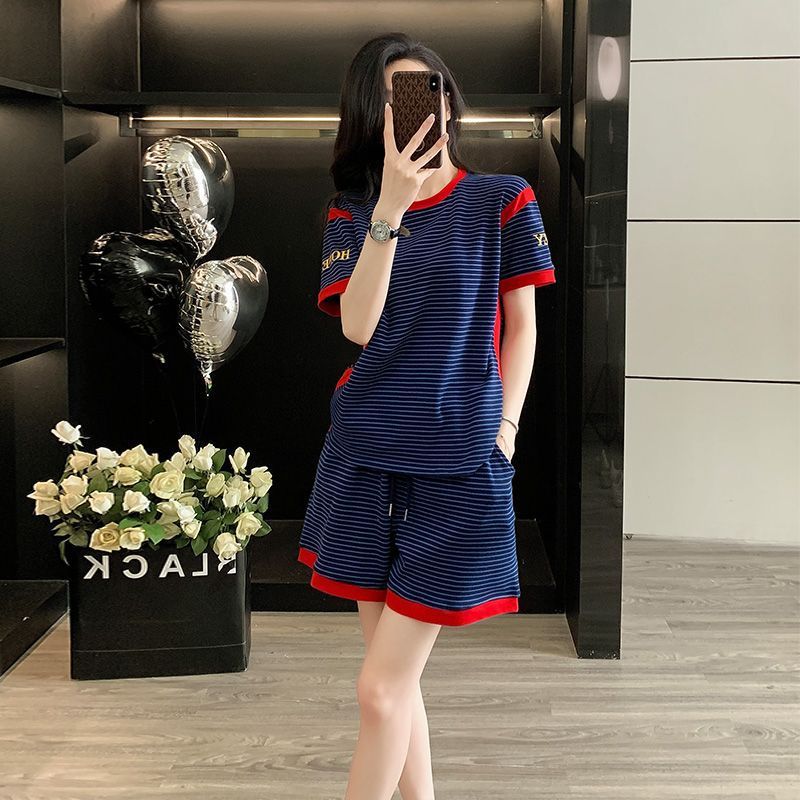 여성을위한 느슨한 한국 스타일 캐주얼 스포츠 정장 여성을위한 새로운 여름 패션 연령 감소 줄무늬 반팔 반바지 투피스 세트