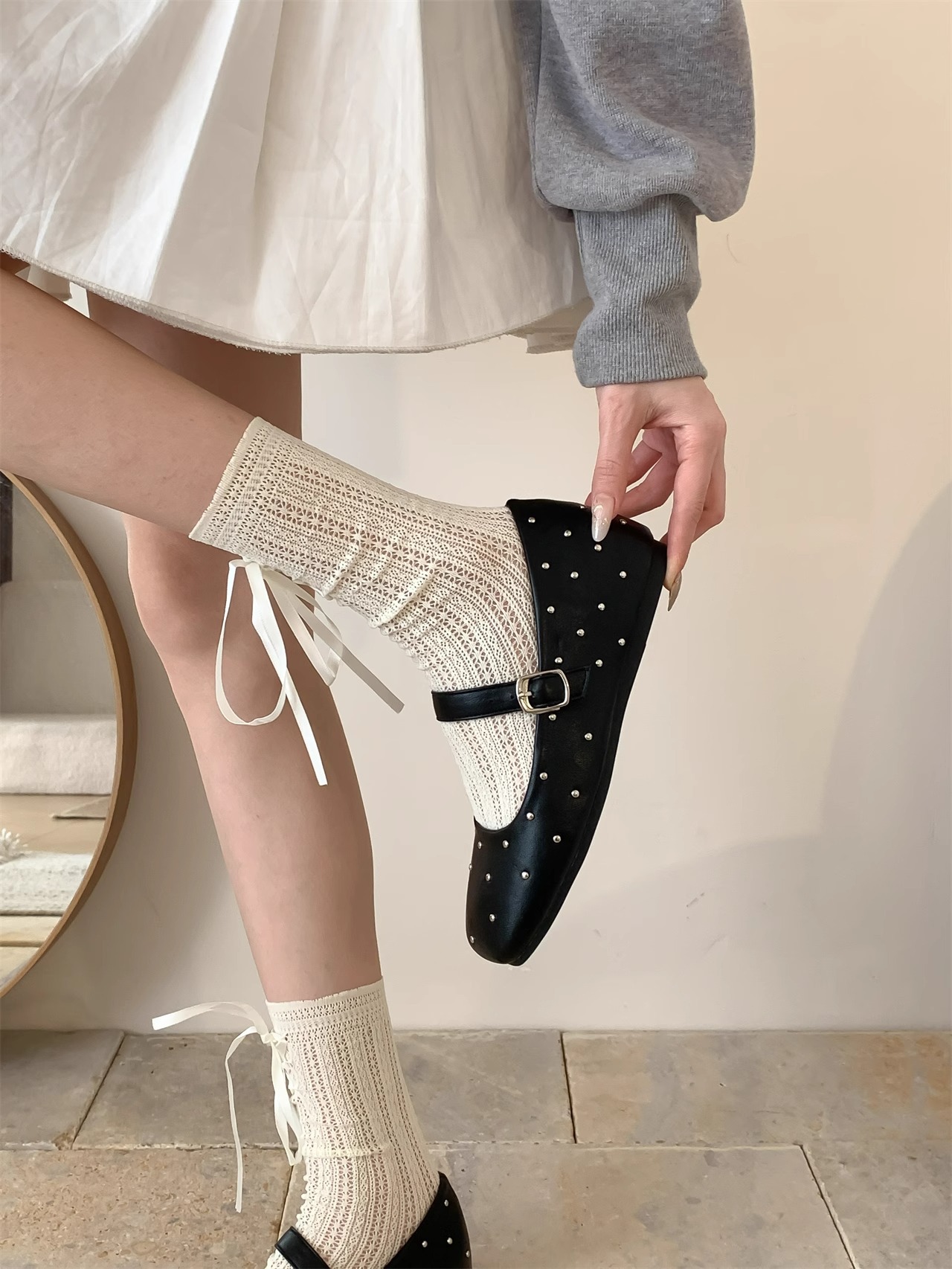 여성을위한 리벳 레드 메리 제인 신발 2025 봄 새로운 스타일 스퀘어 토 펌프 플랫 플랫 스트랩 작은 가죽 신발