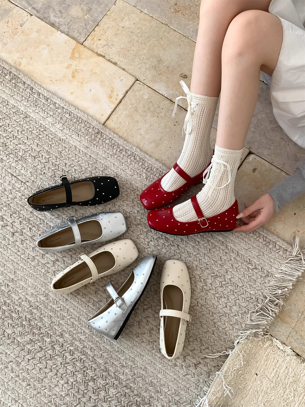 여성을위한 리벳 레드 메리 제인 신발 2025 봄 새로운 스타일 스퀘어 토 펌프 플랫 플랫 스트랩 작은 가죽 신발스토어 가기