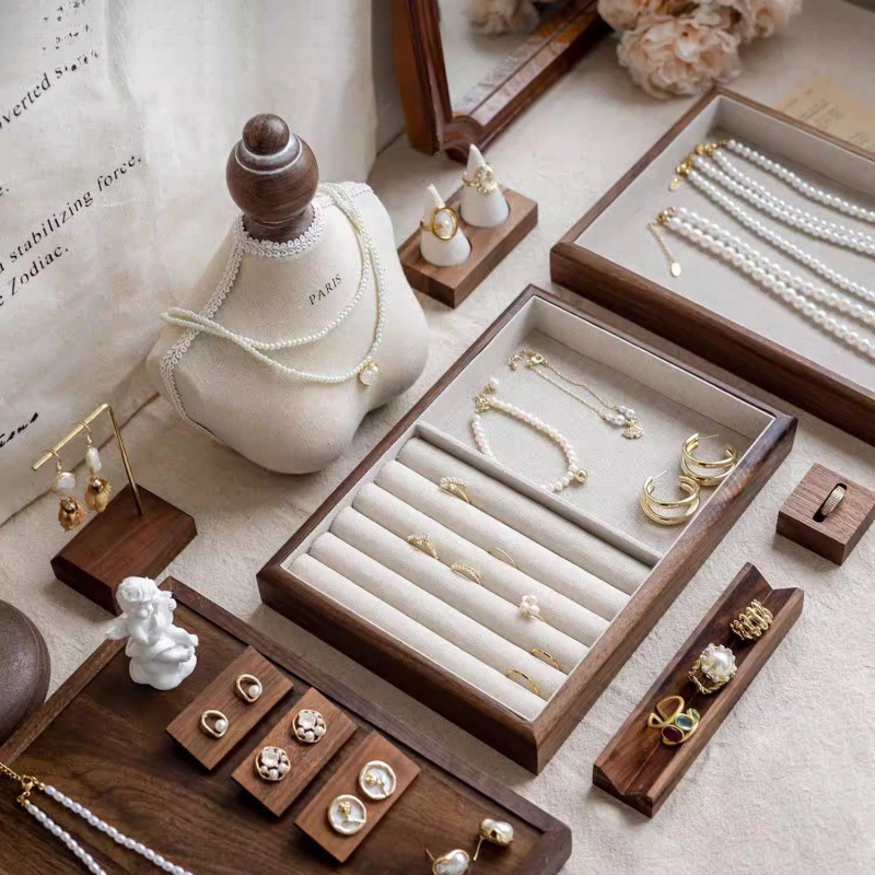 보석 트레이 디스플레이 트레이 검은 호두 리넨 트레이 보석 귀걸이 반지 보관함스토어 가기