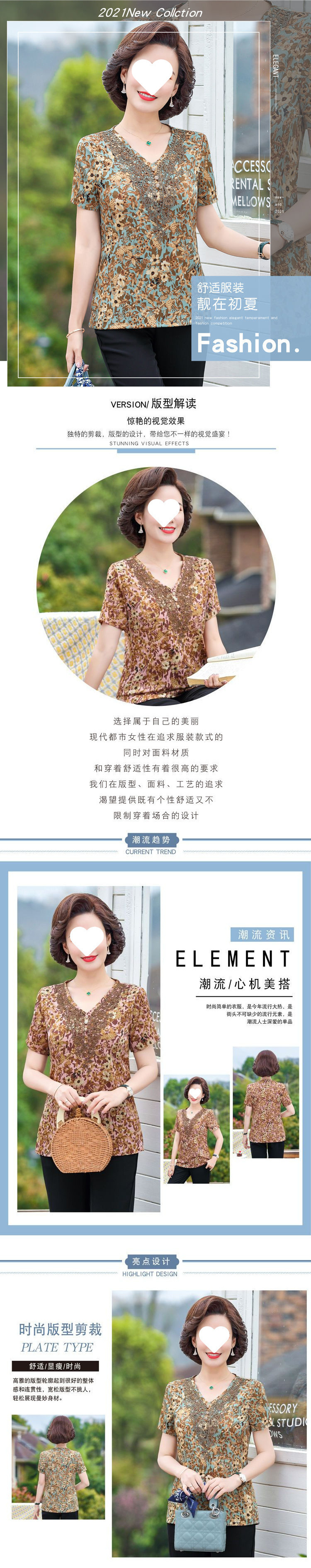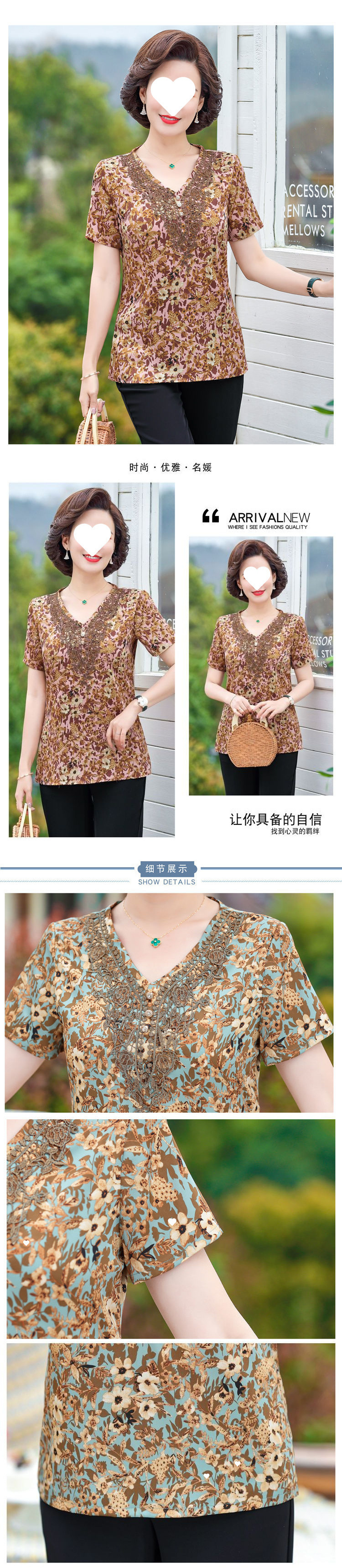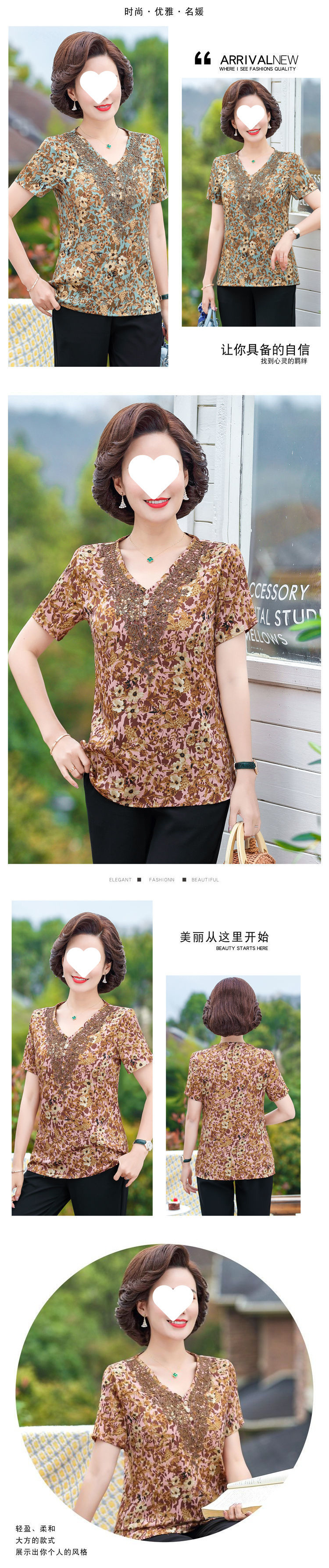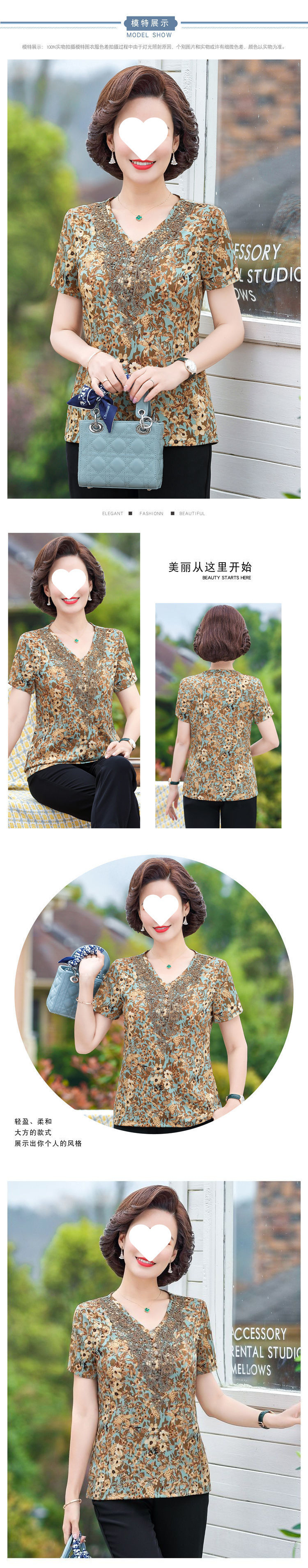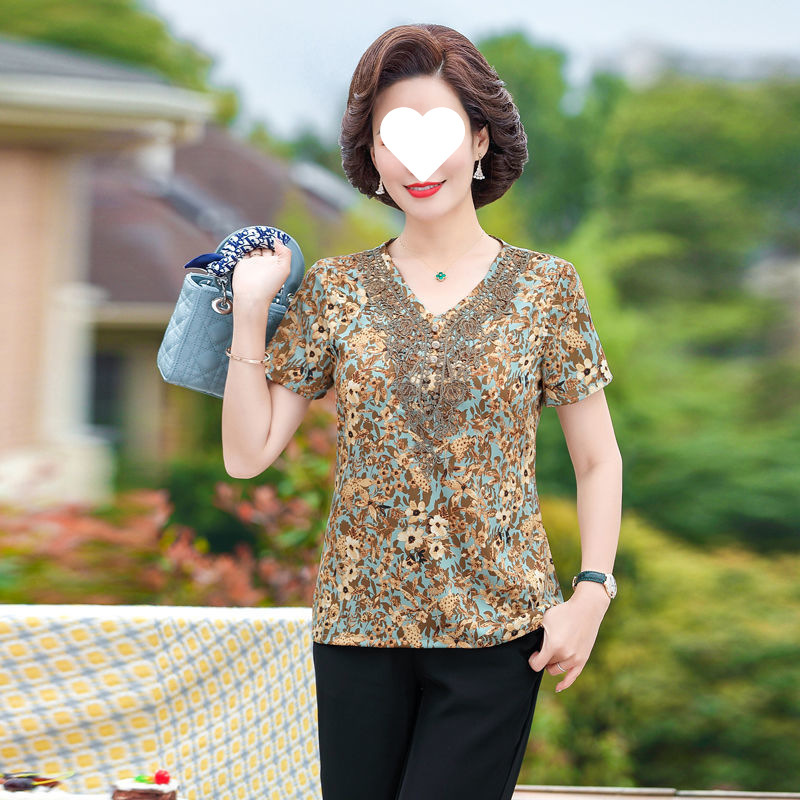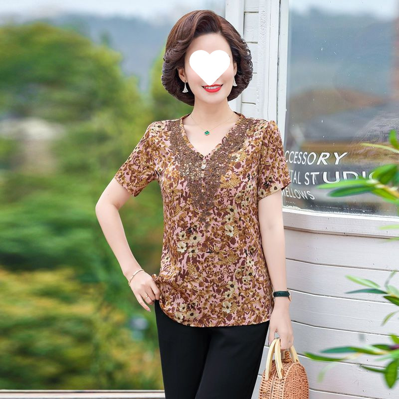 중년 엄마 배를 덮는 쉬폰 셔츠 여성 2025 신작 반팔 티셔츠 캐주얼 탑 브이넥 고급 서양식 셔츠스토어 가기