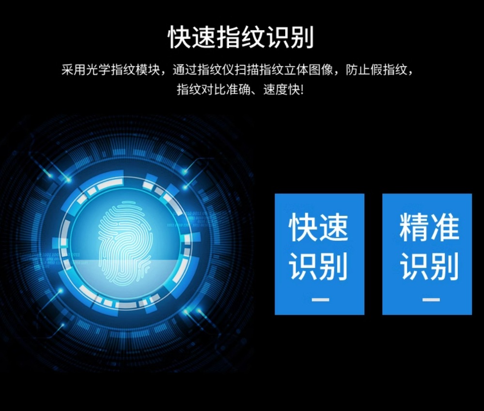 1. 采用光学式指纹感应模组,耐用且防刮,采集速度快。