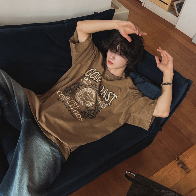 MYQ 레트로 스타일 올드 프린트 반팔 티셔츠 남성 여름 루즈 라운드 넥 탑 한국 통근 순수 코튼 반팔스토어 가기